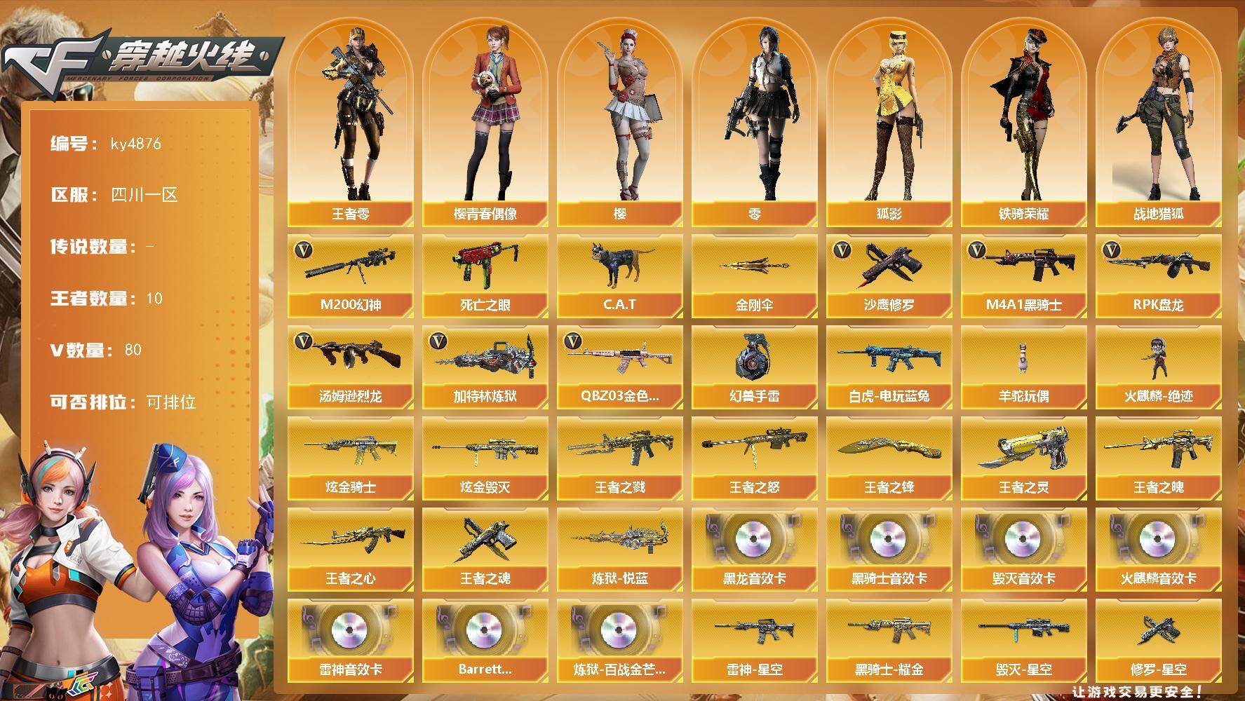 [17256523]四川一区-80V-10王者-5炫金 【热门武器】:QBZ03-金色蔷薇,M200-幻神,死亡之眼,白虎-电玩蓝兔,C.A.T,M4A1-黑骑士,汤姆逊-烈龙*7,RPK-盘龙*6,加特林-炼狱,羊驼玩偶,火麒麟-绝迹,沙鹰-修罗*6,金刚伞,高爆手雷-幻兽 【王者炫金武器】:王者之戮,王者之魄,王者之心,王者之怒,炼狱-悦蓝*3,王者之灵,王者之魂,王者之锋,炫金骑士,炫金毁灭*4 【音效卡】:AK47-火麒麟音效卡,M4A1-雷神音效卡,M4A1-黑龙音效卡,M4A1-黑骑士音效卡,Barrett-毁灭音效卡,Barrett-碧霄极光音效卡,炼狱-百战金芒-庆典舞曲音效卡 【皮肤】:雷神-暗月,雷神-能量核心,雷神-星空,M4A1-再燃火线,火麒麟-雷神,毁灭-暗月*3,毁灭-星空,毁灭-冠军之怒,毁灭-英雄计划 皮肤,黑龙-能量核心,黑龙-暗月,黑骑士-暗月*3,黑骑士耀金皮肤,无影-暗月,无影-能量核心,天启-暗月,天龙-秘银,天龙-能量核心,AWM-天龙-传奇70KG,AWM-天龙-传奇白鲨,极光-能量核心,炼狱-月 皮肤,修罗-能量核心*2,修罗-星空,天神-暗月*2,轻型军用手斧-再燃火线 【角色】:零,樱,战地猎狐,王者-零,狐影,雪域霜狐,娟娟,灵狐者-黄金海岸,潘多拉-甜心教官,铁骑荣耀,兔囡囡,樱-青春偶像,影武者-X 【人偶武器】:火麒麟-绝迹,天龙-曼陀罗,迷你钢铁终结者,COP-旗袍,C.A.T,迷你牛牛,迷你生化手雷,深渊终结者手雷 【暴走生化】:死亡之眼,超级对讲机 【挑战大师】:致命乱世-超越Max,神圣爆裂者III,AK47-冰龙粉碎者,激光毁灭者III,神圣爆裂者-末日III,阐释者III 【英雄级武器】:M4A1-千变,AK47-火麒麟*5,M4A1-黑龙,M4A1-雷神*3,M4A1-黑骑士,AK47-无影,M4A1-死神,AK47-黑武士*2,AK12-天启,M4A1-武圣,M4A1-龙血,M4A1-玫瑰精灵,QBZ03-金色蔷薇,白虎-电玩蓝兔,AWM-天龙,Barrett-毁灭*3,Barrett-极光*2,AWM-裁决,M200-幻神,RPK-盘龙*6,加特林-炼狱,炼狱-百战金芒,汤姆逊-烈龙*7,AA-12-雷霆,沙鹰-修罗*6,沙鹰-天神*2,沙鹰-幻兽,屠龙*3,龙啸,擎天,麒麟刺*2,女皇利刃-幻兽,麒麟刺