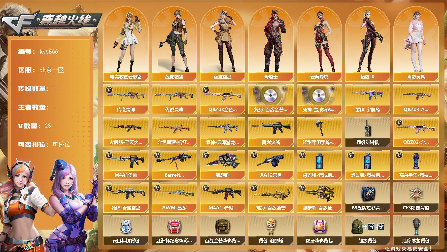 [17256606]北京一区-22V-0王者武器数-0炫金武器数 【传说武器】:传说灵眸 【热门武器】:传说灵眸,QBZ03-金色蔷薇 【音效卡】:炼狱-百战金芒-庆典舞曲音效卡,死神-雪域霜狐-怀旧音效卡 【皮肤】:QBZ03-AG-CFPLS19冠军,金色蔷薇-纸灯龙皮肤,雷神-宇航兔皮肤,雷神-云海游龙皮肤,M4A1-再燃火线,火麒麟-平天大圣,轻型军用手斧-再燃火线 【角色】:电竞教官-云悠悠,战地猎狐,雪域霜狐,修道士,云海玲珑,暗夜-X,初恋灵狐,电竞少女,芳心审判者,飞虎队-X,娟娟,猎狐者-追月,0号玩家,灵狐-花神,灵狐者-X,龙儿,曼陀罗-X,蛇姬,兔囡囡,新娜塔莎,游珑儿 【暴走生化】:超级对讲机 【英雄级武器】:M4A1-雷神,死神-雪域霜狐,QBZ03-金色蔷薇,Barrett-毁灭,炼狱-百战金芒,AA-12-雷霆,麒麟刺,麒麟刺-百战金芒,高爆手雷-竞技荣光,闪光弹-竞技荣光,烟雾弹-竞技荣光,M4A1-赤狱骑士,AWM-昌龙 【道具】:BS战队炫彩背包,CFS限定背包,云山科技背包,亚洲杯纪念炫彩背包,百战金芒炫彩背包,背包-洛丽塔,虎牙炫彩背包,超级背包,迷你冰龙背包,雪域霜狐炫彩背包,女皇终结者-魔龙之吻,救世主-黑桃战神,绿色巨人,灵魂忍者*2,变异宝贝,迷雾幽灵*2,生化弹匣,夺命之镰,防化服*3,金色流光-枪王排位,星辰流光-枪王排位,流光-鎏金之域,流光-再燃火线,枪王排位28赛季金色流光,枪王排位29赛季金色流光,语音特效-盛典烟火,语音特效-怀旧,雪域霜狐表情,萌萌小葵表情,EP战队击杀图标,防弹头盔*3,防弹衣*3,C4工具钳*3,手雷包*3 【特殊枪械】: