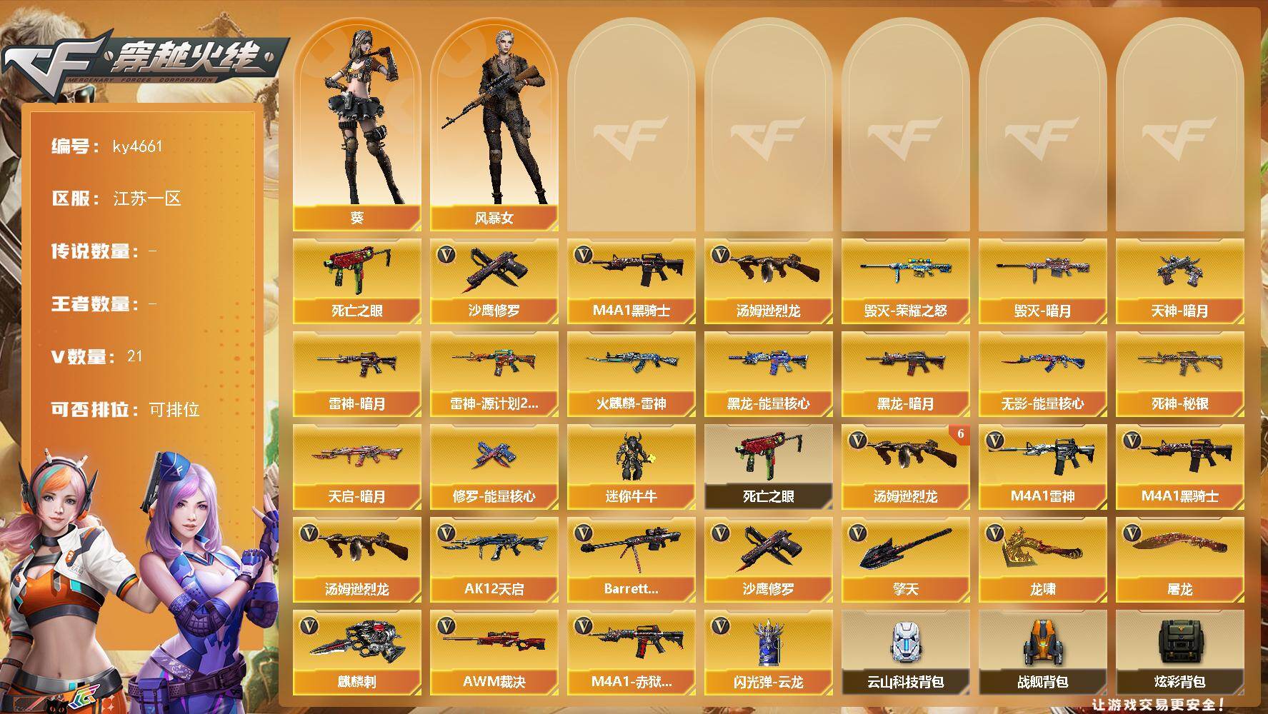 [17256664]江苏一区-21V-0王者-0炫金 【热门武器】:死亡之眼,M4A1-黑骑士,汤姆逊-烈龙*6,沙鹰-修罗*4 【皮肤】:雷神-暗月,雷神-源计划2.0专属 皮肤,火麒麟-雷神,毁灭-暗月,毁灭-荣耀之怒,黑龙-能量核心,黑龙-暗月,无影-能量核心,死神-秘银,天启-暗月,修罗-能量核心,天神-暗月 【角色】:葵,风暴女 【人偶武器】:迷你牛牛 【暴走生化】:死亡之眼 【英雄级武器】:M4A1-雷神,M4A1-黑骑士,AK12-天启,Barrett-毁灭,AWM-裁决,汤姆逊-烈龙*6,沙鹰-修罗*4,屠龙,龙啸,擎天,麒麟刺,闪光弹-云龙,M4A1-赤狱骑士 【道具】:云山科技背包,战舰背包,炫彩背包,绿色巨人,灵魂忍者,变异宝贝,迷雾幽灵,夺命之镰,防化服*3,枪王排位28赛季金色流光,枪王排位29赛季金色流光,防弹头盔*3,防弹衣*3,C4工具钳*3,手雷包*3 【特殊枪械】:1黑骑士,6烈龙