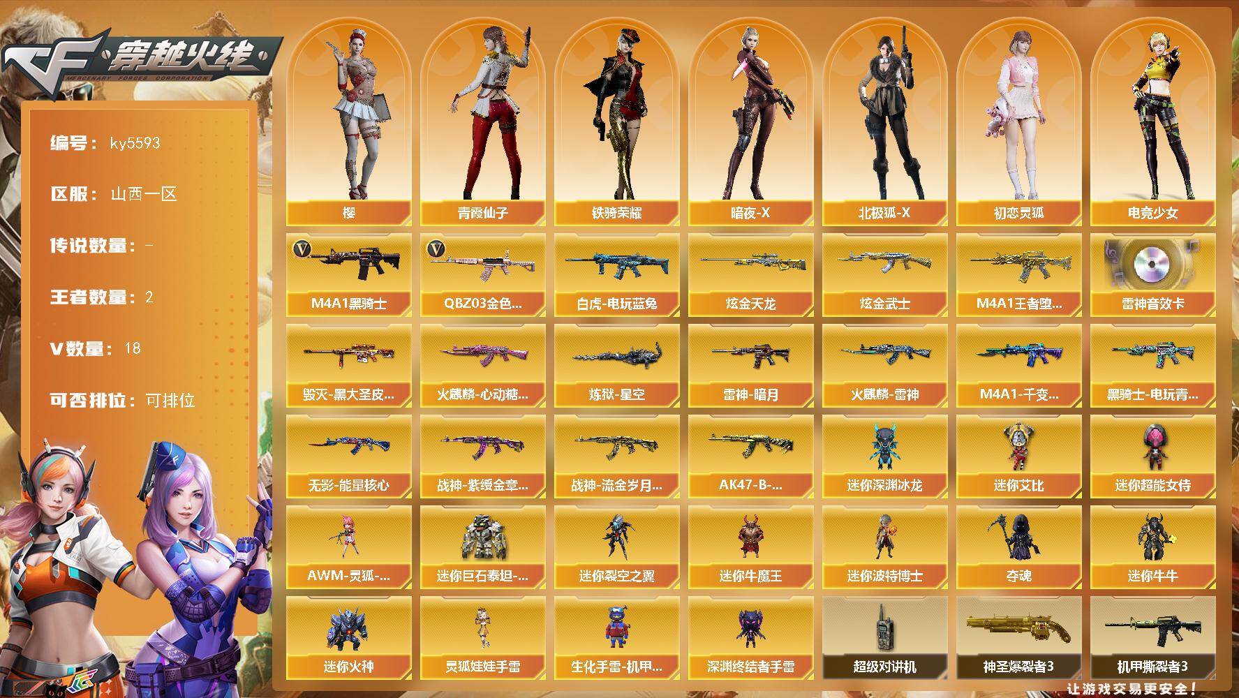[17256761]山西一区-19V-2王者武器数-2炫金武器数 【热门武器】:QBZ03-金色蔷薇,白虎-电玩蓝兔,M4A1-黑骑士 【王者炫金武器】:M4A1-王者堕天神,炫金武士,炫金天龙 【音效卡】:M4A1-雷神音效卡 【皮肤】:雷神-暗月,火麒麟-雷神,火麒麟-心动糖果,毁灭-黑大圣皮肤,M4A1-千变-孔明皮肤,黑骑士-电玩青兔皮肤,无影-能量核心,战神-紫绶金章皮肤*2,战神-流金岁月皮肤,AK47-B-常胜将军-孙权,炼狱-星空 【角色】:樱,暗夜-X,北极狐-X,初恋灵狐,电竞少女,芳心审判者,飞虎队-X,风暴女,虎妞,嘉年华灵狐,娟娟,猎狐者-追月,灵狐者-X,龙儿-小淘气,麻雀,曼陀罗-X,潘多拉-X,潘多拉-甜心教官,潜龙队-X,邱刚敖,青霞仙子,斯沃特-X,铁骑荣耀,兔囡囡,影武者-X,游珑儿 【人偶武器】:AWM-灵狐-15周年嘉年华,迷你深渊冰龙,迷你裂空之翼,迷你牛魔王,迷你波特博士,夺魂,迷你牛牛,迷你火种,生化手雷-机甲核心,深渊终结者手雷,迷你艾比,迷你超能女侍,迷你巨石泰坦-魔花研究所,灵狐娃娃手雷 【暴走生化】:超级对讲机 【挑战大师】:神圣爆裂者III,冰龙粉碎者-白马银枪,VEPR-12-金魔,机甲撕裂者III,试炼破坏者III,KAC-圣炎切割者III,神圣爆裂者-末日III,阐释者III 【英雄级武器】:AK47-火麒麟,M4A1-雷神*2,M4A1-黑骑士,无影-神兵利器,黑武士-锦绣游龙,QBZ03-金色蔷薇,王者之戮-觉醒版,AK-47-猩红传说,AK47-B-战神,黑骑士-海王*2,白虎-电玩蓝兔,天神-CF网剧冠军 【道具】:XROCK炫彩背包,全能枪王背包,冰冰企鹅背包-猛男专用,机械魔影背包-红色,超级背包,妖姬,生化弹匣,夺命之镰*2,防化服*3,金色流光-枪王排位*2,星辰流光-枪王排位,枪王排位28赛季金色流光,电玩兔兔表情,EP战队名片,防弹头盔*9,防弹衣*9,C4工具钳*4,手雷包*5 【特殊枪械】:1黑骑士
