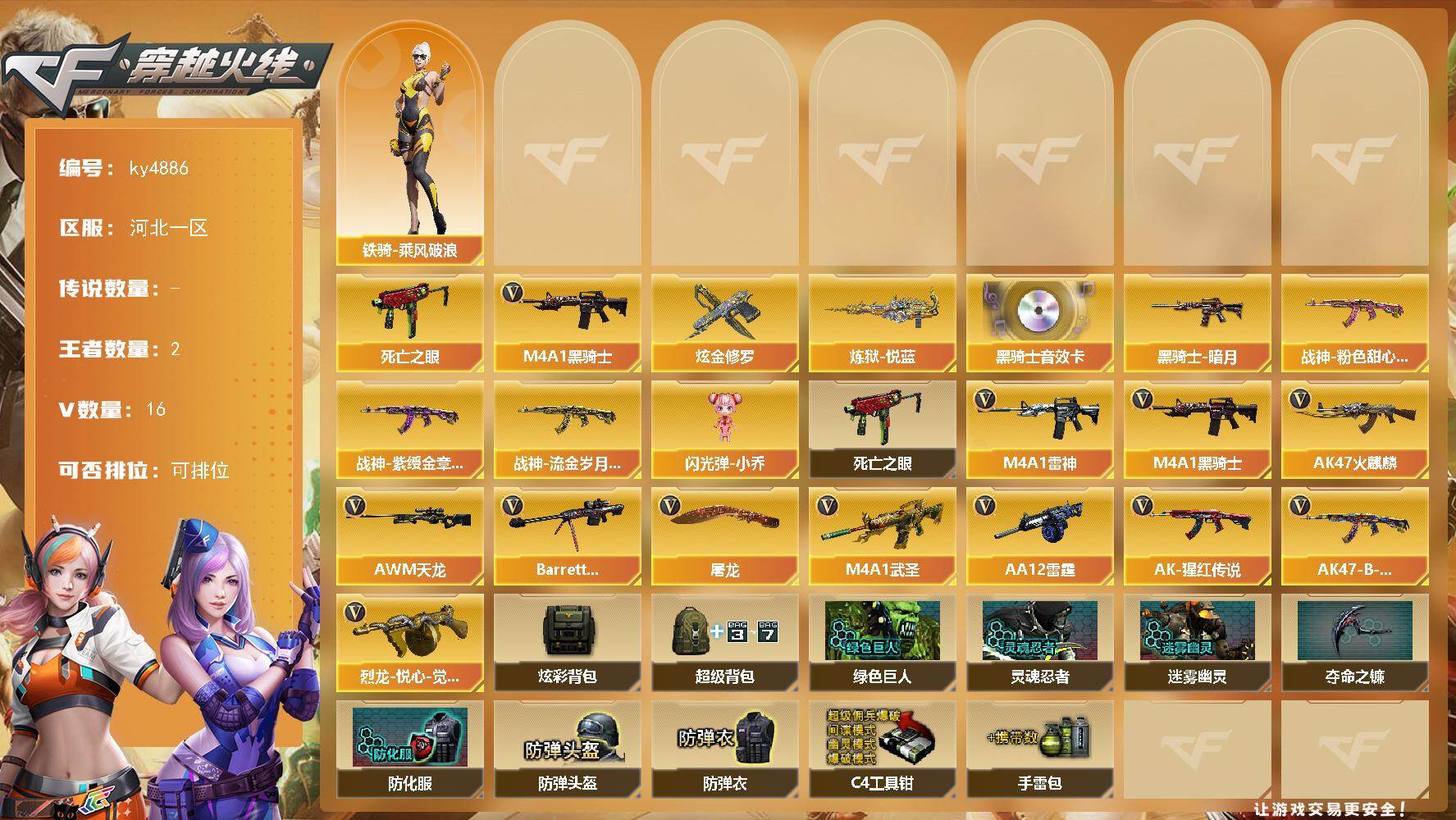- [12956550]河南一区-8V-2王者-0炫金 【角色】:王者炽天使 【人偶武器】:AWM-灵狐-15周年嘉年华 【挑战大师】:神圣爆裂者-末日III 【英雄级武器】:烈火-动感闪耀,天神-动感闪耀,屠龙-动感闪耀,手雷-动感闪耀,无影-神兵利器,黑武士-锦绣游龙,擎天 【特殊枪械】: