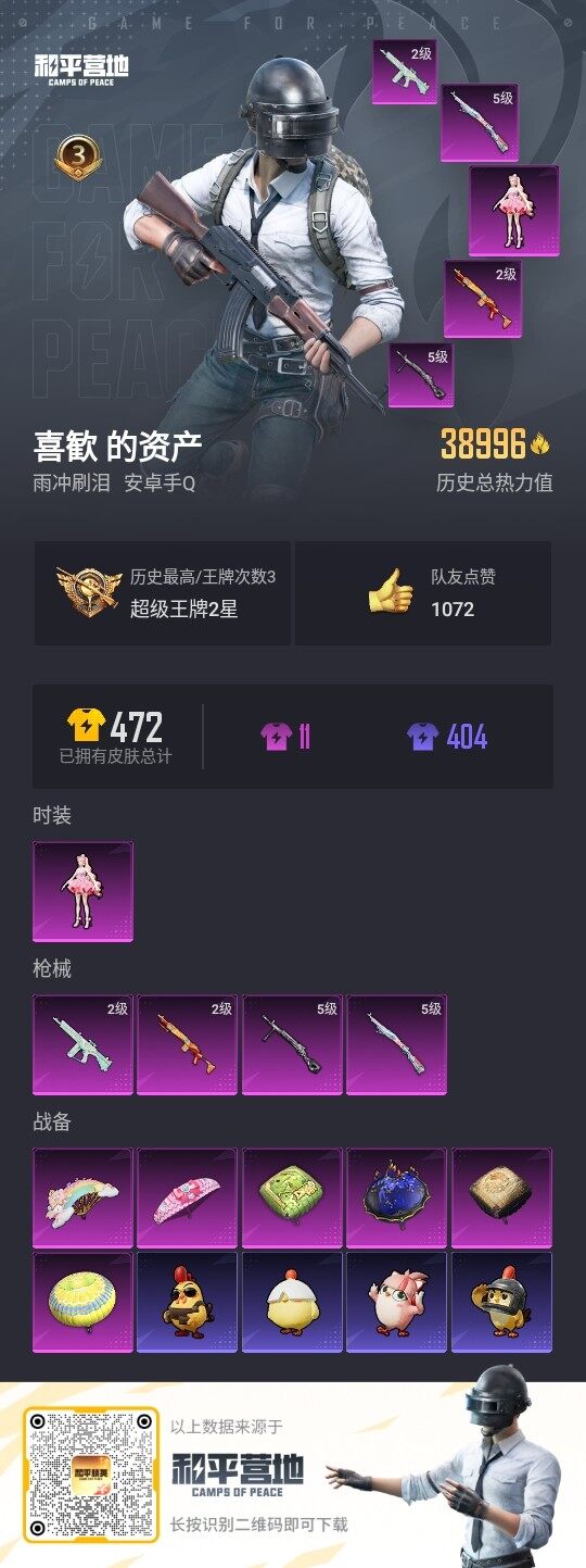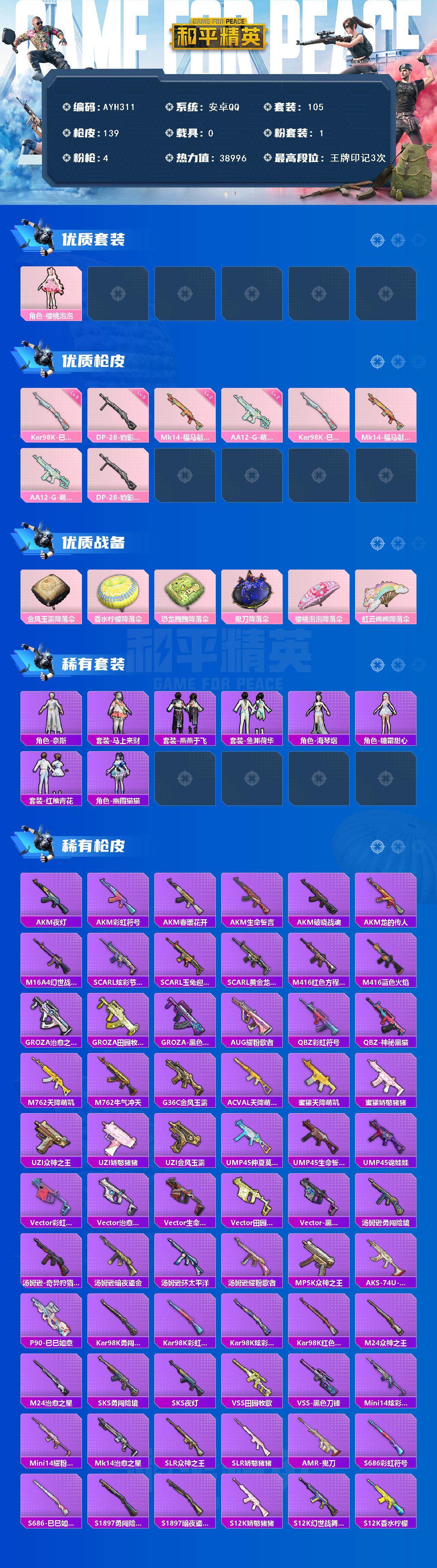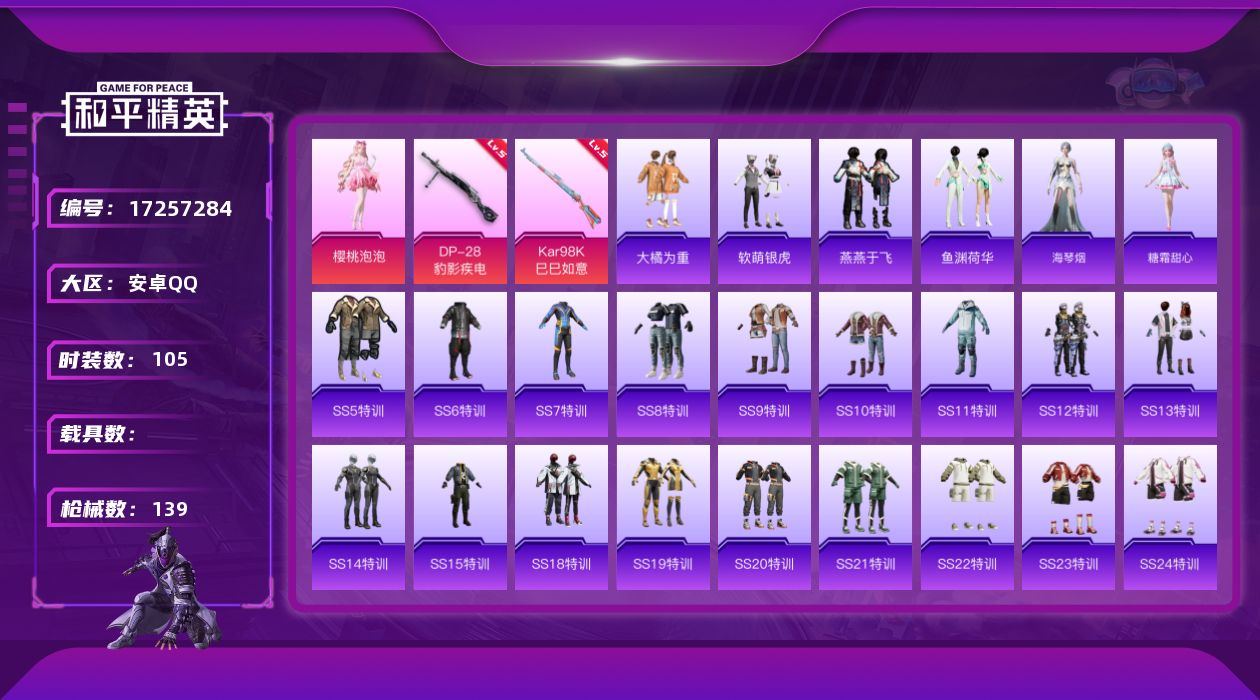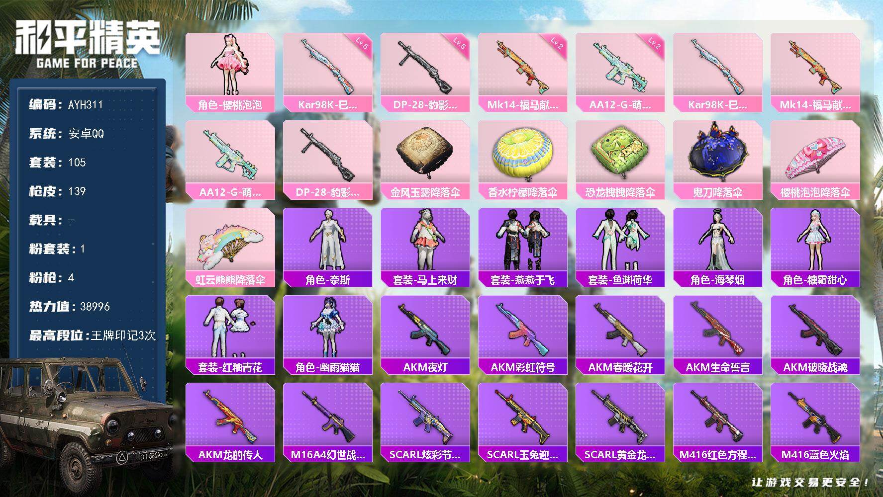 [17257284]安卓 手Q-1粉装-4特效枪-0载具-0粉色飞行器-38996热力值-3王牌印记-105套装-139枪皮