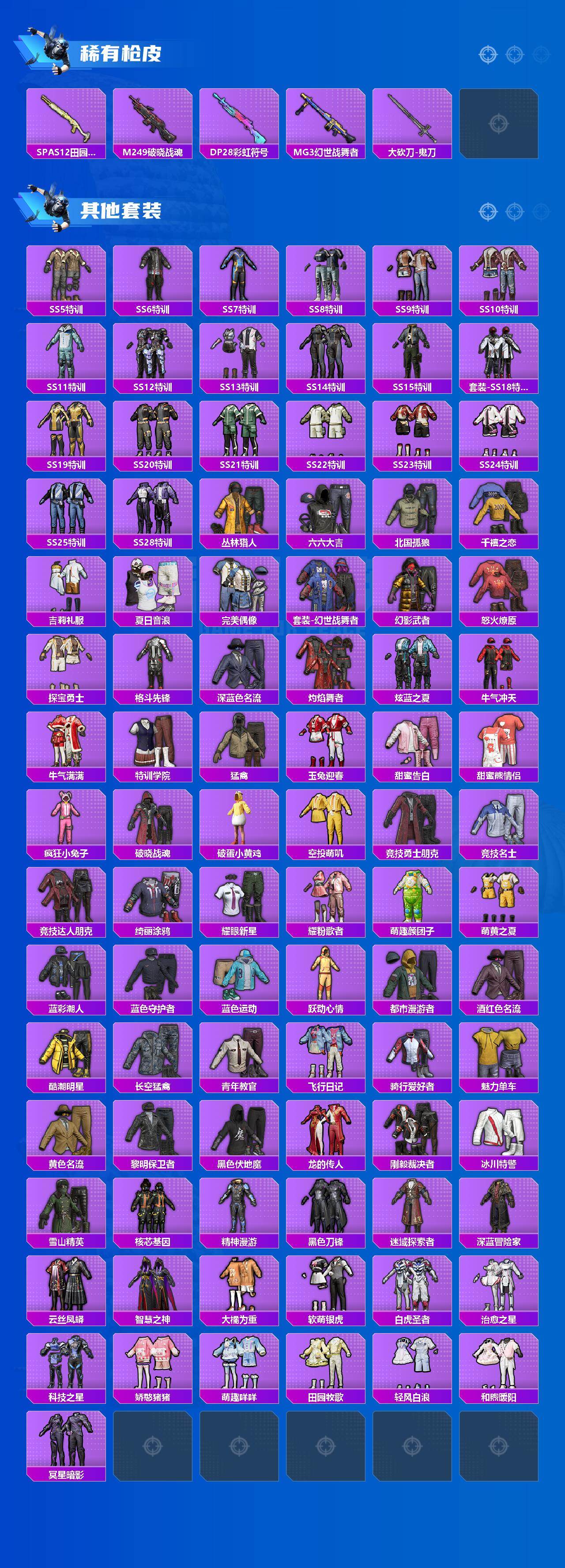 【稀有枪皮】:AKM-夜灯,AKM-彩虹符号,AKM-春暖花开,AKM-生命誓言,AKM-破晓战魂,AKM-龙的传人,M16A4-幻世战舞者,SCAR-L-炫彩节奏,SCAR-L-玉兔迎春,SCAR-L-黄金龙骨,M416-红色方程式,M416-蓝色火焰,GROZA-治愈之星,GROZA-田园牧歌,GROZA-黑色刀锋,AUG-耀粉歌者,QBZ-彩虹符号,QBZ-神秘黑猫,M762-天降萌叽,M762-牛气冲天,G36C-金风玉露,AC-VAL-天降萌叽,蜜獾-天降萌叽,蜜獾-娇憨猪猪,UZI-众神之王,UZI-娇憨猪猪,UZI-金风玉露,UMP45-仲夏莫吉托,UMP45-生命誓言,UMP45-诡娃娃,Vector-彩虹符号,Vector-治愈之星,Vector-生命誓言,Vector-田园牧歌,Vector-黑色刀锋,汤姆逊-勇闯险境,汤姆逊-奇异狩猎者,汤姆逊-暗夜鎏金,汤姆逊-环太平洋,汤姆逊-耀粉歌者,MP5K-众神之王,AKS-74U-鬼刀,P90-巳巳如意,Kar98K-勇闯险境,Kar98K-彩虹符号,Kar98K-炫彩节奏,Kar98K-红色方程式,M24-治愈之星,M24-众神之王,SKS-勇闯险境,SKS-夜灯,VSS-田园牧歌,VSS-黑色刀锋,Mini14-炫彩节奏,Mini14-耀粉歌者,Mk14-治愈之星,SLR-众神之王,SLR-娇憨猪猪,AMR-鬼刀,S686-彩虹符号,S686-巳巳如意,S1897-勇闯险境,S1897-暗夜鎏金,S12K-香水柠檬,S12K-娇憨猪猪,S12K-幻世战舞者,SPAS-12-田园牧歌