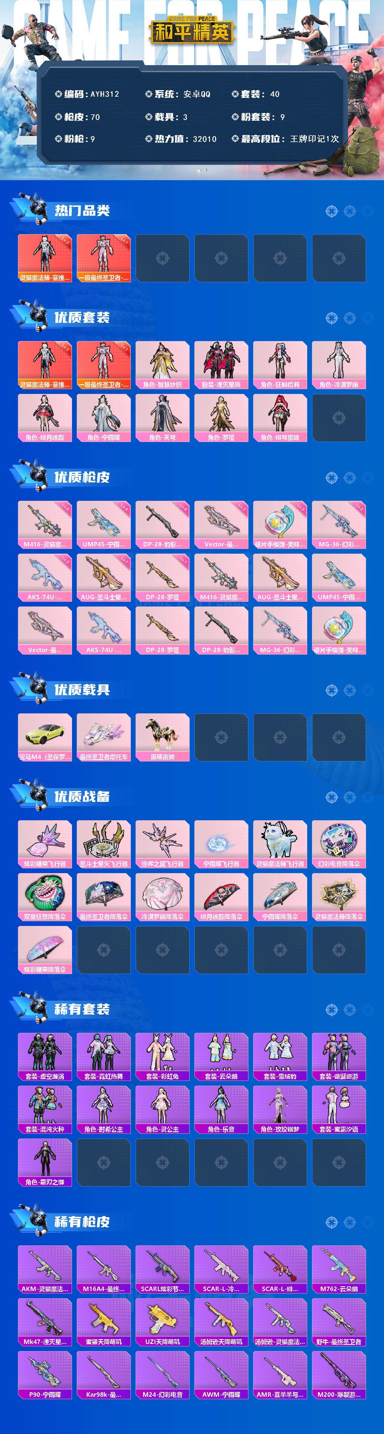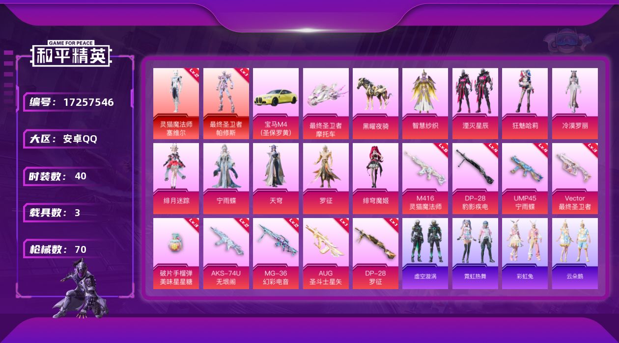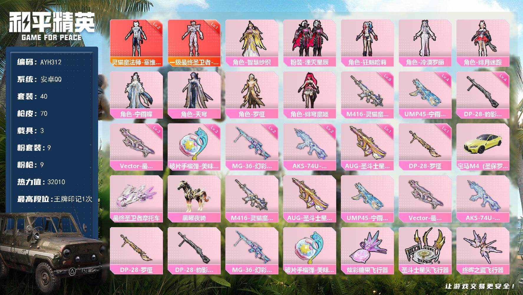 [17257546]【店主推荐捡漏号】安卓 手Q-2神装-9粉装-9特效枪-3载具-5粉色飞行器-32010热力值-1王牌印记-40套装-70枪皮【红色神装等级】:灵猫魔法师-塞维尔(二级),最终圣卫者-帕修斯(一级)【红色角色神装】:灵猫魔法师-塞维尔,最终圣卫者-帕修斯【粉色套装】:角色-智慧纱织,粉装-湮灭星辰,角色-狂魅哈莉,角色-冷漠罗丽,角色-绯月迷踪,角色-宁雨蝶,角色-天穹,角色-罗征,角色-绯穹魔姬【粉色枪皮等级】:M416-灵猫魔法师(六级),AUG-圣斗士星矢(一级),UMP45-宁雨蝶(四级),Vector-最终圣卫者(三级),AKS-74U-无垠阁(二级),DP-28-罗征(一级),DP-28-豹影疾电(四级),MG-36-幻彩电音(二级),破片手榴弹-美味星星糖(三级)【粉色载具】:宝马M4(圣保罗黄),最终圣卫者摩托车,黑曜夜骑【粉色枪皮】:M416-灵猫魔法师,AUG-圣斗士星矢,UMP45-宁雨蝶,Vector-最终圣卫者,AKS-74U-无垠阁,DP-28-罗征,DP-28-豹影疾电,MG-36-幻彩电音,破片手榴弹-美味星星糖