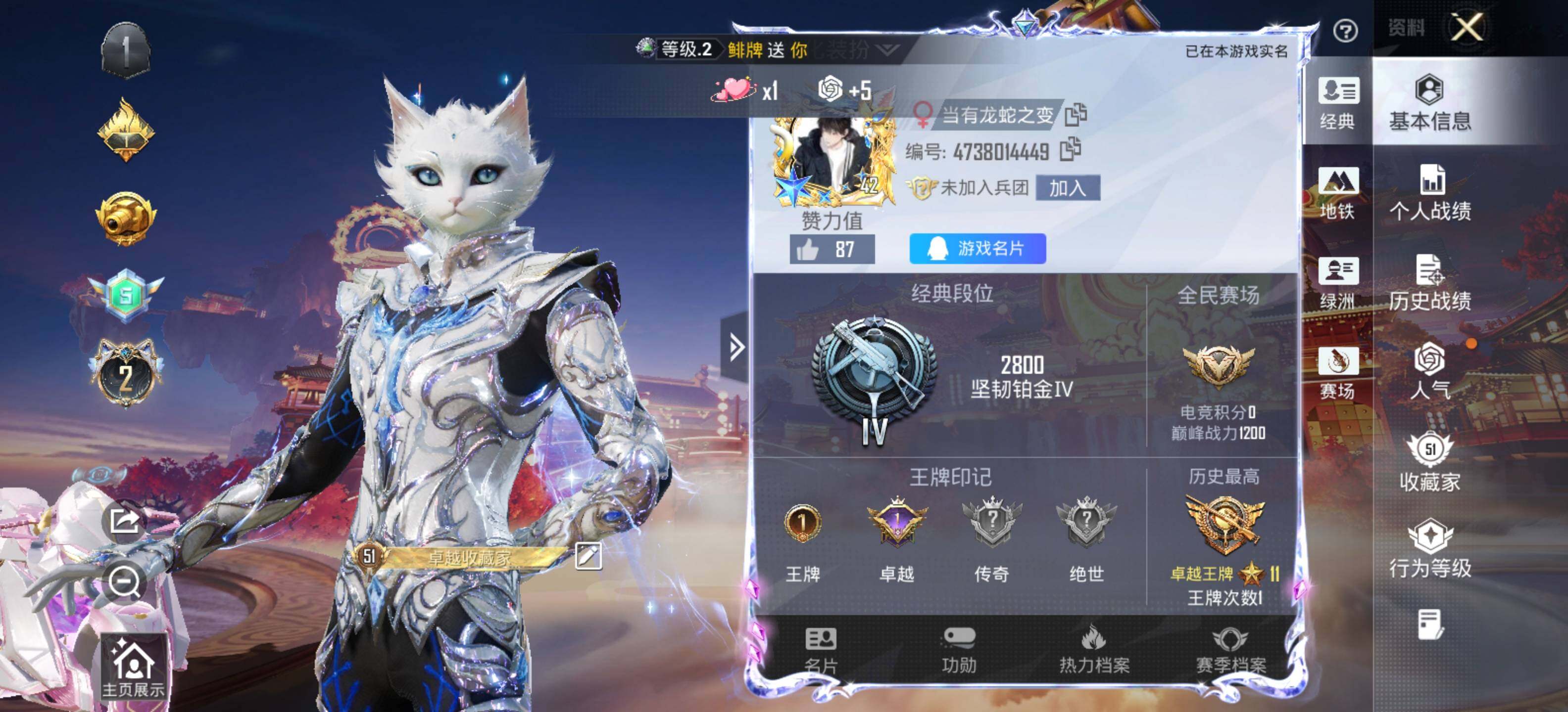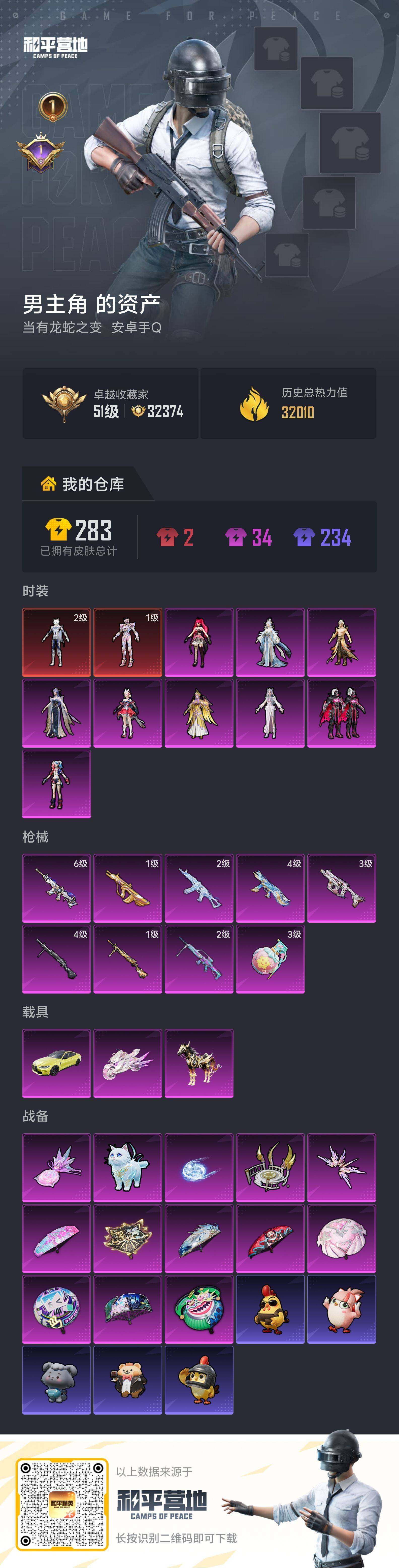 - PX_2097216- 安卓手Q-1王牌印记-1粉装-0特效枪-1载具-23180热力值-57套装-71枪皮-0卓越印记-0传奇印记 【1粉装】,暗夜玫瑰 【2稀有紫装】,雪山精英,暗夜魅影, 【1稀有载具】,路特斯ELETRE(花绽灰), 【57稀有时装】,SS32特训,暗夜魅影,雪山精英,激萌罗小黑,SS16特训,暗夜傀儡,英勇保护者,福星高照,雪兔飞飞,虎虎生威吉莉,萌黄之夏,超能拳王,人