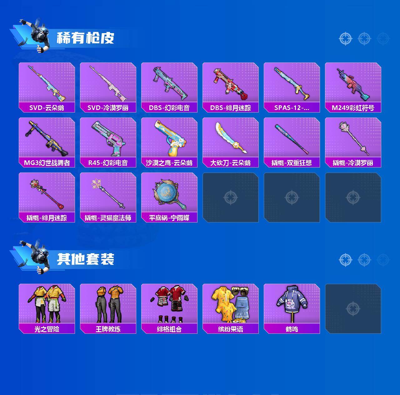 - [17002723]【店主推荐捡漏号!可直接换绑】23750k哈伏币-248m流动资产-60烽火等级-钻石-1战场等级-无军衔 资产316m【近战皮肤】:近战-黑鹰 【传说外观】:M4A1突击步枪-蚀金玫瑰,M4A1突击步枪-阿米娅,ASh-12战斗步枪-鹅鸭杀,M16A4突击步枪-狩猎时刻,AK-12突击步枪-特斯拉线圈,SCAR-H战斗步枪-启航,G3战斗步枪-狩猎时刻,G3战斗步枪-骑士,CAR-15突击步枪-阿米娅,Vector冲锋枪-狩猎时刻,UZI冲锋枪-特斯拉线圈,SR-3M紧凑突击步枪-特斯拉线圈,勇士冲锋枪-能天使-午夜邮差,QCQ171冲锋枪-鹅鸭杀,QJB201轻机枪-鹅鸭杀,复合弓-黑·天际线 【史诗外观】:SCAR-H战斗步枪-囚徒,MP5冲锋枪-战术竞备,MP5冲锋枪-竞技风,SR-3M紧凑突击步枪-战术竞备,勇士冲锋枪-工业狂潮,PKM通用机枪-蝮蛇,SVD狙击步枪-阿萨拉工艺,SV-98狙击步枪-林中猎手,沙漠之鹰-曙光 【稀有外观】:AKM突击步枪-肃杀,QBZ95-1突击步枪-公平竞技,M7战斗步枪-捣蛋鬼,SCAR-H战斗步枪-荣耀列队,K437突击步枪-生存指令,MK47突击步枪-精英联盟,MP5冲锋枪-弄臣,MP5冲锋枪-虎啸,MP5冲锋枪-哈夫克卫队,P90冲锋枪-黄昏,P90冲锋枪-捣蛋鬼,Vector冲锋枪-先锋,UZI冲锋枪-前沿科技,SMG-45-行动开启,SMG-45冲锋枪-幻影结构,勇士冲锋枪-冰天雪地,QJB201轻机枪-哈夫克卫队,Mini-14射手步枪-荣耀列队,SKS射手步枪-弄臣,SR-25射手步枪-开拓,SV-98狙击步枪-星链科技,SV-98狙击步枪-哈夫克航天,SV-98狙击步枪-精英联盟,M700狙击步枪-前沿科技,沙漠之鹰-前沿科技 【普通外观】:M4A1突击步枪-粉色涂装,M4A1突击步枪-高雅黑,M4A1突击步枪-海色,QBZ95-1突击步枪-高雅黑,QBZ95-1突击步枪-海浪,QBZ95-1突击步枪-海色,K416突击步枪-几何迷彩,K416突击步枪-高雅黑,M16A4突击步枪-三角洲力量,M16A4突击步枪-山林猎人,M16A4突击步枪-高雅黑,AUG突击步枪-浅蓝涂装,M7战斗步枪-红色涂装,SG552突击步枪-浅蓝涂装,SCAR-H战斗步枪-数码迷彩,G3战斗步枪-高雅黑,PTR-32突击步枪
