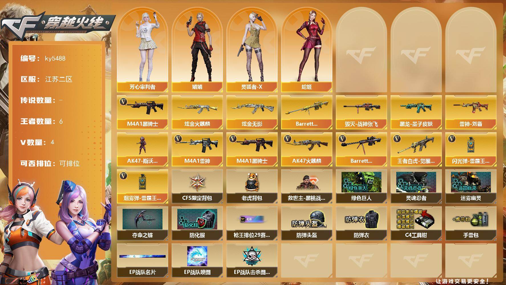 [17257689]江苏二区-7V-6王者武器数-2炫金武器数 【热门武器】:M4A1-黑骑士 【王者炫金武器】:Barrett-雷霆王者,炫金火麒麟,炫金无影 【皮肤】:雷神-刘备 皮肤,毁灭-战神张飞,黑龙-墨子皮肤 【角色】:芳心审判者,娟娟,灵狐者-X,蛇姬 【人偶武器】:AK47-斯沃特 【英雄级武器】:AK47-火麒麟,M4A1-雷神,M4A1-黑骑士,王者白虎-觉醒版,Barrett-毁灭,闪光弹-雷霆王者-觉醒版,烟雾弹-雷霆王者-觉醒版 【道具】:CFS限定背包,老虎背包,救世主-黑桃战神,绿色巨人,灵魂忍者,迷雾幽灵,夺命之镰,防化服*3,枪王排位28赛季金色流光,枪王排位29赛季金色流光,EP战队名片,EP战队喷图,EP战队击杀图标,防弹头盔*3,防弹衣*3,C4工具钳*3,手雷包*3 【特殊枪械】:1黑骑士