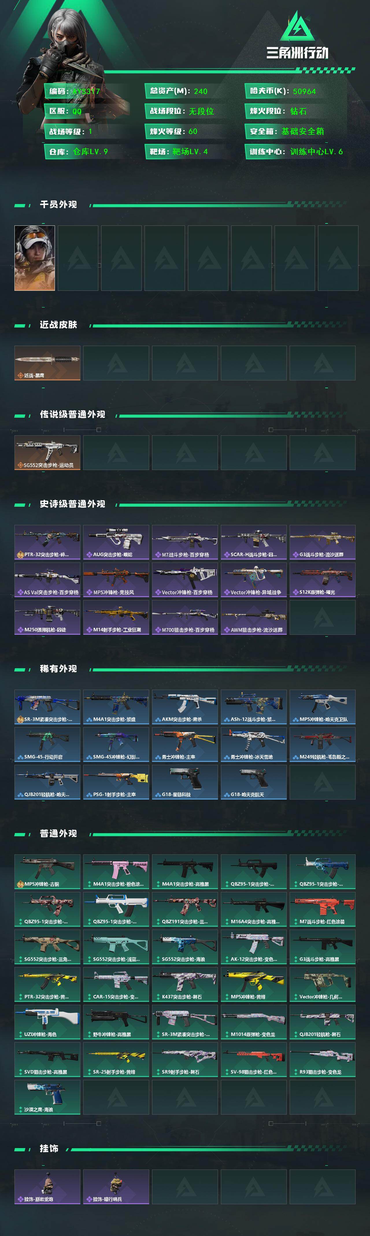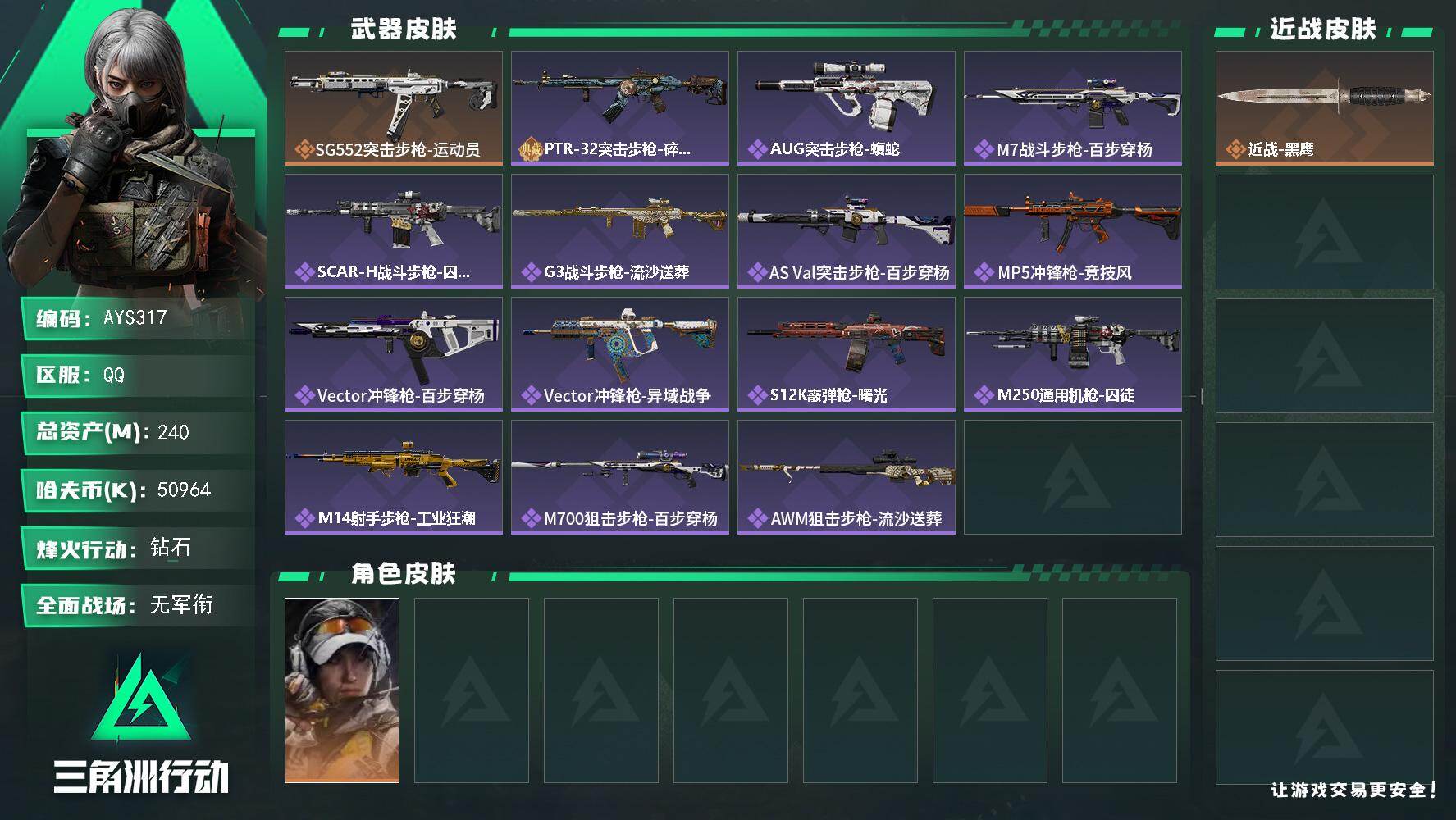 [17257642]【特价出售/店主推荐】240m总资产-50964k哈伏币-60烽火等级-钻石-1战场等级-无军衔 【干员外观】:露娜-金牌射手 【近战皮肤】:近战-黑鹰 【传说外观】:SG552突击步枪-运动员 【史诗外观】:PTR-32突击步枪-碎冰行动,AUG突击步枪-蝮蛇,M7战斗步枪-百步穿杨,SCAR-H战斗步枪-囚徒,G3战斗步枪-流沙送葬,AS Val突击步枪-百步穿杨,MP5冲锋枪-竞技风,Vector冲锋枪-百步穿杨,Vector冲锋枪-异域战争,S12K霰弹枪-曙光,M250通用机枪-囚徒,M14射手步枪-工业狂潮,M700狙击步枪-百步穿杨,AWM狙击步枪-流沙送葬 【稀有外观】:SR-3M紧凑突击步枪-巨兽,M4A1突击步枪-繁盛,AKM突击步枪-肃杀,ASh-12战斗步枪-繁盛,MP5冲锋枪-哈夫克卫队,SMG-45-行动开启,SMG-45冲锋枪-幻影结构,勇士冲锋枪-主宰,勇士冲锋枪-冰天雪地,M249轻机枪-毛鲁斯之力,QJB201轻机枪-哈夫克卫队,PSG-1射手步枪-主宰,G18-星链科技,G18-哈夫克航天 【普通外观】:MP5冲锋枪-古铜*2,M4A1突击步枪-粉色涂装,M4A1突击步枪-高雅黑,QBZ95-1突击步枪-高雅黑,QBZ95-1突击步枪-海浪,QBZ95-1突击步枪-三角洲力量,QBZ95-1突击步枪-海色,QBZ191突击步枪-三角洲力量,M16A4突击步枪-高雅黑,M7战斗步枪-红色涂装,SG552突击步枪-三角洲力量,SG552突击步枪-浅蓝涂装,SG552突击步枪-海浪,AK-12突击步枪-变色龙,G3战斗步枪-高雅黑,PTR-32突击步枪-黄蜂,CAR-15突击步枪-变色龙,K437突击步枪-磐石,MP5冲锋枪-黄蜂,Vector冲锋枪-几何迷彩,UZI冲锋枪-海色,野牛冲锋枪-高雅黑,SR-3M紧凑突击步枪-变色龙,M1014霰弹枪-变色龙,QJB201轻机枪-磐石,SVD狙击步枪-高雅黑,SR-25射手步枪-黄蜂,SR9射手步枪-磐石,SV-98狙击步枪-红色涂装,R93狙击步枪-变色龙,沙漠之鹰-海浪 【挂饰】:挂饰-崩岩重炮*8,挂饰-暗行哨兵*5