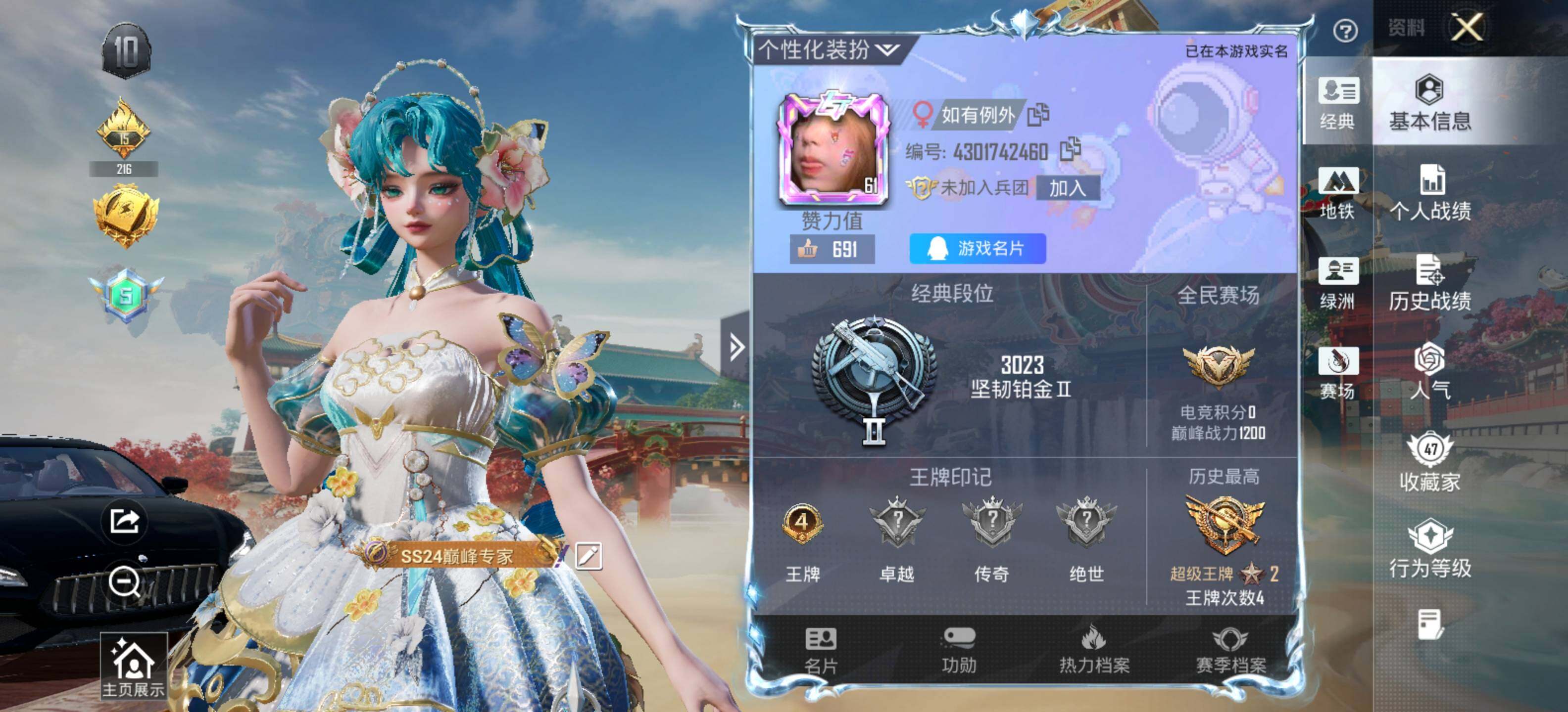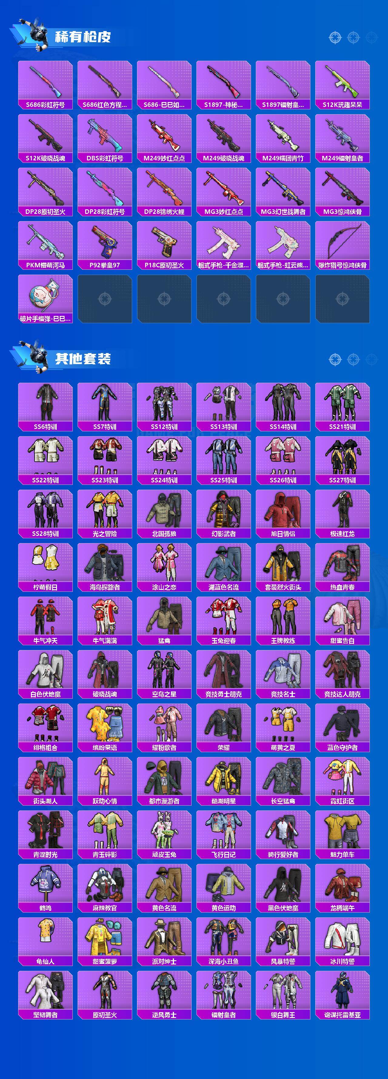 - PX_2084985-【和平精英连体王者荣耀 具体看图!】时装数: 82 枪械数: 127 战备数: 81 热门装扮: 深海小丑鱼,黄族统领,莲影清波 稀有枪皮: AKM绿萝繁花,M416电玩时刻,UMP45量子极限,Kar98K-巳巳如意
