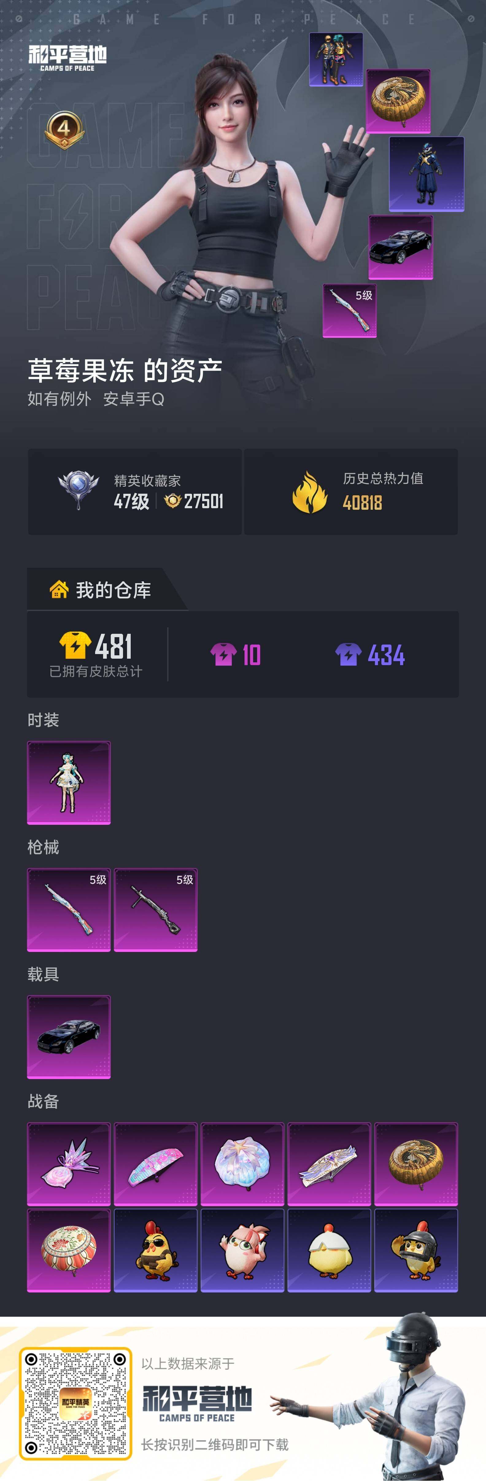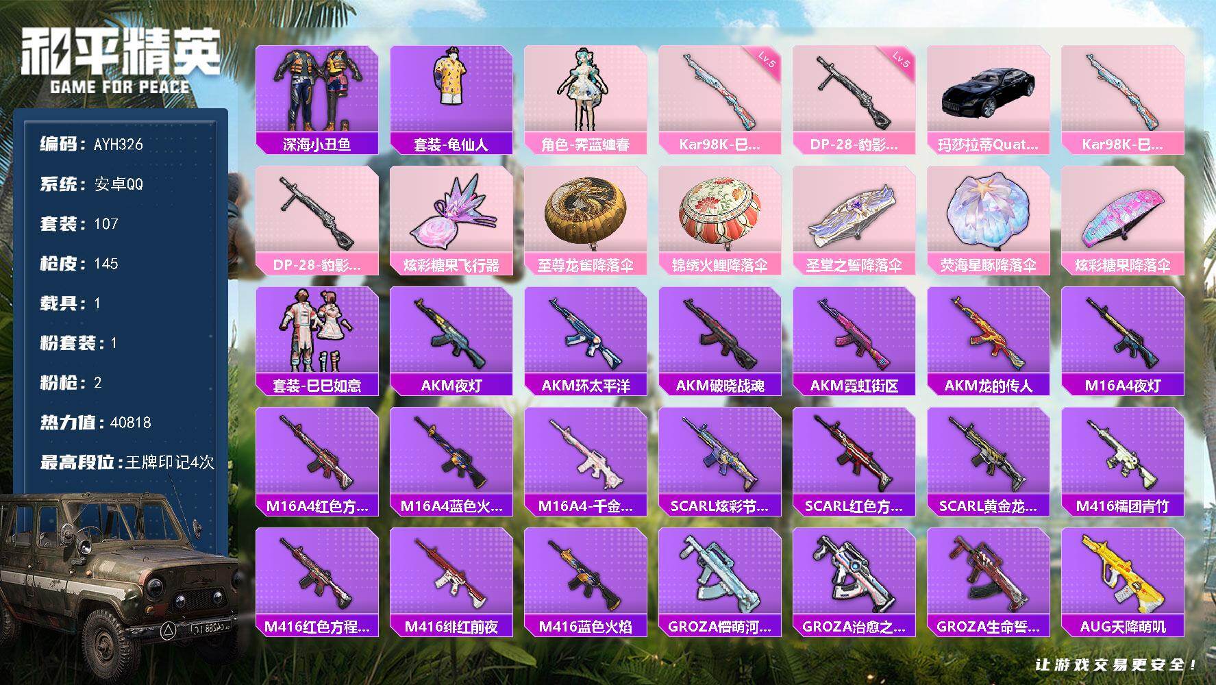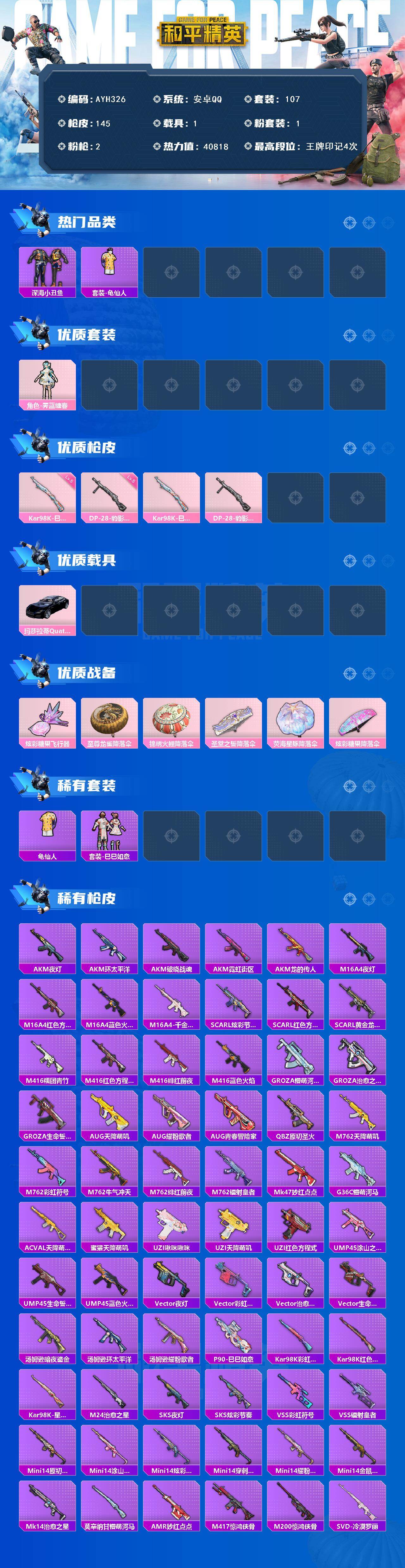 [17258201]【店主推荐捡漏号】安卓 手Q-1粉装-2特效枪-1载具-1粉色飞行器-40818热力值-4王牌印记-107套装-145枪皮【热门品类】:套装-深海小丑鱼,套装-龟仙人【粉色套装】:角色-霁蓝缠春【粉色枪皮等级】:Kar98K-巳巳如意(五级),DP-28-豹影疾电(五级)【粉色载具】:玛莎拉蒂Quattroporte(夜幕蓝)【粉色枪皮】:Kar98K-巳巳如意,DP-28-豹影疾电