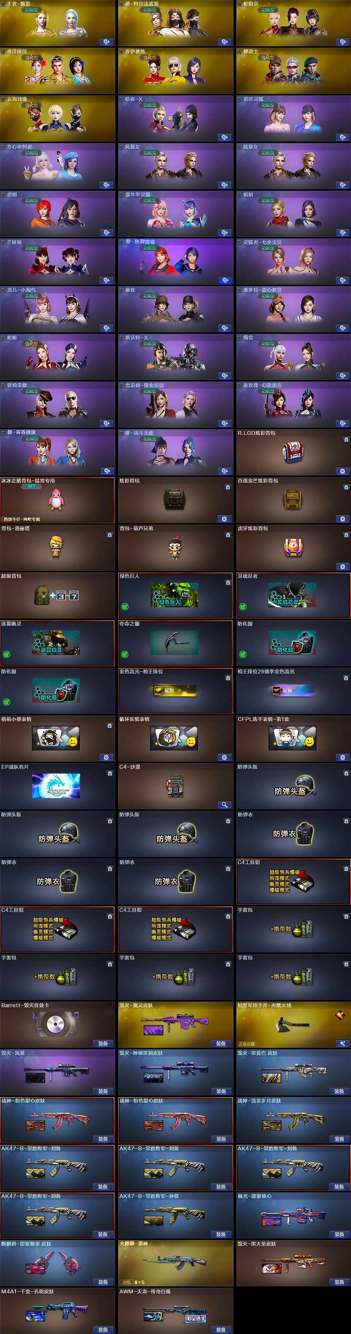 【道具】:R.LGD炫彩背包,冰冰企鹅背包-猛男专用,炫彩背包,百战金芒炫彩背包,背包-洛丽塔,背包-葫芦兄弟,虎牙炫彩背包,超级背包,绿色巨人,灵魂忍者,迷雾幽灵,夺命之镰,防化服*2,金色流光-枪王排位,枪王排位29赛季金色流光,萌萌小葵表情,循环实
