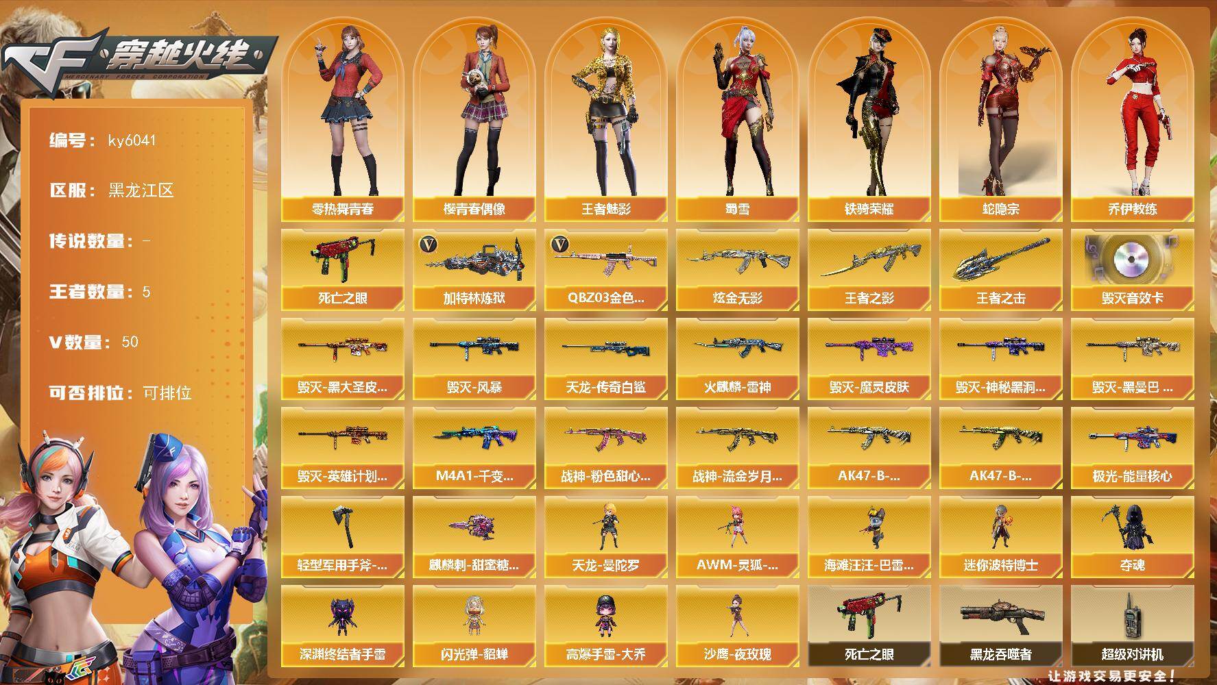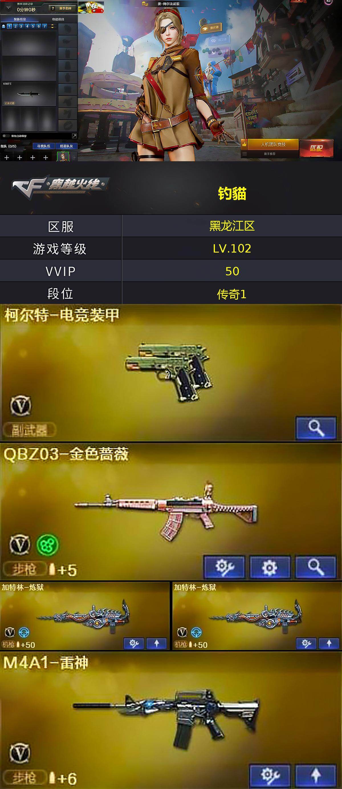 [17258502]黑龙江区-52V-5王者武器数-1炫金武器数 【热门武器】:QBZ03-金色蔷薇,死亡之眼*3,加特林-炼狱*2 【王者炫金武器】:王者之影*2,王者之击,炫金无影 【音效卡】:Barrett-毁灭音效卡 【皮肤】:火麒麟-雷神,毁灭-黑大圣皮肤,毁灭-风暴,毁灭-魔灵皮肤,毁灭-神秘黑洞皮肤,毁灭-黑曼巴 皮肤,毁灭-英雄计划 皮肤,M4A1-千变-孔明皮肤,战神-粉色甜心皮肤*2,战神-流金岁月皮肤,AK47-B-常胜将军-刘备*4,AK47-B-常胜将军-孙权,AWM-天龙-传奇白鲨,极光-能量核心,轻型军用手斧-再燃火线,麒麟刺-甜蜜糖果 皮肤 【角色】:王者-魅影,蛇隐宗,奇洋探员,乔伊教练,修道士,云海玲珑,葵-阿尔法武装,暗夜-X,初恋灵狐,芳心审判者,风暴女*2,虎妞,嘉年华灵狐,娟娟,兰妹妹,零-热舞青春,灵狐者-七夕宝贝,龙儿-小淘气,麻雀,潘多拉-甜心教官,蛇姬,斯沃特-X,蜀雪,铁骑荣耀,兔囡囡,雪莉杨-摸金校尉,夜玫瑰-幻能朋克,樱-青春偶像,樱-战斗天使 【人偶武器】:天龙-曼陀罗,AWM-灵狐-15周年嘉年华,海滩汪汪-巴雷特,迷你波特博士,夺魂,深渊终结者手雷*3,闪光弹-貂蝉,高爆手雷-大乔,沙鹰-夜玫瑰 【暴走生化】:黑龙吞噬者,死亡之眼*3,超级对讲机 【挑战大师】:AK47-冰龙粉碎者,冰龙粉碎者-白马银枪*5,激光毁灭者III-白马银枪*2,激光毁灭者III,神圣爆裂者-末日III 【英雄级武器】:M4A1-雷神,M4A1-武圣,无影-神兵利器,QBZ03-金色蔷薇,AK-47-猩红传说*2,AK47-B-常胜将军,AWM-天龙,Barrett-毁灭*3,Barrett-极光,Barrett-金色蔷薇,王者之光-觉醒版,加特林-炼狱*2,沙鹰-天神,柯尔特-电竞装甲,Glock18-武圣,屠龙,麒麟刺,幻灵之锋,擎天-竞技荣光*2,尼泊尔-电竞装甲,麒麟刺-百战金芒,王者之击-觉醒版,高爆手雷-竞技荣光*2,闪光弹-竞技荣光*2,烟雾弹-竞技荣光*2,烟雾弹-神工天巧*2 【道具】:R.LGD炫彩背包,冰冰企鹅背包-猛男专用,炫彩背包,百战金芒炫彩背包,背包-洛丽塔,背包-葫芦兄弟,虎牙炫彩背包,超级背包,绿色巨人,灵魂忍者,迷雾幽灵,夺命之镰,防化服*2,金色流光-枪王排位,枪王排位29赛季金色流光,萌萌小葵表情,循环实