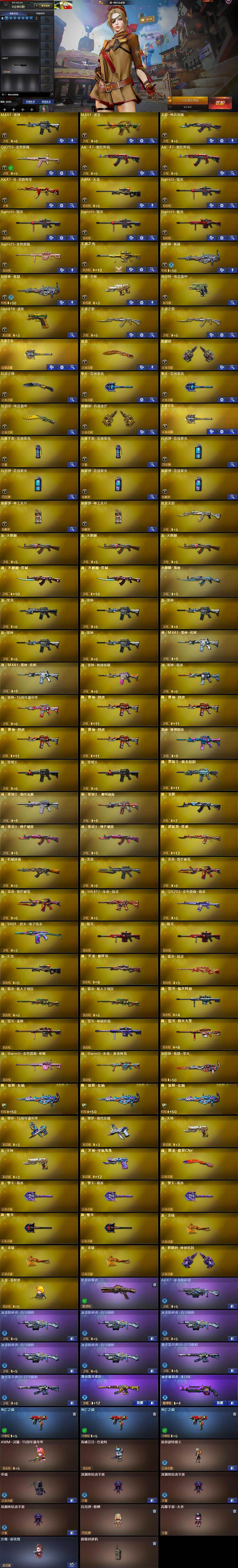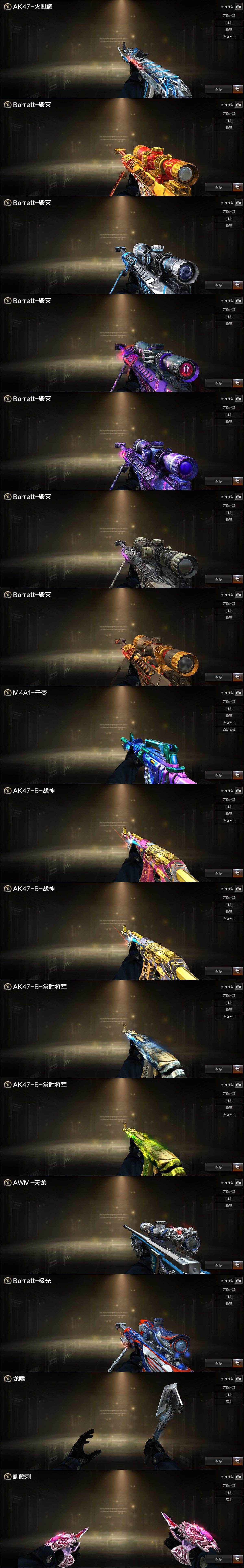 【英雄级武器】:M4A1-雷神,M4A1-武圣,无影-神兵利器,QBZ03-金色蔷薇,AK-47-猩红传说*2,AK47-B-常胜将军,AWM-天龙,Barrett-毁灭*3,Barrett-极光,Barrett-金色蔷薇,王者之光-觉醒版,加特林-炼狱*2,沙鹰-天神,柯尔特-电竞装甲,Glock18-武圣,屠龙,麒麟刺,幻灵之锋,擎天-竞技荣光*2,尼泊尔-电竞装甲,麒麟刺-百战金芒,王者之击-觉醒版,高爆手雷-竞技荣光*2,闪光弹-竞技荣光*2,烟雾弹-竞技荣光*2,烟雾弹-神工天巧*2