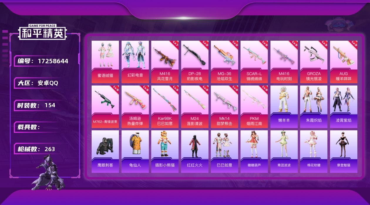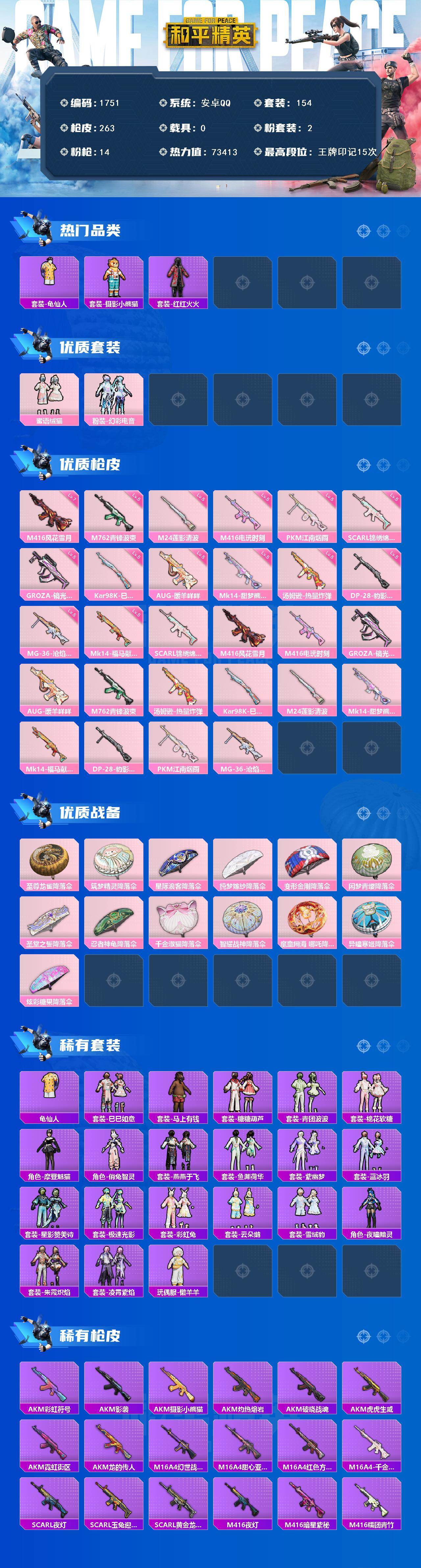 [17258644]【1751】安卓 手Q-2粉装-14特效枪-0载具-0粉色飞行器-73413热力值-15王牌印记-154套装-263枪皮 【热门品类】:套装-龟仙人,套装-摄影小熊猫,套装-红红火火 【粉色套装】:粉装-蜜语绒猫,粉装-幻彩电音 【粉色枪皮等级】:SCAR-L-锦绣绵绵(五级),M416-风花雪月(七级),M416-电玩时刻(五级),GROZA-镜光银凌(五级),AUG-暖羊咩咩(五级),M762-青锋波束(五级),汤姆逊-热量炸弹(五级),Kar98K-巳巳如意(五级),M24-莲影清波(五级),Mk14-甜梦熊击(五级),Mk14-福马献瑞(五级),DP-28-豹影疾电(五级),PKM-江南烟雨(五级),MG-36-沧焰双生(五级) 【粉色枪皮】:SCAR-L-锦绣绵绵,M416-风花雪月,M416-电玩时刻,GROZA-镜光银凌,AUG-暖羊咩咩,M762-青锋波束,汤姆逊-热量炸弹,Kar98K-巳巳如意,M24-莲影清波,Mk14-甜梦熊击,Mk14-福马献瑞,DP-28-豹影疾电,PKM-江南烟雨,MG-36-沧焰双生 【粉色降落伞】:至尊龙雀降落伞,筑梦精灵降落伞,星际浪客降落伞,纯梦嫁纱降落伞,变形金刚降落伞,闲梦青缨降落伞,圣堂之誓降落伞,忍者神龟降落伞,千金淑猫降落伞,智耀战神降落伞,魔童闹海 哪吒降落伞,异瞳寒姬降落伞,炫彩糖果降落伞 【稀有套装】:套装-龟仙人,套装-巳巳如意,套装-马上有钱,套装-糖糖葫芦,套装-青团波波,套装-棉花软糖,角色-摩登魅猫,角色-俏兔智灵,套装-燕燕于飞,套装-鱼渊荷华,套装-紫幽梦,套装-蓝冰羽,套装-星影赞美诗,套装-极速光影,套装-彩虹兔,套装-云朵鹅,套装-雪绒豹,角色-夜瞳黯灵,套装-朱霞炽焰,套装-凌霄紫焰,玩偶服-懒羊羊 【稀有枪皮】:AKM-彩虹符号,AKM-影袭,AKM-摄影小熊猫,AKM-灼热熔岩,AKM-破晓战魂,AKM-虎虎生威,AKM-霓虹街区,AKM-龙的传人,M16A4-幻世战舞者,M16A4-甜心亚梦,M16A4-红色方程式,M16A4-千金淑猫,SCAR-L-夜灯,SCAR-L-玉兔迎春,SCAR-L-黄金龙骨,M416-夜灯,M416-暗星紫秘,M416-糯团青竹,M416-红色方程式,M416-蓝色火焰,GROZA-异彩先驱,GROZA-彩虹符号,GROZA-影袭,GRO