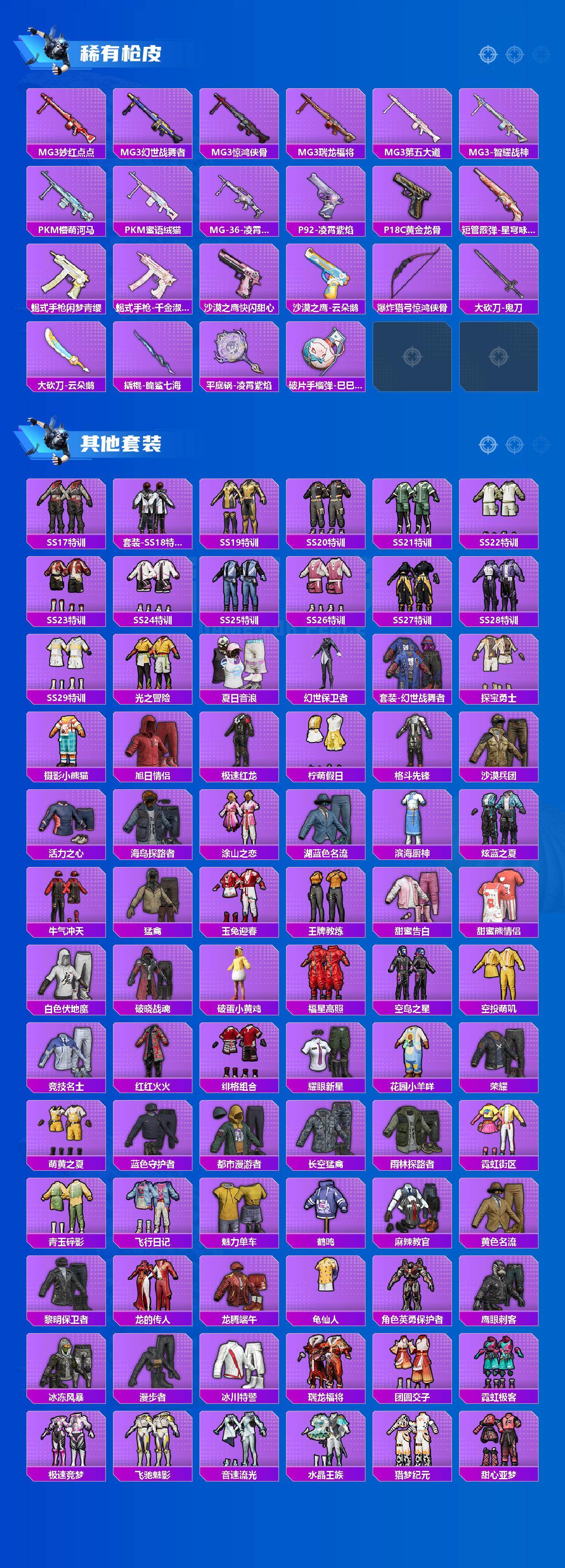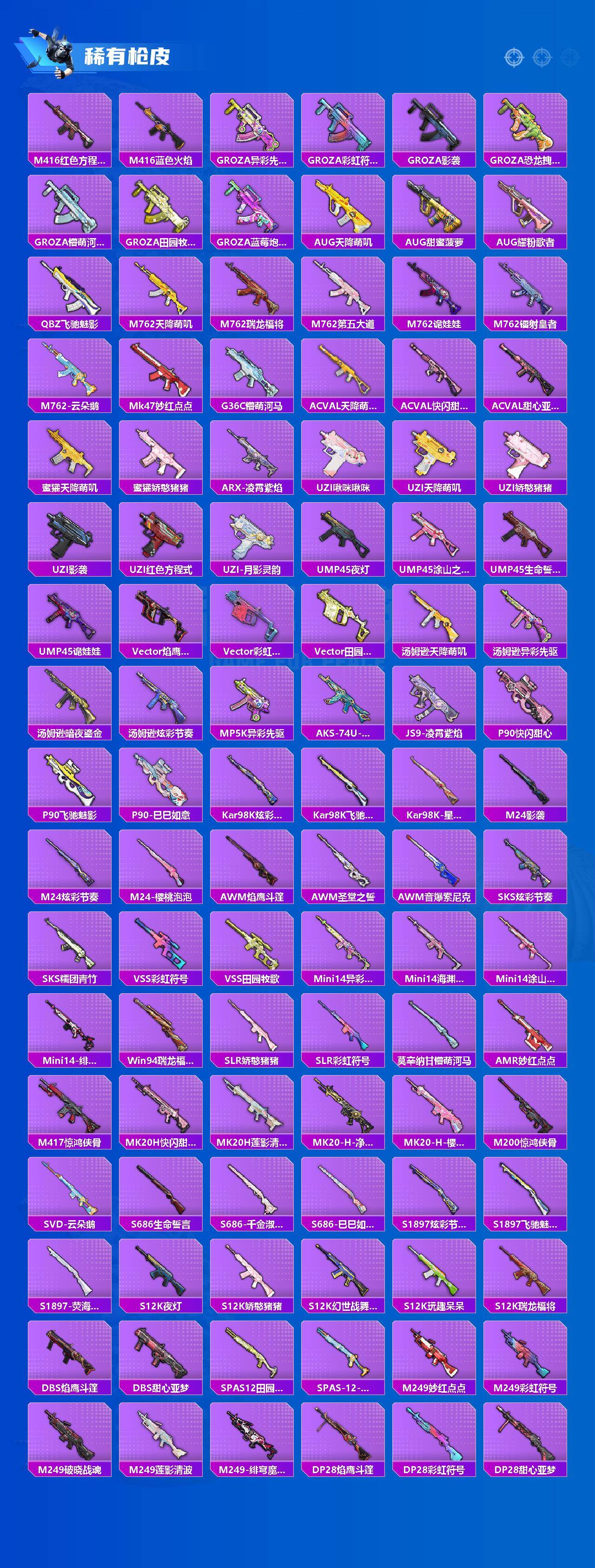 【稀有枪皮】:AKM-彩虹符号,AKM-影袭,AKM-摄影小熊猫,AKM-灼热熔岩,AKM-破晓战魂,AKM-虎虎生威,AKM-霓虹街区,AKM-龙的传人,M16A4-幻世战舞者,M16A4-甜心亚梦,M16A4-红色方程式,M16A4-千金淑猫,SCAR-L-夜灯,SCAR-L-玉兔迎春,SCAR-L-黄金龙骨,M416-夜灯,M416-暗星紫秘,M416-糯团青竹,M416-红色方程式,M416-蓝色火焰,GROZA-异彩先驱,GROZA-彩虹符号,GROZA-影袭,GRO