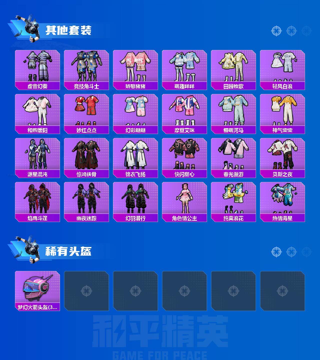 【稀有套装】:套装-龟仙人,套装-巳巳如意,套装-马上有钱,套装-糖糖葫芦,套装-青团波波,套装-棉花软糖,角色-摩登魅猫,角色-俏兔智灵,套装-燕燕于飞,套装-鱼渊荷华,套装-紫幽梦,套装-蓝冰羽,套装-星影赞美诗,套装-极速光影,套装-彩虹兔,套装-云朵鹅,套装-雪绒豹,角色-夜瞳黯灵,套装-朱霞炽焰,套装-凌霄紫焰,玩偶服-懒羊羊