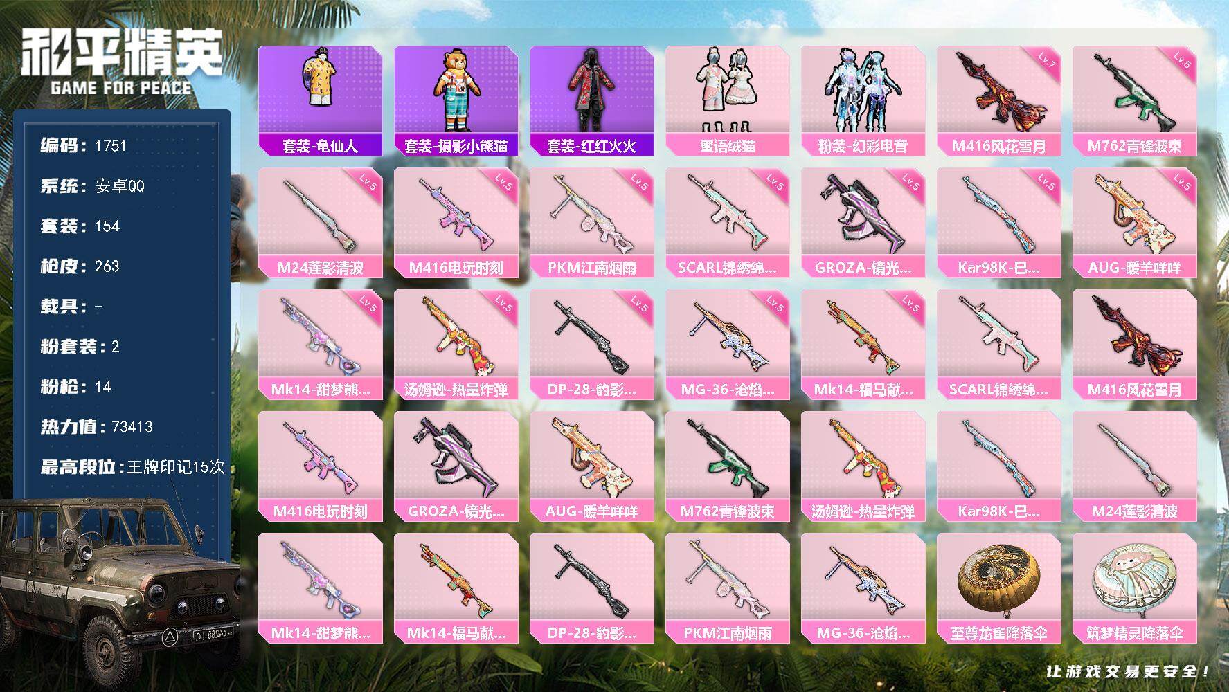 [17258644]【1751】安卓 手Q-2粉装-14特效枪-0载具-0粉色飞行器-73413热力值-15王牌印记-154套装-263枪皮
