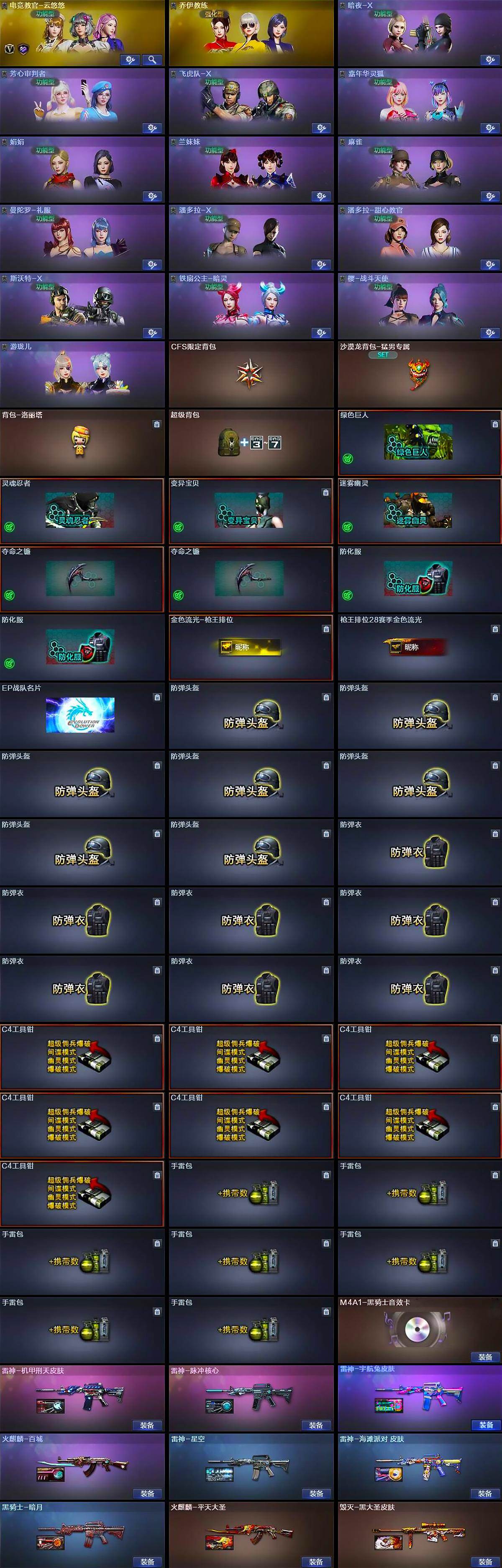 【道具】:CFS限定背包,沙漠龙背包-猛男专属,背包-洛丽塔,超级背包,绿色巨人,灵魂忍者,变异宝贝,迷雾幽灵,夺命之镰*2,防化服*2,金色流光-枪王排位,枪王排位28赛季金色流光,EP战队名片,防弹头盔*7,防弹衣*7,C4工具钳*7,手雷包*7