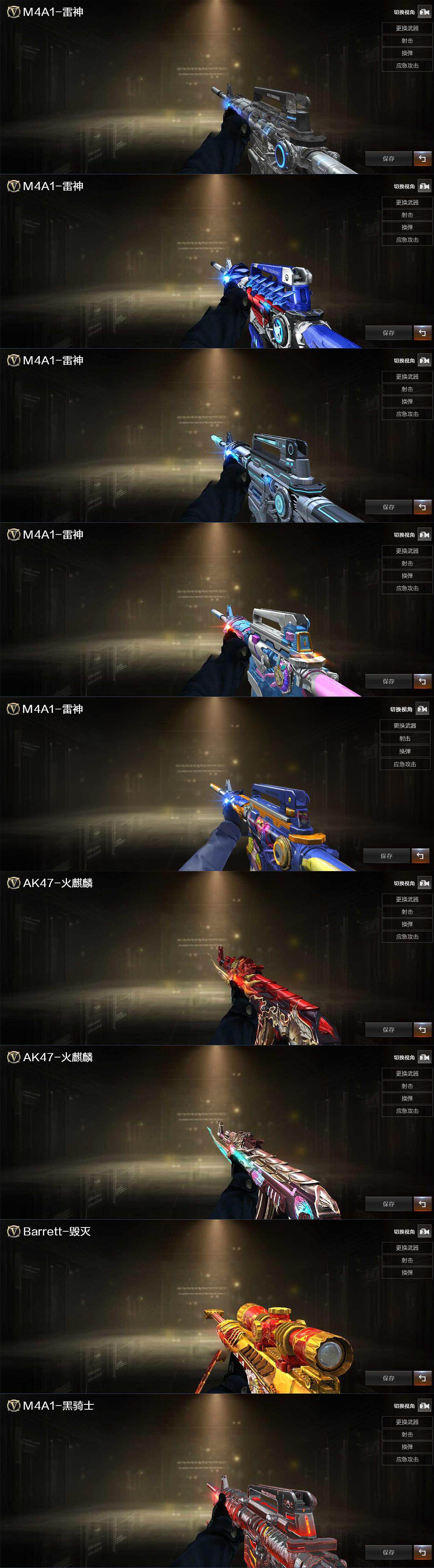 【英雄级武器】:AK47-火麒麟,M4A1-雷神,M4A1-黑骑士,无影-神兵利器,黑武士-锦绣游龙,白虎-电玩蓝兔,M200-竞技荣光,USP-雷暴,柯尔特-竞技荣光,擎天-竞技荣光,唐刀-神工天巧,高爆手雷-竞技荣光*3,高爆手雷-神工天巧*2,闪光弹-竞技荣光*4,闪光弹-神工天巧*4,烟雾弹-竞技荣光*3,烟雾弹-神工天巧*4