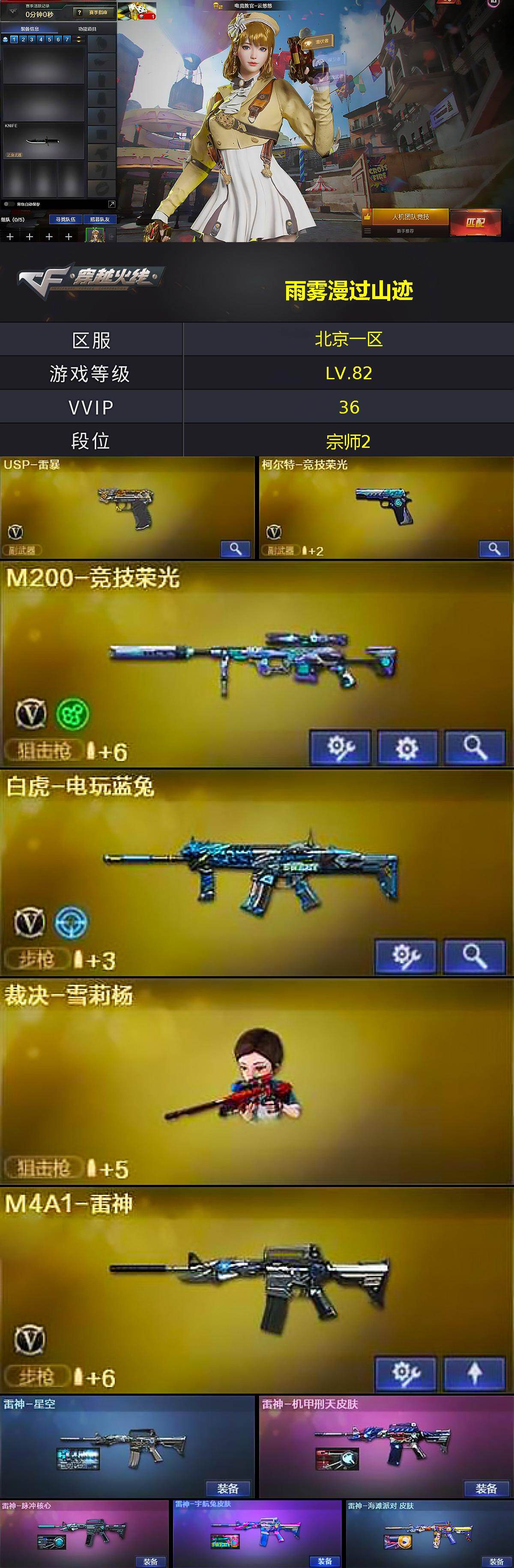 [17258607]北京一区-42V-1王者武器数-0炫金武器数 【热门武器】:M200-竞技荣光,白虎-电玩蓝兔,M4A1-黑骑士,裁决-雪莉杨,USP-雷暴 【音效卡】:M4A1-黑骑士音效卡 【皮肤】:雷神-星空,雷神-机甲刑天皮肤,雷神-脉冲核心,雷神-宇航兔皮肤,雷神-海滩派对 皮肤,火麒麟-平天大圣,火麒麟-百城,毁灭-黑大圣皮肤,黑骑士-暗月 【角色】:电竞教官-云悠悠,乔伊教练,暗夜-X,芳心审判者,飞虎队-X,嘉年华灵狐,娟娟,兰妹妹,麻雀,曼陀罗-礼服,潘多拉-X,潘多拉-甜心教官,斯沃特-X,兔囡囡,铁扇公主-暗灵,樱-战斗天使,游珑儿 【人偶武器】:裁决-雪莉杨,天龙-乔伊教练,王者汪汪-巴雷特,AWM-灵狐-15周年嘉年华,海滩汪汪-巴雷特,迷你深渊冰龙,迷你裂空之翼*3,迷你牛牛*3,深渊终结者手雷 【英雄级武器】:AK47-火麒麟,M4A1-雷神,M4A1-黑骑士,无影-神兵利器,黑武士-锦绣游龙,白虎-电玩蓝兔,M200-竞技荣光,USP-雷暴,柯尔特-竞技荣光,擎天-竞技荣光,唐刀-神工天巧,高爆手雷-竞技荣光*3,高爆手雷-神工天巧*2,闪光弹-竞技荣光*4,闪光弹-神工天巧*4,烟雾弹-竞技荣光*3,烟雾弹-神工天巧*4 【道具】:CFS限定背包,沙漠龙背包-猛男专属,背包-洛丽塔,超级背包,绿色巨人,灵魂忍者,变异宝贝,迷雾幽灵,夺命之镰*2,防化服*2,金色流光-枪王排位,枪王排位28赛季金色流光,EP战队名片,防弹头盔*7,防弹衣*7,C4工具钳*7,手雷包*7 【特殊枪械】:1黑骑士