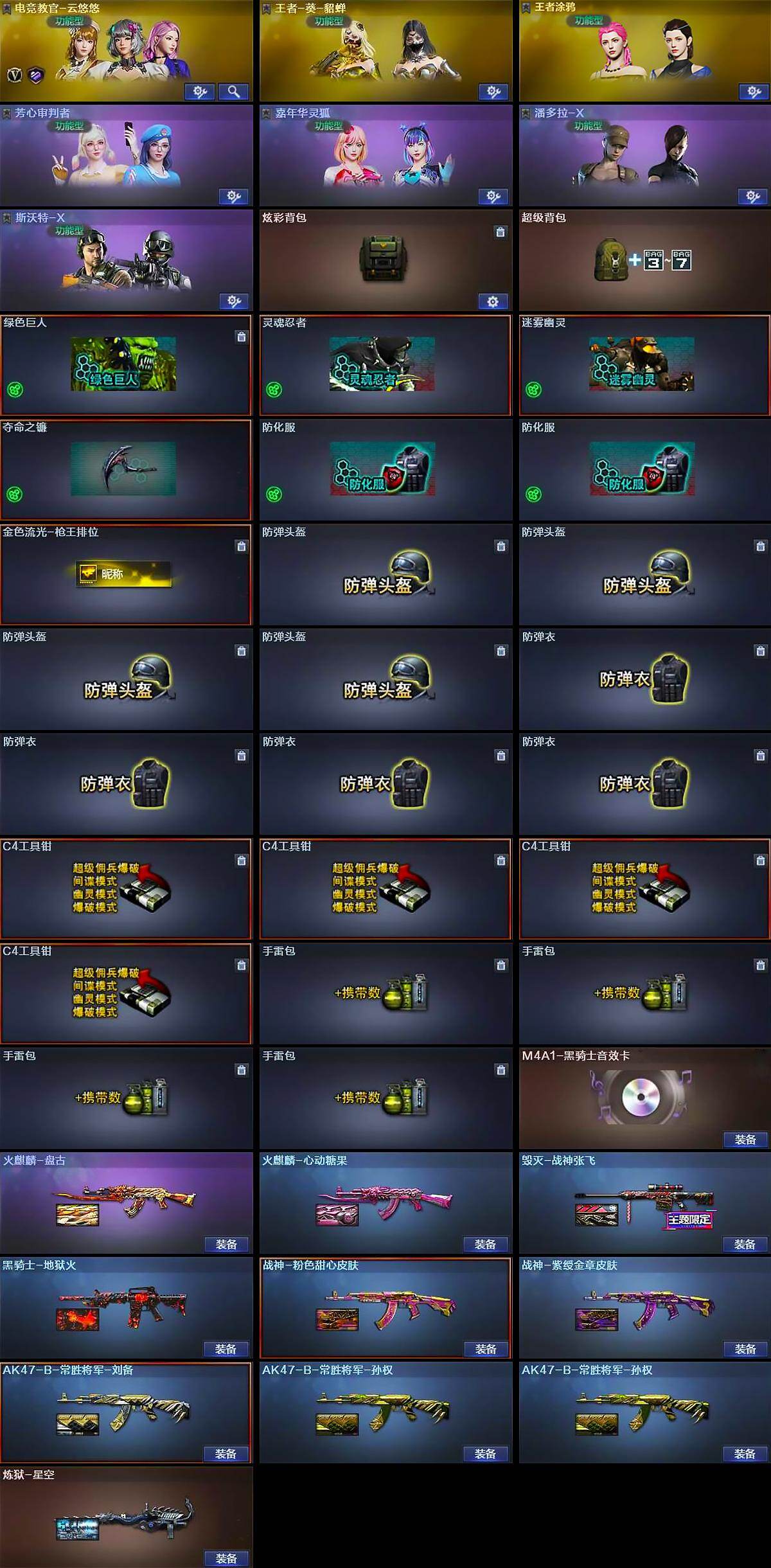 【道具】:炫彩背包,超级背包,绿色巨人,灵魂忍者,迷雾幽灵,夺命之镰,防化服*2,金色流光-枪王排位,防弹头盔*4,防弹衣*4,C4工具钳*4,手雷包*4