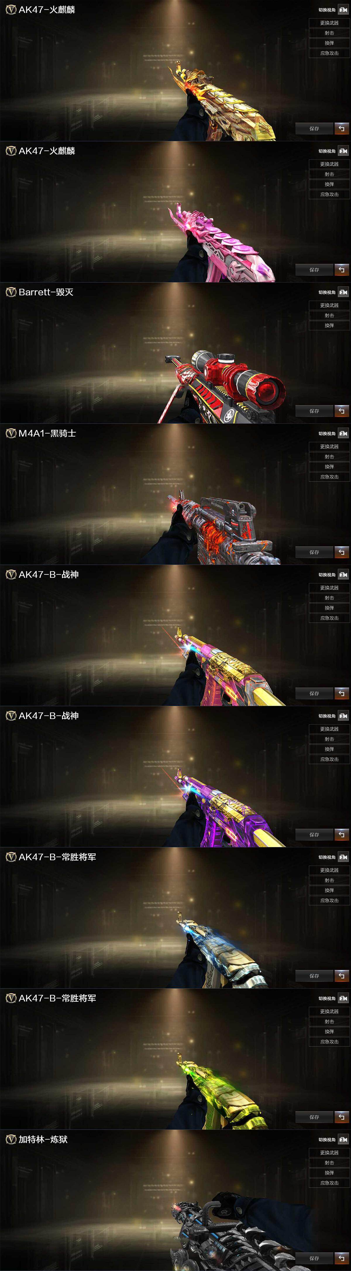 【英雄级武器】:AK47-火麒麟*2,M4A1-黑龙,M4A1-黑骑士,Scar Light-白虎,QBZ03-金色蔷薇,AK47-B-常胜将军,Barrett-毁灭,M200-幻神,M200-竞技荣光,RPK-盘龙*5,加特林-炼狱*2,汤姆逊-烈龙*6,沙鹰-天神,USP-雷暴,柯尔特-竞技荣光,屠龙,擎天,幻灵之锋*2,擎天-竞技荣光,王者之击-觉醒版,高爆手雷-幻灵*2,高爆手雷-竞技荣光,闪光弹-幻灵,闪光弹-竞技荣光,烟雾弹-幻灵*3,烟雾弹-竞技荣光