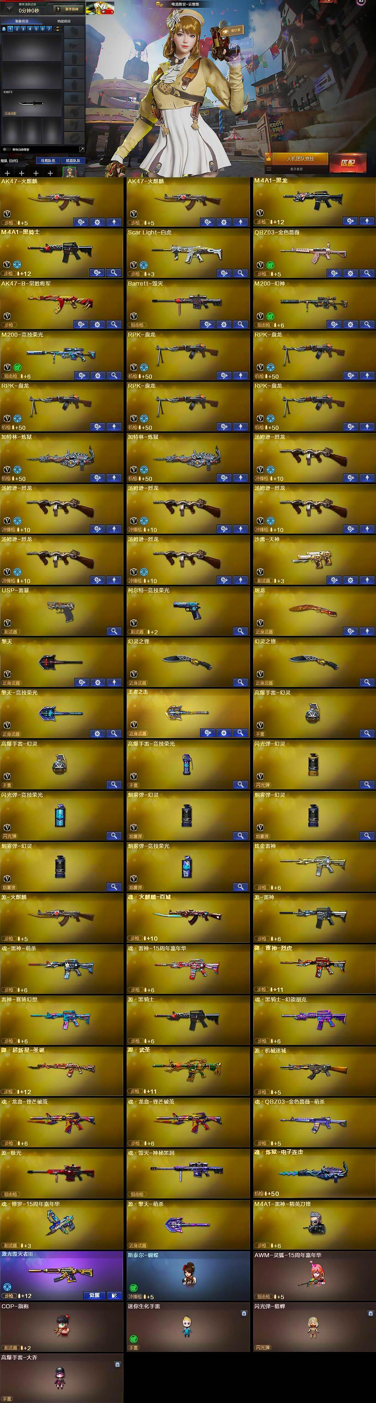 【人偶武器】:M4A1-雷神-精英刀锋,斯泰尔-蝴蝶,AWM-灵狐-15周年嘉年华,COP-旗袍,迷你生化手雷,闪光弹-貂蝉,高爆手雷-大乔