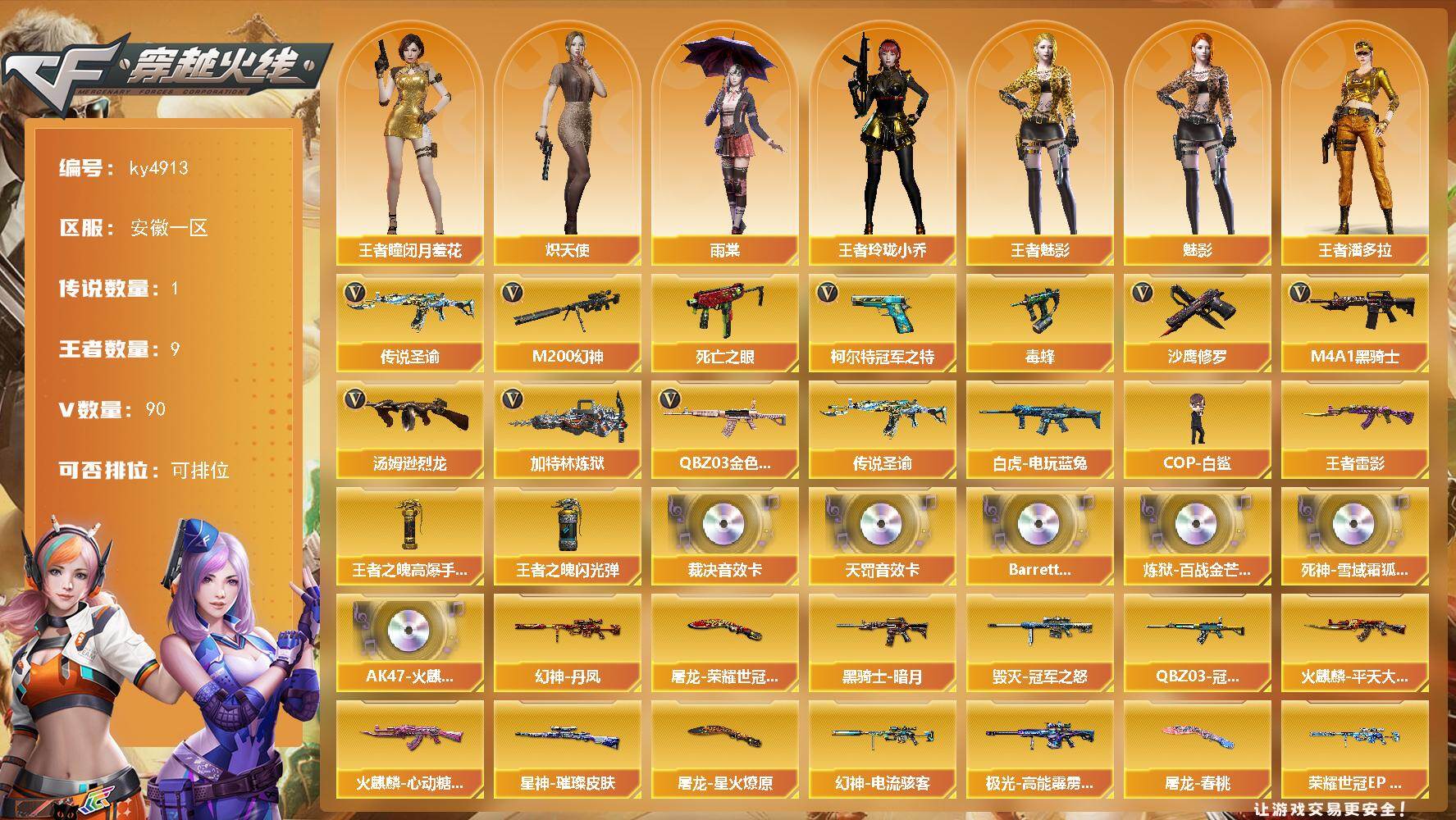 [17259051]安徽一区-90V-9王者-0炫金 【传说武器】:传说圣谕 【传说角色】:传说星骇 【热门武器】:传说圣谕,QBZ03-金色蔷薇,M200-幻神,死亡之眼,白虎-电玩蓝兔,柯尔特-冠军之特,毒蜂,M4A1-黑骑士,汤姆逊-烈龙*6,加特林-炼狱,COP-白鲨,沙鹰-修罗*2 【王者炫金武器】:王者雷影,王者之魄高爆手雷,王者之魄闪光弹*2 【音效卡】:AWM-裁决音效卡,QBZ03-天罚音效卡,Barrett-碧霄极光音效卡,炼狱-百战金芒-庆典舞曲音效卡,死神-雪域霜狐-怀旧音效卡,AK47-火麒麟-怀旧音效卡 【皮肤】:幻神-丹凤,幻神-电流骇客 皮肤,幻神-荣耀世冠EP 皮肤,QBZ03-冠军之薇,裁决-运输船 皮肤,星神-璀璨皮肤,雷神-暗月,雷神-源计划2.0专属 皮肤,M4A1-再燃火线,火麒麟-平天大圣,火麒麟-心动糖果,毁灭-冠军之怒,黑骑士-暗月,天罚-课桌奇兵 皮肤,战神-粉色甜心皮肤*2,战神-紫绶金章皮肤,战神-流金岁月皮肤,AK47-B-常胜将军-刘备*3,极光-高能霹雳 皮肤,炼狱-玩具枪皮肤,修罗-百战金芒 皮肤,屠龙-荣耀世冠AG,屠龙-星火燎原,屠龙-春桃 皮肤,屠龙-惊鸿 皮肤,轻型军用手斧-再燃火线 【角色】:魅影,雨棠,机械姬,隐,妮妮,王者-瞳-闭月羞花,王者-魅影,王者玲珑-小乔,王者潘多拉,雪域霜狐,乔伊教练,云海玲珑,炽天使,暗夜-X,初恋灵狐,风暴女,疾风,娟娟,卡塔琳娜,兰妹妹,零-水下丽影,灵狐-花神,灵狐者-黄金海岸,龙儿,龙儿-小淘气,麻雀,曼陀罗-X,玫瑰花神,潘多拉-甜心教官,潜龙队-X,青霞仙子,蛇姬,斯沃特-X,铁骑荣耀,雪莉杨,影武者-X,智影 【人偶武器】:COP-白鲨,火麒麟-灵狐,迷你救赎猎手,异变清道夫-蛇影双骄,AWM-灵狐-15周年嘉年华,M37-葵,迷你深渊冰龙,夺魂,迷你牛牛,迷你生化手雷*2,生化手雷-机甲核心*3,深渊终结者手雷*2,闪光弹-小乔,闪光弹-貂蝉,高爆手雷-大乔 【暴走生化】:毒蜂,死亡之眼,超级对讲机 【挑战大师】:神圣爆裂者III,AK47-冰龙粉碎者,激光毁灭者III,试炼破坏者III,神圣爆裂者-末日III 【英雄级武器】:AK47-火麒麟,M4A1-黑龙*2,M4A1-雷神*2,M4A1-黑骑士,AK47-黑武士,QBZ03-天罚,FAMAS G2-天戎,