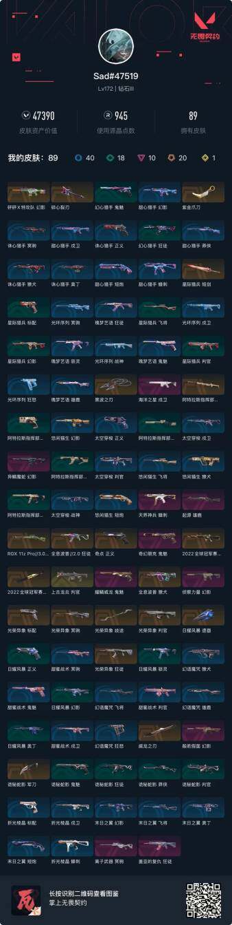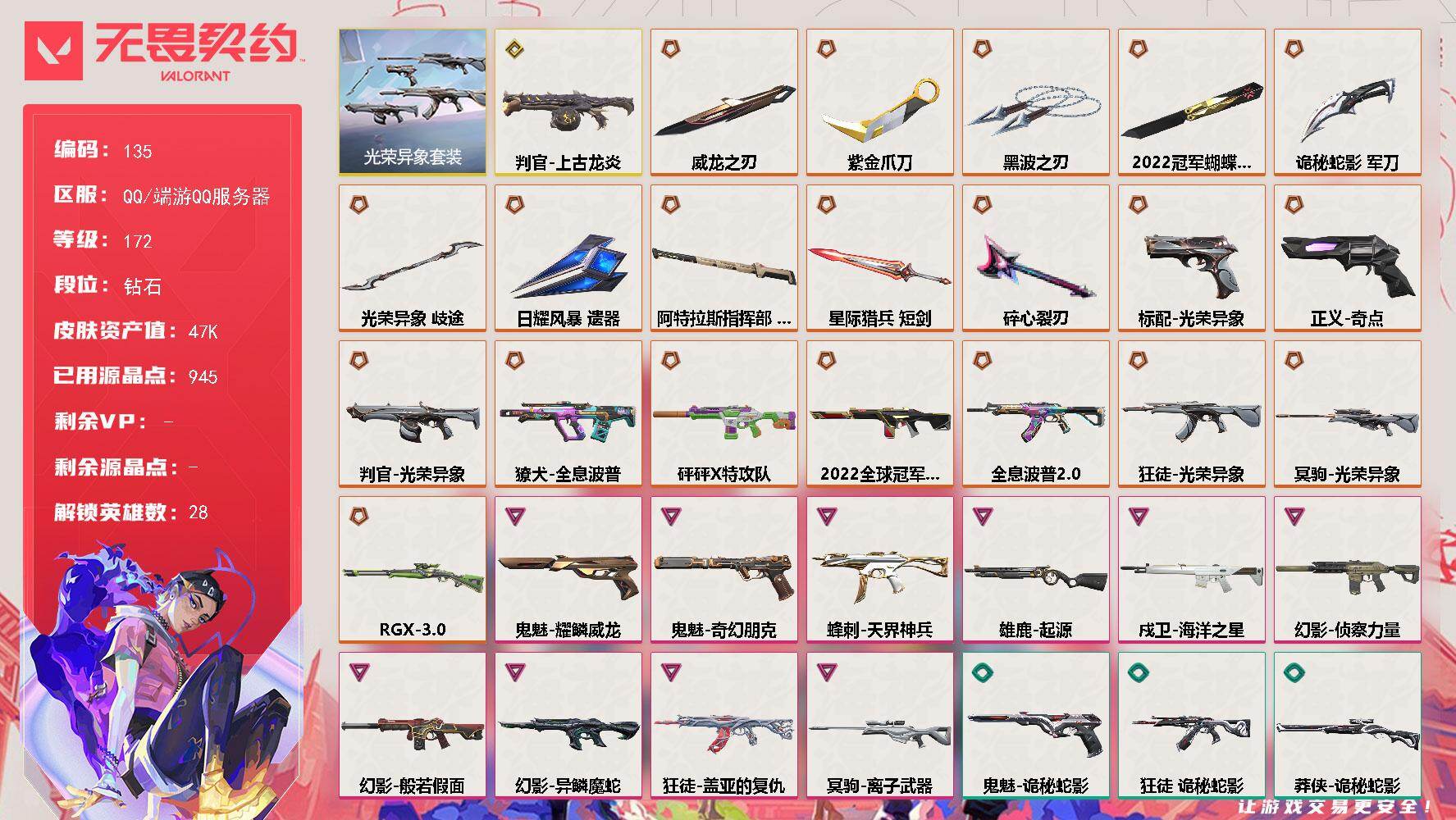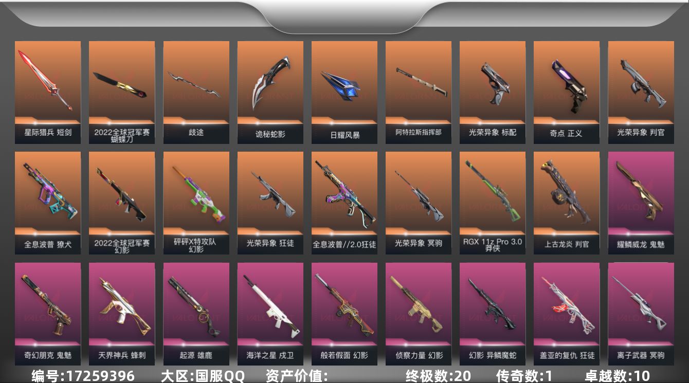 [17259396]【135】【套装】:2022全球冠军赛套装,光荣异象套装 【英雄】:幻棱,炼狱,维斯,暮蝶,钛狐,壹决,铁臂,捷风,雷兹,幽影,不死鸟,贤者,猎枭,蝰蛇,零,芮娜,奇乐,尚勃勒,霓虹,斯凯,夜露,星礈,K/O,海神,盖可,黑梦,钢锁 【近战武器】:近战武器-2022全球冠军赛 蝴蝶刀,近战武器-碎心裂刃,近战武器-光荣异象 歧途,近战武器-紫金爪刀,近战武器-黑波之刃,近战武器-威龙之刃,近战武器-诡秘蛇影 军刀,近战武器-日耀风暴 遗器,近战武器-阿特拉斯指挥部 甩棍,近战武器-星际猎兵 短剑 【狂徒】:狂徒-全息波普//2.0,狂徒-光荣异象,狂徒-盖亚的复仇,狂徒-诡秘蛇影 【幻影】:幻影-2022全球冠军赛,幻影-砰砰X特攻队,幻影-般若假面,幻影-侦察力量,幻影-异鳞魔蛇,幻影-末日之翼 【戍卫】:戍卫-海洋之星,戍卫-折光棱晶 【獠犬】:獠犬-全息波普 【冥驹】:冥驹-光荣异象,冥驹-离子武器 【飞将】:飞将-末日之翼 【莽侠】:莽侠-RGX 11z Pro//3.0,莽侠-诡秘蛇影 【奥丁】:奥丁-末日之翼 【判官】:判官-上古龙炎,判官-光荣异象,判官-诡秘蛇影 【雄鹿】:雄鹿-起源 【蜂刺】:蜂刺-天界神兵,蜂刺-折光棱晶 【标配】:标配-光荣异象,标配-折光棱晶 【正义】:正义-奇点 【鬼魅】:鬼魅-奇幻朋克,鬼魅-耀鳞威龙,鬼魅-诡秘蛇影 【短炮】:短炮-末日之翼 【卡面】:无畏契约GO!第一卷:芮娜 卡面,珍珠棘贝 卡面,无畏契约GO!第一卷:零 卡面,《双城之战》金克丝 卡面,代号红色 卡面,新兵报到 卡面,V契约 卡面,无畏契约 卡面 【喷漆】:霓光四射 喷漆,买装还是存钱 喷漆,胜利属于无畏契约 喷漆,GLHF 喷漆,无畏契约 喷漆 【挂饰】:V25第六幕:超凡 挂饰,鱼骨头 挂饰,薰衣草之心 挂饰,超能偶像 挂饰,天外飞客 挂饰,《双城之战》魄罗 挂饰,无畏契约 纪念币 挂饰
