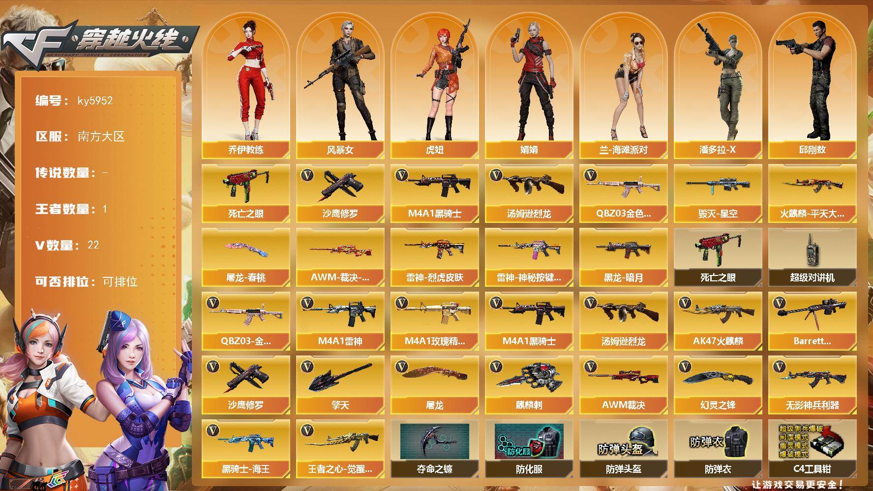 [17259480]南方大区-23V-1王者武器数-0炫金武器数 【热门武器】:QBZ03-金色蔷薇,死亡之眼,M4A1-黑骑士,汤姆逊-烈龙*3,沙鹰-修罗*2 【皮肤】:AWM-裁决-凤灵皮肤,雷神-烈虎皮肤,雷神-神秘按键 皮肤,火麒麟-平天大圣,毁灭-星空,黑龙-暗月*3,屠龙-春桃 皮肤 【角色】:乔伊教练,风暴女,虎妞,娟娟,兰-海滩派对,潘多拉-X,邱刚敖,斯沃特-X 【暴走生化】:死亡之眼,超级对讲机 【英雄级武器】:AK47-火麒麟,M4A1-雷神,M4A1-黑骑士,无影-神兵利器,M4A1-玫瑰精灵,QBZ03-金色蔷薇,王者之心-觉醒版,黑骑士-海王,Barrett-毁灭,AWM-裁决*2,汤姆逊-烈龙*3,沙鹰-修罗*2,屠龙*3,擎天*2,麒麟刺,幻灵之锋 【道具】:夺命之镰,防化服,防弹头盔,防弹衣,C4工具钳,手雷包*2 【特殊枪械】:1黑骑士,3烈龙