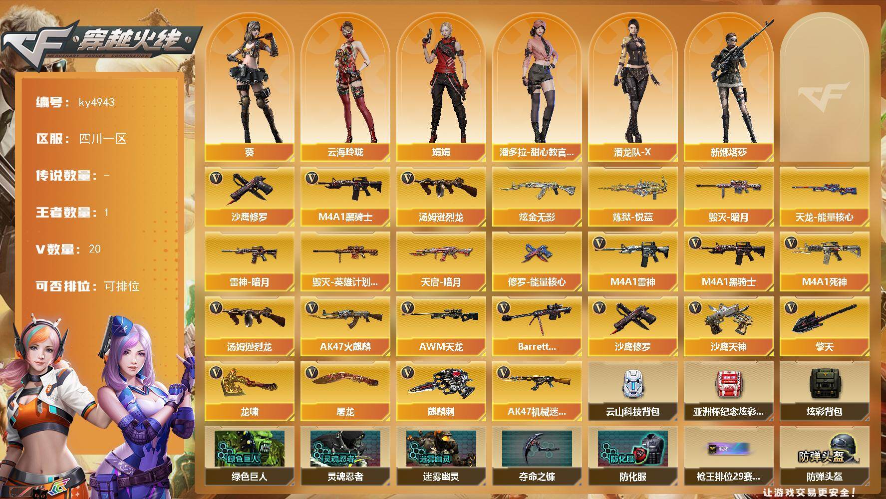 [17259546]四川一区-20V-1王者-1炫金 【热门武器】:M4A1-黑骑士,汤姆逊-烈龙,沙鹰-修罗*2 【王者炫金武器】:炼狱-悦蓝,炫金无影 【皮肤】:雷神-暗月,毁灭-暗月,毁灭-英雄计划 皮肤,天启-暗月*2,天龙-能量核心,修罗-能量核心 【角色】:葵,云海玲珑,娟娟,潘多拉-甜心教官,潜龙队-X,新娜塔莎 【英雄级武器】:AK47-火麒麟,M4A1-雷神*2,M4A1-黑骑士,M4A1-死神,AK47-机械迷城,AWM-天龙,Barrett-毁灭,汤姆逊-烈龙,沙鹰-修罗*2,沙鹰-天神,屠龙*2,龙啸,擎天,麒麟刺*2 【道具】:云山科技背包,亚洲杯纪念炫彩背包,炫彩背包,绿色巨人,灵魂忍者,迷雾幽灵,夺命之镰,防化服*3,枪王排位29赛季金色流光,防弹头盔*7,防弹衣*7,C4工具钳*7,手雷包*7 【特殊枪械】:1黑骑士,1烈龙