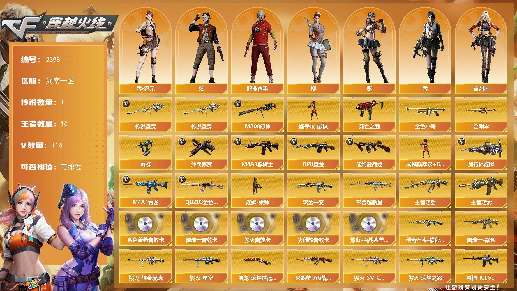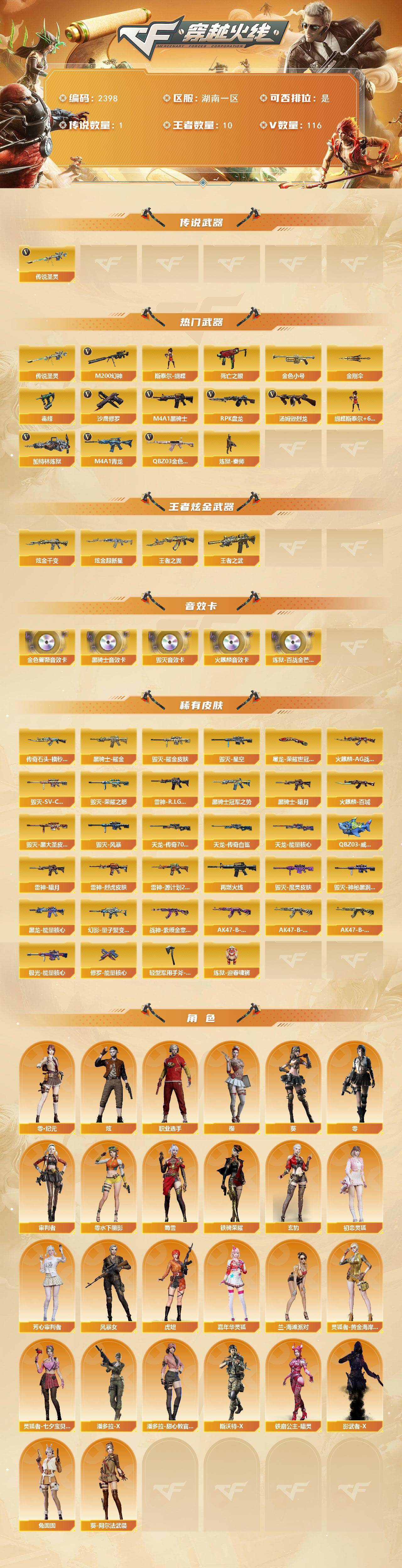 [17260099]湖南一区-123V-10王者武器数-2炫金武器数 【传说武器】:传说圣灵 【热门武器】:传说圣灵,QBZ03-金色蔷薇,M4A1-青龙,M200-幻神,死亡之眼,金色小号,毒蜂,M4A1-黑骑士,汤姆逊-烈龙*6,RPK-盘龙*6,加特林-炼狱,斯泰尔-蝴蝶,炼狱-秦师,沙鹰-修罗*3,金刚伞 【王者炫金武器】:王者之翼,王者之武,炫金千变,炫金超新星 【音效卡】:AK47-火麒麟音效卡,M4A1-黑骑士音效卡,Barrett-毁灭音效卡,QBZ03-金色蔷薇音效卡,炼狱-百战金芒-庆典舞曲音效卡 【皮肤】:QBZ03-威猛悍鲨,雷神-暗月,雷神-R.LGD-CFPLS18冠军,雷神-烈虎皮肤,雷神-源计划2.0专属 皮肤,M4A1-再燃火线,火麒麟-AG战队皮肤,传奇石头-横秒之巅,火麒麟-百城,毁灭-荣耀之怒,毁灭耀金皮肤,毁灭-星空,毁灭-SV-CFPLS16冠军,毁灭-黑大圣皮肤,毁灭-风暴,毁灭-魔灵皮肤,毁灭-神秘黑洞皮肤,黑龙-能量核心,黑骑士-暗月,黑骑士耀金皮肤,黑骑士-冠军之势,幻影-量子聚变 皮肤,战神-紫绶金章皮肤,AK47-B-常胜将军-曹操,AK47-B-常胜将军-刘备,AK47-B-常胜将军-孙权,天龙-能量核心,AWM-天龙-传奇70KG,AWM-天龙-传奇白鲨,极光-能量核心,炼狱-迎春啸狮,修罗-能量核心,屠龙-荣耀世冠AG,轻型军用手斧-再燃火线 【角色】:零,葵,樱,炫,玄豹,审判者,零·纪元,葵-阿尔法武装,初恋灵狐,芳心审判者,风暴女,虎妞,嘉年华灵狐,兰-海滩派对,零-水下丽影,灵狐者-黄金海岸,灵狐者-七夕宝贝,潘多拉-X,潘多拉-甜心教官,斯沃特-X,蜀雪,铁骑荣耀,兔囡囡,铁扇公主-暗灵,影武者-X,职业选手 【人偶武器】:炼狱-秦师,异变清道夫-蛇影双骄,斯泰尔-蝴蝶,MAC-10-千针棘鲨,AWM-灵狐-15周年嘉年华,M37-葵,COP-旗袍,迷你裂空之翼*13,夺魂,迷你牛牛,迷你生化手雷,生化手雷-机甲核心,深渊终结者手雷,闪光弹-貂蝉,高爆手雷-大乔,迷你艾比,灵狐娃娃手雷 【暴走生化】:毒蜂,死亡之眼,超级对讲机 【挑战大师】:冰龙粉碎者-白马银枪*2,激光毁灭者III-白马银枪*2,VEPR-12-金魔,激光毁灭者III*4,机甲撕裂者III,神圣爆裂者-末日III*2,阐释者III 【英雄级武器
