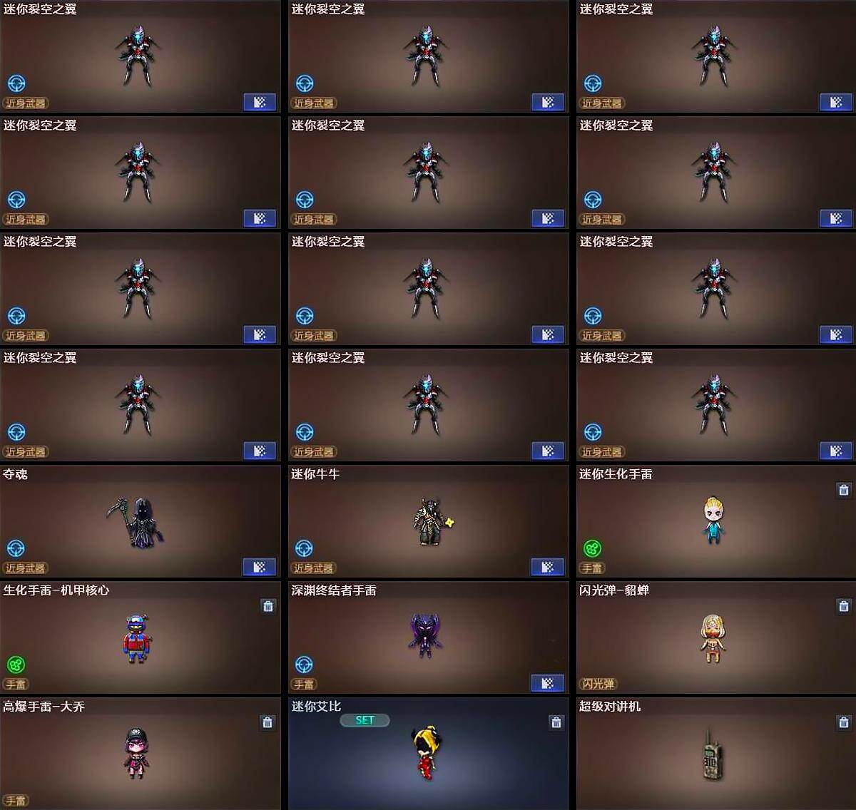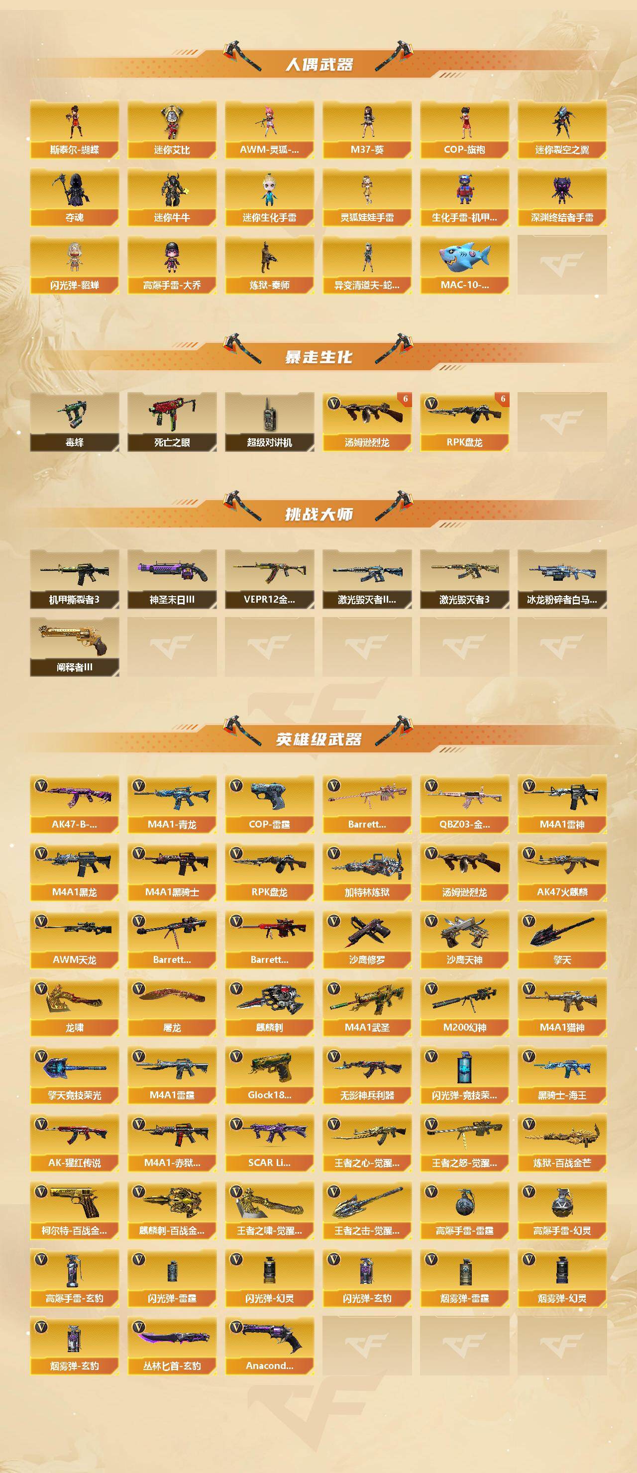 【人偶武器】:炼狱-秦师,异变清道夫-蛇影双骄,斯泰尔-蝴蝶,MAC-10-千针棘鲨,AWM-灵狐-15周年嘉年华,M37-葵,COP-旗袍,迷你裂空之翼*13,夺魂,迷你牛牛,迷你生化手雷,生化手雷-机甲核心,深渊终结者手雷,闪光弹-貂蝉,高爆手雷-大乔,迷你艾比,灵狐娃娃手雷