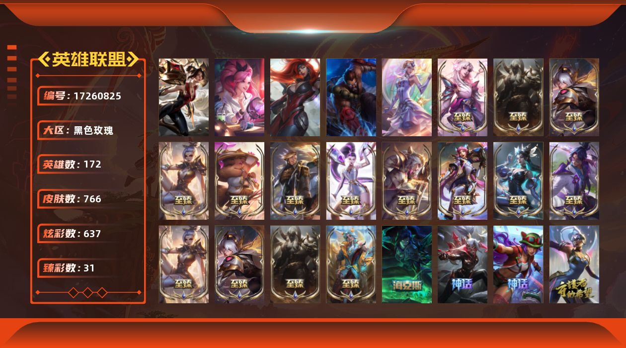 [17260825]【特价出售/店主推荐】钻石段位-172英雄-766皮肤-637炫彩-6终极-22神话-112限定-72传说-163史诗