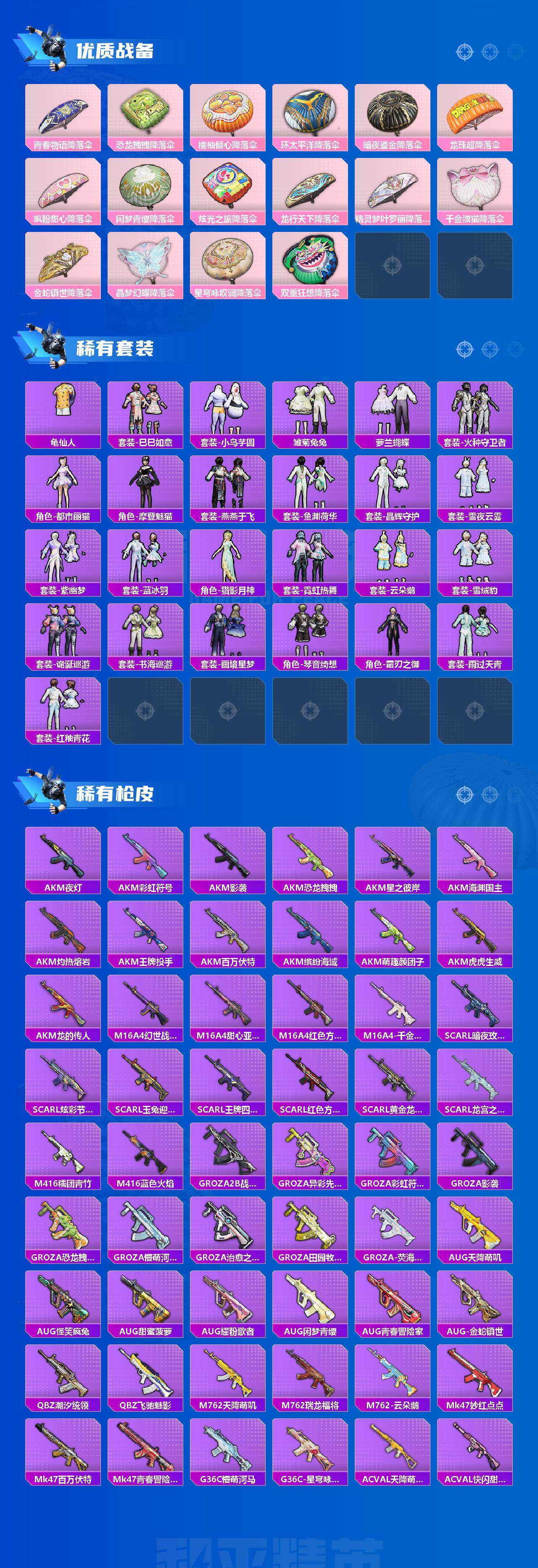 AKM-梦之光华,SCAR-L-青春物语,SCAR-L-金蛇镇世,M416-风花雪月,GROZA-巴啦啦小魔仙,AUG-星之彼岸,M762-激战未来,UMP45-恐龙拽拽,汤姆逊-怪笑疯兔,野牛-青空秋雨,Kar98K-绿意幻情,Kar98K-巳巳如意,S12K-海渊国主,MG3-酷泡奶龙