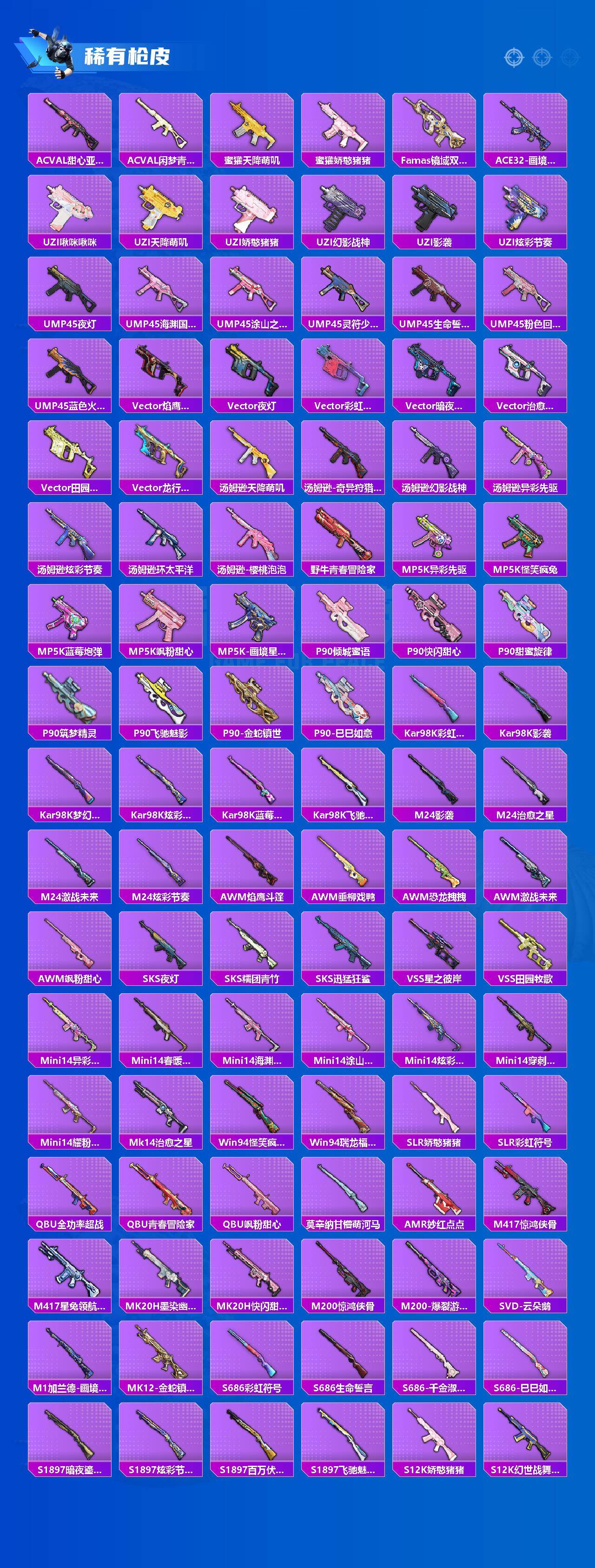 【粉色枪皮】:AKM-梦之光华,SCAR-L-青春物语,SCAR-L-金蛇镇世,M416-风花雪月,GROZA-巴啦啦小魔仙,AUG-星之彼岸,M762-激战未来,UMP45-恐龙拽拽,汤姆逊-怪笑疯兔,野牛-青空秋雨,AKS-74U-森灵之息,Kar98K-绿意幻情,Kar98K-巳巳如意,Mk14-爆裂游戏,Mk14-福马献瑞,S12K-海渊国主,MG3-酷泡奶龙