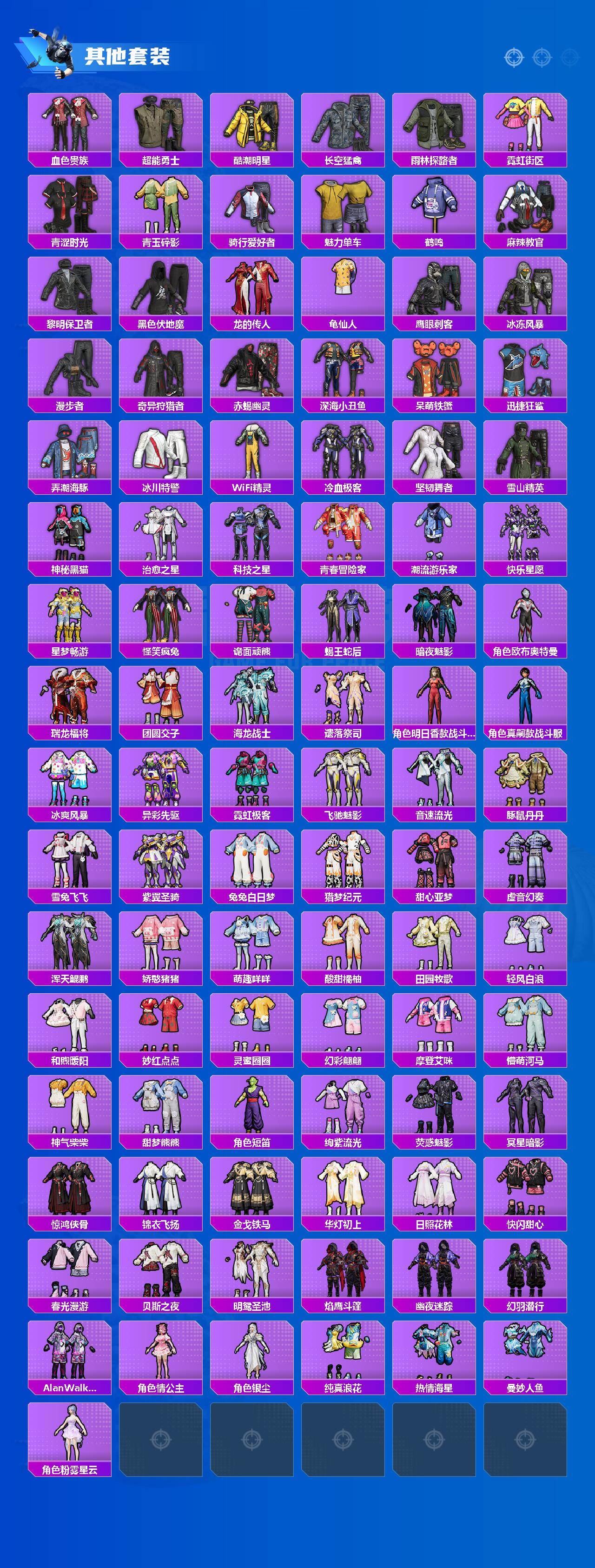 【粉色套装】:粉装-数码大师,粉装-梦幻火箭,粉装-放客神游,粉装-翡翠骑士,粉装-星之彼岸,粉装-齐天大圣,角色-洛天依,粉装-黄伞悠悠,粉装-黑伞漫漫,角色-2号机款机体服,粉装-恐龙拽拽,粉装-炙焰牛王,粉装-第五大道,粉装-未来歌姬,粉装-闲梦青缨,角色-圣堂之誓,角色-美琪,角色-千金淑猫,角色-狂魅哈莉