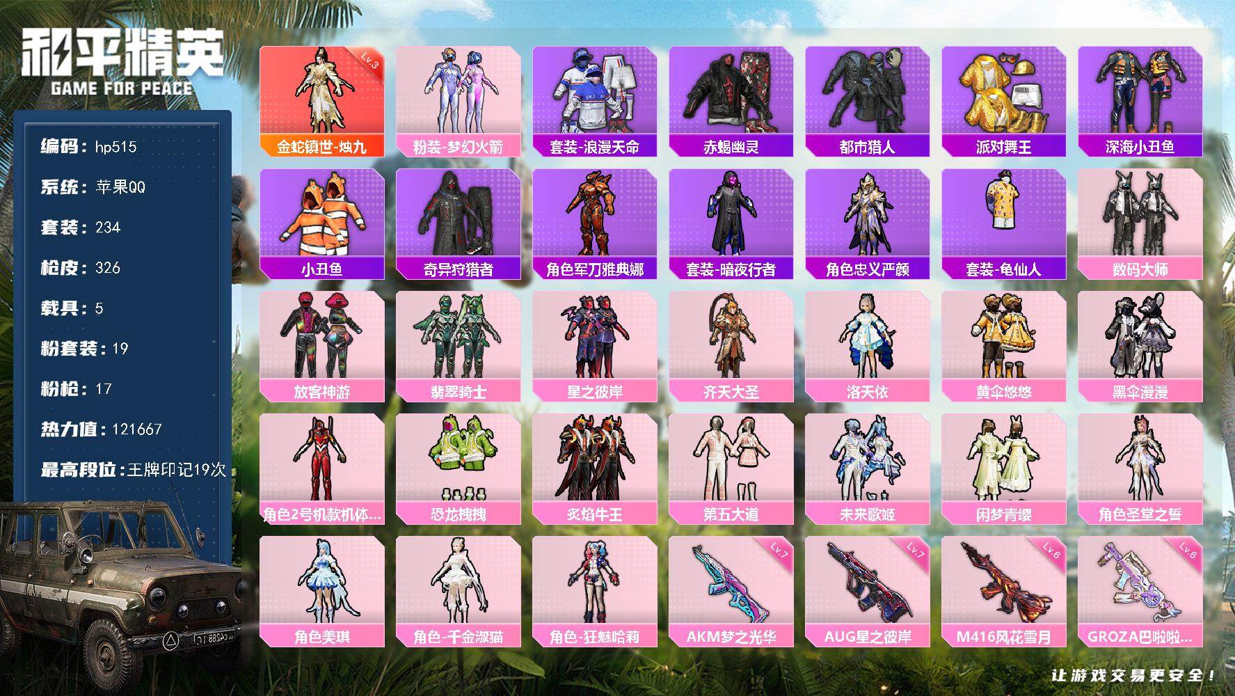 [17260954]苹果 手Q-1神装-19粉装-17特效枪-5载具-4粉色飞行器-121667热力值-19王牌印记-234套装-326枪皮