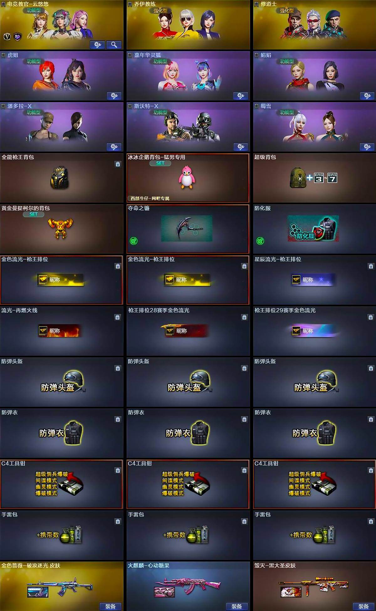 【道具】:全能枪王背包,冰冰企鹅背包-猛男专用,超级背包,黄金曼提柯尔的背包,夺命之镰,防化服,金色流光-枪王排位*2,星辰流光-枪王排位,流光-再燃火线,枪王排位28赛季金色流光,枪王排位29赛季金色流光,防弹头盔*3,防弹衣*3,C4工具钳*3,手雷包*3
