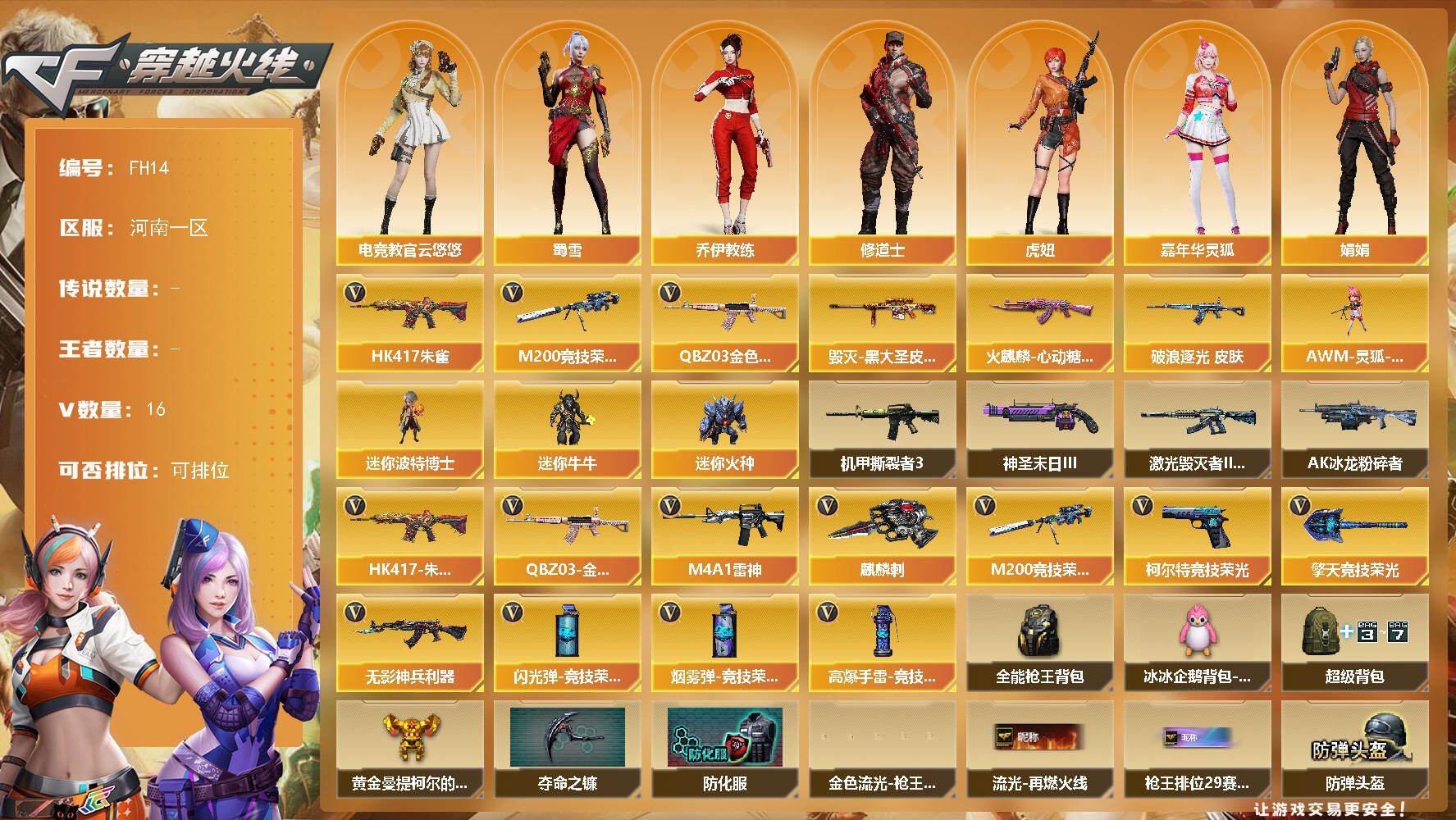 [17260912]河南一区-18V-0王者武器数-0炫金武器数 【热门武器】:QBZ03-金色蔷薇,HK417-朱雀,M200-竞技荣光 【皮肤】:金色蔷薇-破浪逐光 皮肤,火麒麟-心动糖果,毁灭-黑大圣皮肤 【角色】:电竞教官-云悠悠,乔伊教练,修道士,虎妞,嘉年华灵狐,娟娟,潘多拉-X,斯沃特-X,蜀雪 【人偶武器】:AWM-灵狐-15周年嘉年华,迷你波特博士*5,迷你牛牛,迷你火种*6 【挑战大师】:AK47-冰龙粉碎者,激光毁灭者III-白马银枪,机甲撕裂者III,神圣爆裂者-末日III 【英雄级武器】:M4A1-雷神,HK417-朱雀,无影-神兵利器,QBZ03-金色蔷薇,M200-竞技荣光,柯尔特-竞技荣光,麒麟刺,擎天-竞技荣光,高爆手雷-竞技荣光,闪光弹-竞技荣光,烟雾弹-竞技荣光 【道具】:全能枪王背包,冰冰企鹅背包-猛男专用,超级背包,黄金曼提柯尔的背包,夺命之镰,防化服,金色流光-枪王排位*2,星辰流光-枪王排位,流光-再燃火线,枪王排位28赛季金色流光,枪王排位29赛季金色流光,防弹头盔*3,防弹衣*3,C4工具钳*3,手雷包*3 【特殊枪械】: