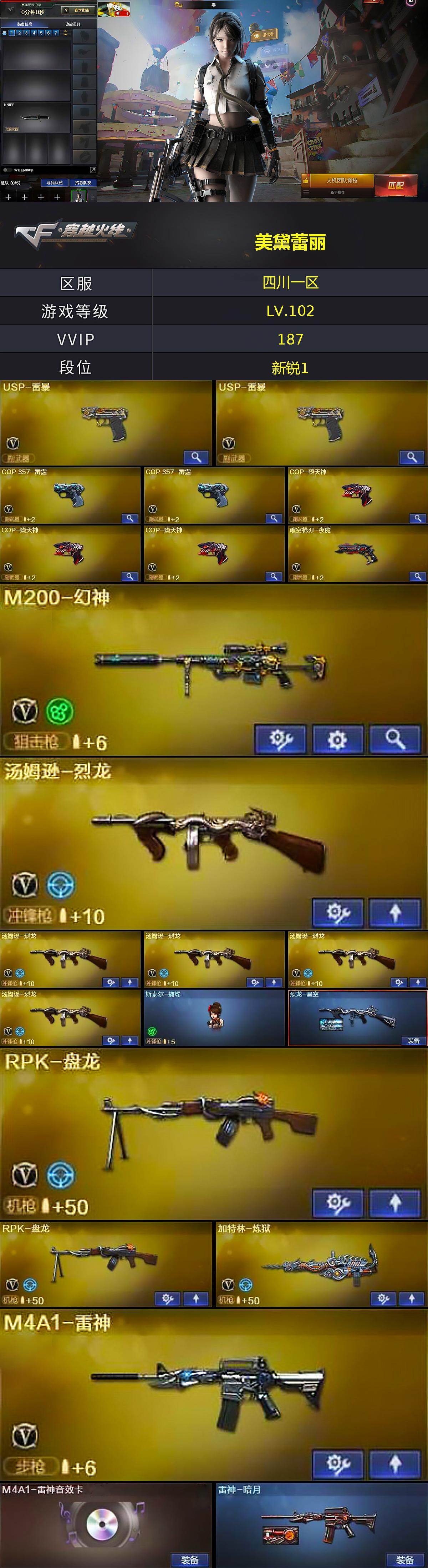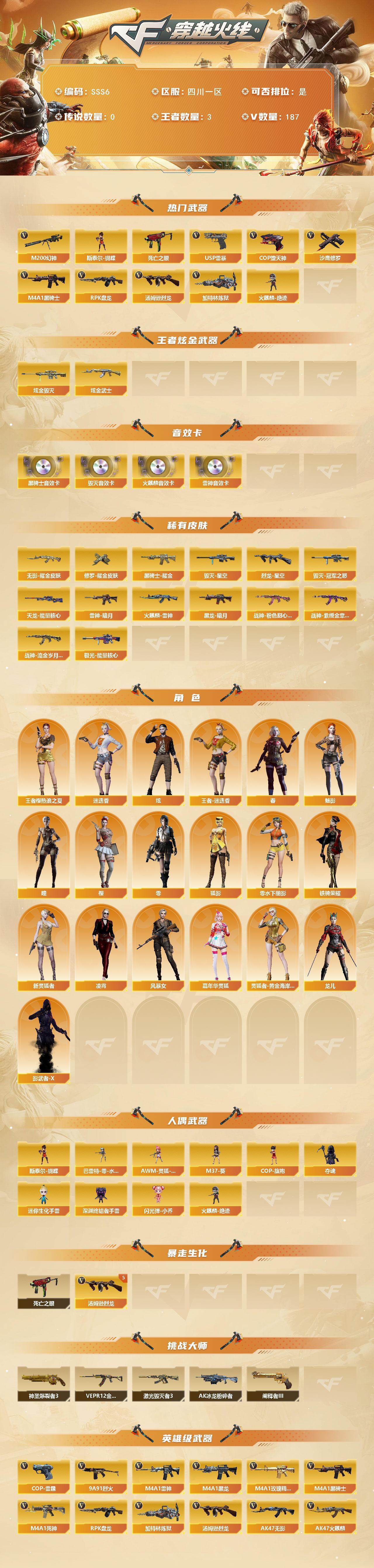 [17260893]四川一区-190V-3王者武器数-3炫金武器数 【热门武器】:M200-幻神,死亡之眼*4,M4A1-黑骑士*2,汤姆逊-烈龙*5,RPK-盘龙*2,加特林-炼狱,斯泰尔-蝴蝶,火麒麟-绝迹,USP-雷暴*2,COP-堕天神*3,沙鹰-修罗*4 【王者炫金武器】:炫金武士,炫金毁灭*2 【音效卡】:AK47-火麒麟音效卡,M4A1-雷神音效卡,M4A1-黑骑士音效卡,Barrett-毁灭音效卡*6 【皮肤】:烈龙-星空,雷神-暗月,火麒麟-雷神,毁灭-星空,毁灭-冠军之怒,黑龙-暗月,黑骑士耀金皮肤,无影耀金皮肤,战神-粉色甜心皮肤,战神-紫绶金章皮肤*13,战神-流金岁月皮肤*5,天龙-能量核心,极光-能量核心*3,修罗耀金皮肤 【角色】:零,樱,瞳,魅影,炫,春,迷迭香,凌霄,王者樱-热浪之夏,王者-迷迭香,狐影,风暴女,嘉年华灵狐,零-水下丽影,灵狐者-黄金海岸,龙儿,铁骑荣耀,新灵狐者,影武者-X 【人偶武器】:火麒麟-绝迹,斯泰尔-蝴蝶,巴雷特-零-水下丽影,AWM-灵狐-15周年嘉年华,M37-葵*2,COP-旗袍,夺魂,迷你生化手雷,深渊终结者手雷,闪光弹-小乔 【暴走生化】:死亡之眼*4 【挑战大师】:神圣爆裂者III,AK47-冰龙粉碎者,VEPR-12-金魔,激光毁灭者III,阐释者III 【英雄级武器】:AK47-火麒麟*2,M4A1-黑龙*3,M4A1-雷神,M4A1-黑骑士*2,AK47-无影*3,M4A1-死神,AK47-黑武士*2,AN94-超新星,M4A1-武圣,AK47-机械迷城,M4A1-龙血*3,M4A1-雷霆,AK47-雷暴,M4A1-堕天神,M4A1-夜魔,黑武士-锦绣游龙,M4A1-玫瑰精灵,9A91-烈火,王者之幻-觉醒版*2,AK-47-猩红传说*13,AK47-B-战神,AWM-天龙,Barrett-毁灭*4,Barrett-极光,M200-幻神,RPK-盘龙*2,加特林-炼狱,汤姆逊-烈龙*5,AA-12-雷霆,沙鹰-修罗*4,沙鹰-天神*4,USP-雷暴*2,COP-雷霆*2,COP-堕天神*3,破空枪刃-夜魔,屠龙*4,龙啸*2,麒麟刺-堕天神,马来剑-夜魔,擎天*2,麒麟刺*2,龙啸-堕天神,斩神刀-雷暴,王者之啸-觉醒版,高爆手雷-雷霆*8,高爆手雷-雷暴*7,高爆手雷-堕天神*7,高爆手雷-夜魔*7,闪