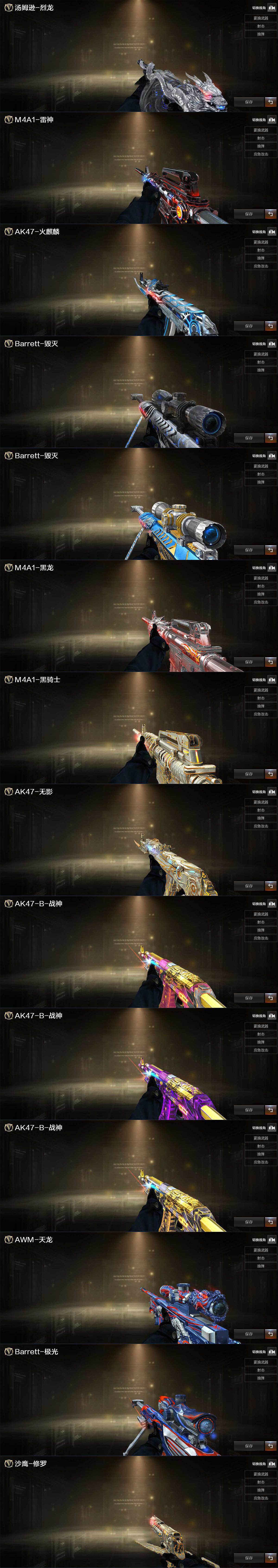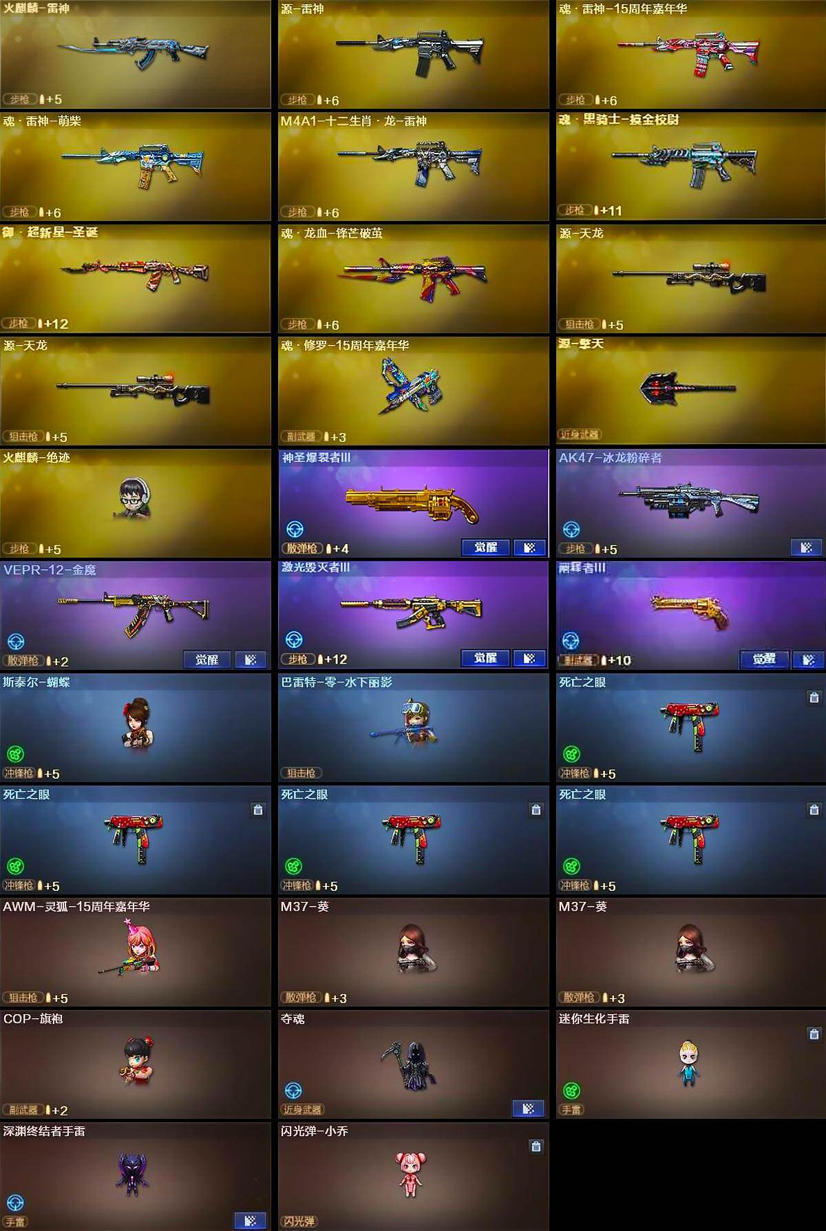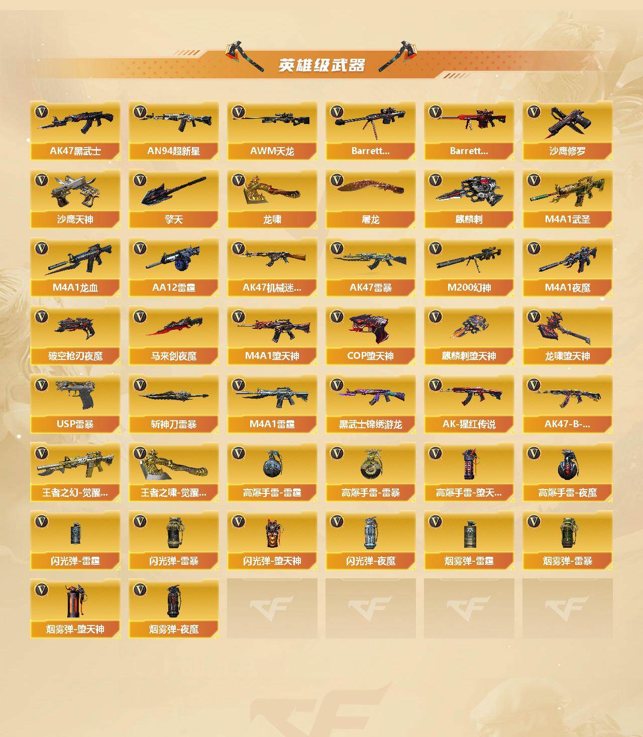 【英雄级武器】:AK47-火麒麟*2,M4A1-黑龙*3,M4A1-雷神,M4A1-黑骑士*2,AK47-无影*3,M4A1-死神,AK47-黑武士*2,AN94-超新星,M4A1-武圣,AK47-机械迷城,M4A1-龙血*3,M4A1-雷霆,AK47-雷暴,M4A1-堕天神,M4A1-夜魔,黑武士-锦绣游龙,M4A1-玫瑰精灵,9A91-烈火,王者之幻-觉醒版*2,AK-47-猩红传说*13,AK47-B-战神,AWM-天龙,Barrett-毁灭*4,Barrett-极光,M200-幻神,RPK-盘龙*2,加特林-炼狱,汤姆逊-烈龙*5,AA-12-雷霆,沙鹰-修罗*4,沙鹰-天神*4,USP-雷暴*2,COP-雷霆*2,COP-堕天神*3,破空枪刃-夜魔,屠龙*4,龙啸*2,麒麟刺-堕天神,马来剑-夜魔,擎天*2,麒麟刺*2,龙啸-堕天神,斩神刀-雷暴,王者之啸-觉醒版,高爆手雷-雷霆*8,高爆手雷-雷暴*7,高爆手雷-堕天神*7,高爆手雷-夜魔*7,闪