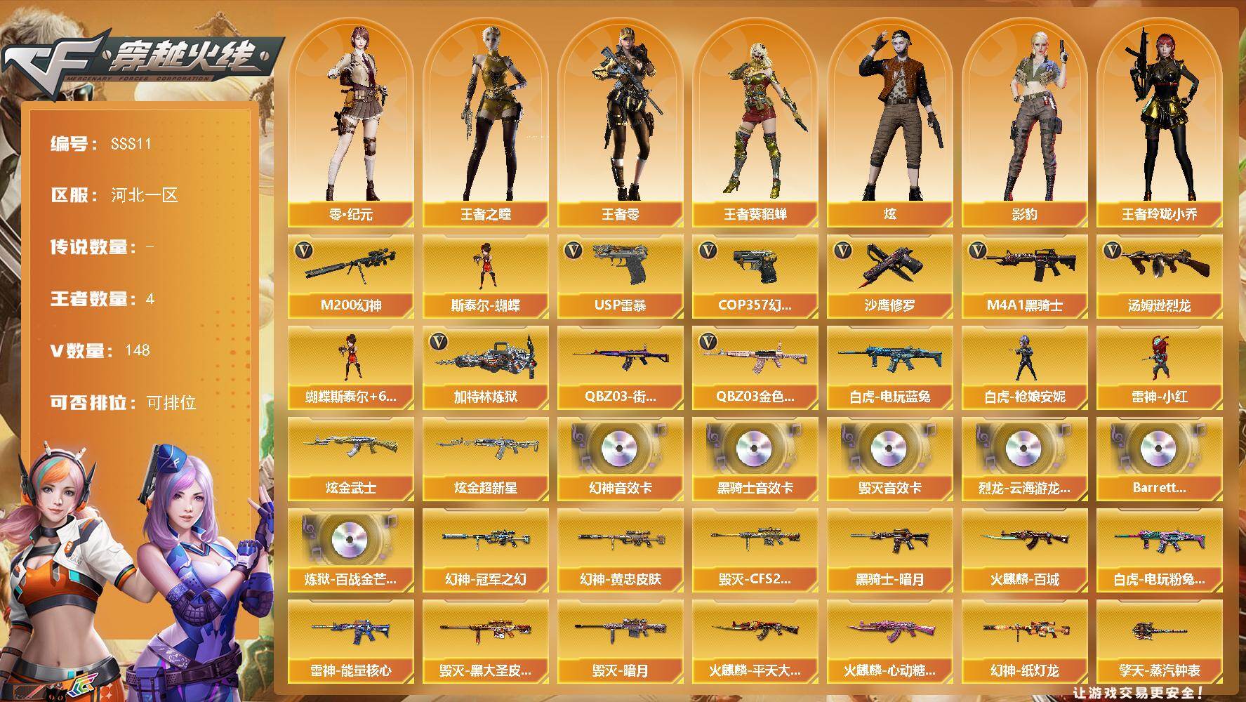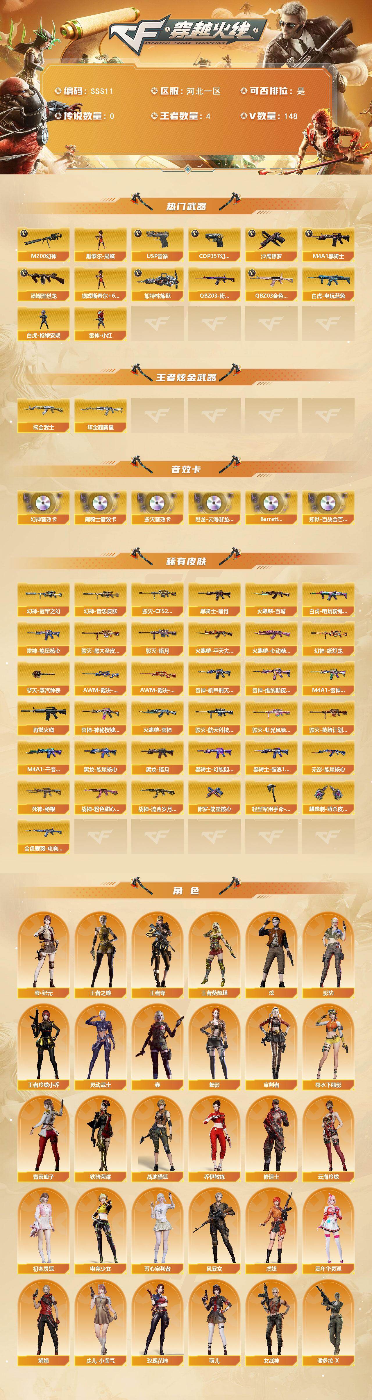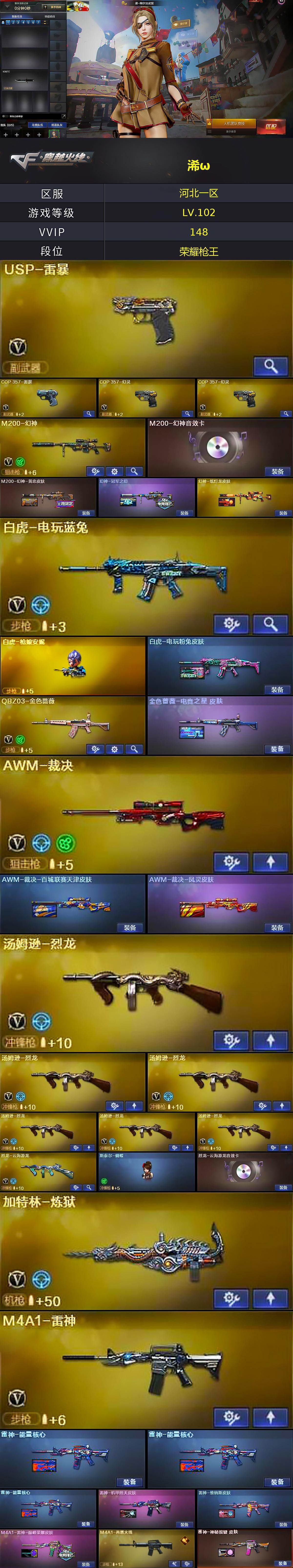 [17261166]河北一区-157V-4王者武器数-2炫金武器数 【热门武器】:QBZ03-金色蔷薇,M200-幻神,白虎-电玩蓝兔,QBZ03-街机,M4A1-黑骑士,汤姆逊-烈龙*6,加特林-炼狱,斯泰尔-蝴蝶,白虎-枪娘安妮,雷神-小红,USP-雷暴,COP 357-幻灵*2,沙鹰-修罗*3 【王者炫金武器】:炫金武士,炫金超新星 【音效卡】:烈龙-云海游龙音效卡,M200-幻神音效卡,M4A1-黑骑士音效卡,Barrett-毁灭音效卡,Barrett-碧霄极光音效卡,炼狱-百战金芒-庆典舞曲音效卡 【皮肤】:M200-幻神-黄忠皮肤,幻神-冠军之幻,幻神-纸灯龙皮肤,白虎-电玩粉兔皮肤,金色蔷薇-电竞之星 皮肤,AWM-裁决-百城联赛天津皮肤,AWM-裁决-凤灵皮肤,雷神-能量核心*3,雷神-机甲刑天皮肤,雷神-维纳斯皮肤,M4A1-雷神-巅峰荣耀皮肤,M4A1-再燃火线,雷神-神秘按键 皮肤,火麒麟-雷神,火麒麟-平天大圣,火麒麟-百城,火麒麟-心动糖果,毁灭-暗月,毁灭-CFS2020,毁灭-黑大圣皮肤,毁灭-航天科技皮肤,毁灭-虹光风暴 皮肤,毁灭-英雄计划 皮肤,M4A1-千变-孔明皮肤,黑龙-能量核心,黑龙-暗月,黑骑士-暗月,黑骑士-幻能朋克 皮肤,黑骑士-破浪10年皮肤,无影-能量核心,死神-秘银,战神-粉色甜心皮肤,战神-流金岁月皮肤,修罗-能量核心*2,轻型军用手斧-再燃火线,擎天-蒸汽钟表 皮肤,麒麟刺-萌杀皮肤 【角色】:魅影,炫,春,影豹,审判者,零·纪元,战地猎狐,王者-葵-貂蝉,王者-零,王者之瞳,王者玲珑-小乔,乔伊教练,修道士,云海玲珑,葵-阿尔法武装,初恋灵狐,电竞少女,芳心审判者,风暴女*2,虎妞,嘉年华灵狐,娟娟,0号玩家,灵动武士,零-水下丽影,龙儿-小淘气,玫瑰花神,萌儿,女战神,潘多拉-X,潘多拉-甜心教官,潜龙队-X,青霞仙子,蛇姬,斯沃特-X,铁骑荣耀,兔囡囡,维纳斯,新娜塔莎,雪莉杨-摸金校尉,夜玫瑰-幻能朋克,樱-战斗天使,影武者-X 【人偶武器】:雷神-小红,白虎-枪娘安妮,斯泰尔-蝴蝶,AWM-灵狐-15周年嘉年华,COP-旗袍,迷你生化手雷,生化手雷-机甲核心*2,迷你深渊冰龙-王绿豆,迷你超能女侍,灵狐娃娃手雷 【暴走生化】:KAC-狂怒咆哮,双面神 【挑战大师】:神圣爆裂者III,激光毁灭者III-白马银枪,阐释