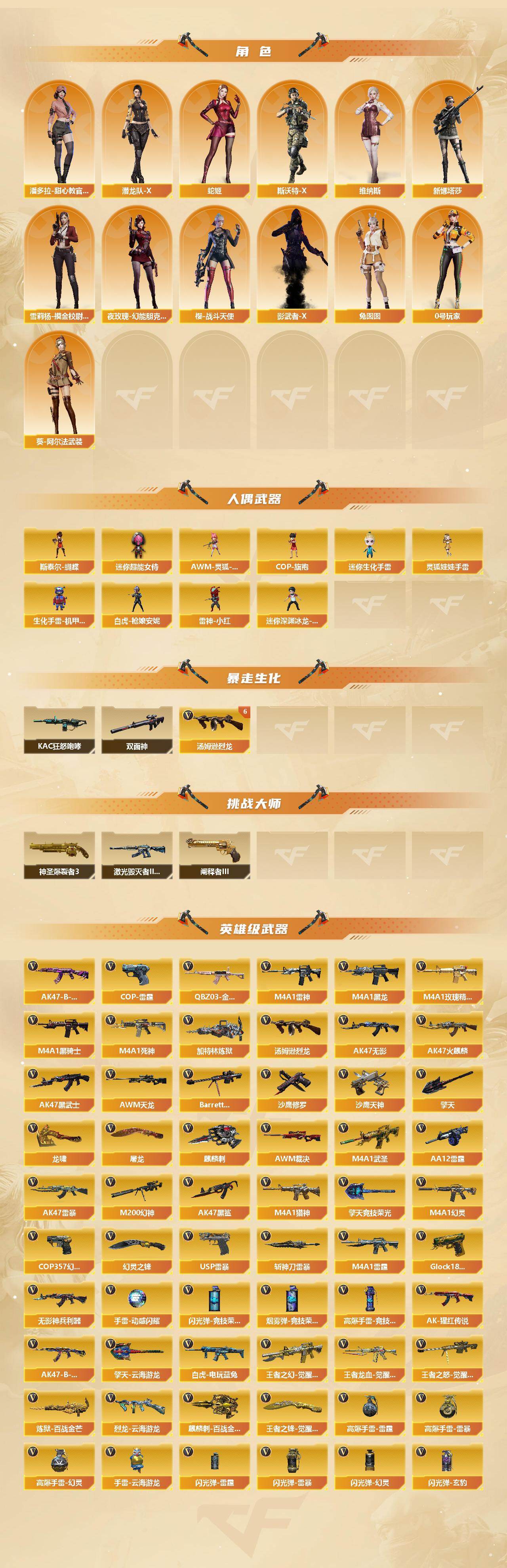 【皮肤】:M200-幻神-黄忠皮肤,幻神-冠军之幻,幻神-纸灯龙皮肤,白虎-电玩粉兔皮肤,金色蔷薇-电竞之星 皮肤,AWM-裁决-百城联赛天津皮肤,AWM-裁决-凤灵皮肤,雷神-能量核心*3,雷神-机甲刑天皮肤,雷神-维纳斯皮肤,M4A1-雷神-巅峰荣耀皮肤,M4A1-再燃火线,雷神-神秘按键 皮肤,火麒麟-雷神,火麒麟-平天大圣,火麒麟-百城,火麒麟-心动糖果,毁灭-暗月,毁灭-CFS2020,毁灭-黑大圣皮肤,毁灭-航天科技皮肤,毁灭-虹光风暴 皮肤,毁灭-英雄计划 皮肤,M4A1-千变-孔明皮肤,黑龙-能量核心,黑龙-暗月,黑骑士-暗月,黑骑士-幻能朋克 皮肤,黑骑士-破浪10年皮肤,无影-能量核心,死神-秘银,战神-粉色甜心皮肤,战神-流金岁月皮肤,修罗-能量核心*2,轻型军用手斧-再燃火线,擎天-蒸汽钟表 皮肤,麒麟刺-萌杀皮肤