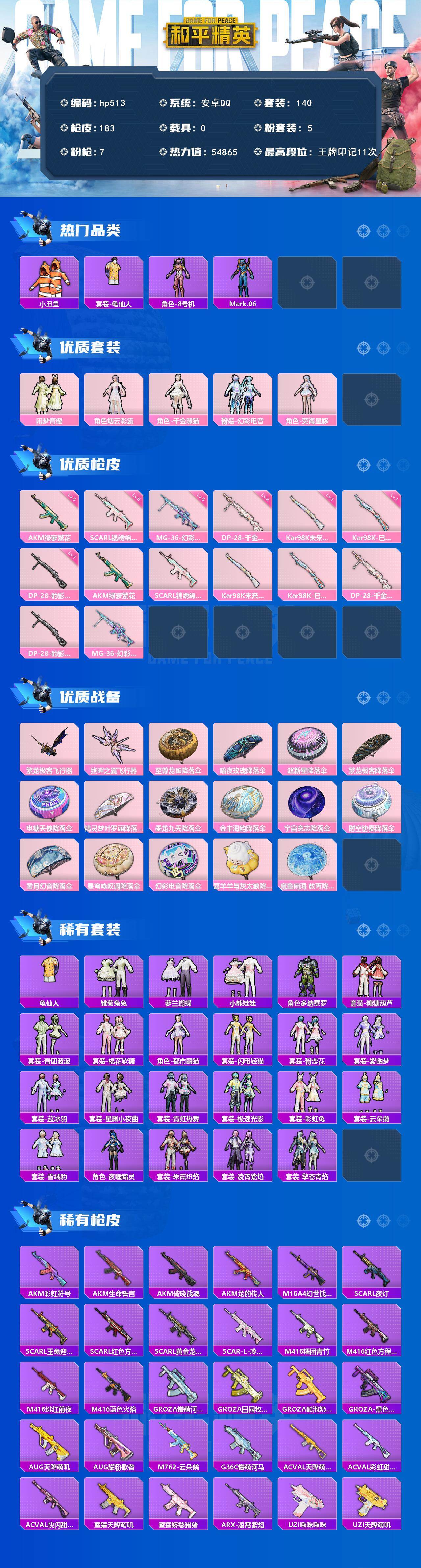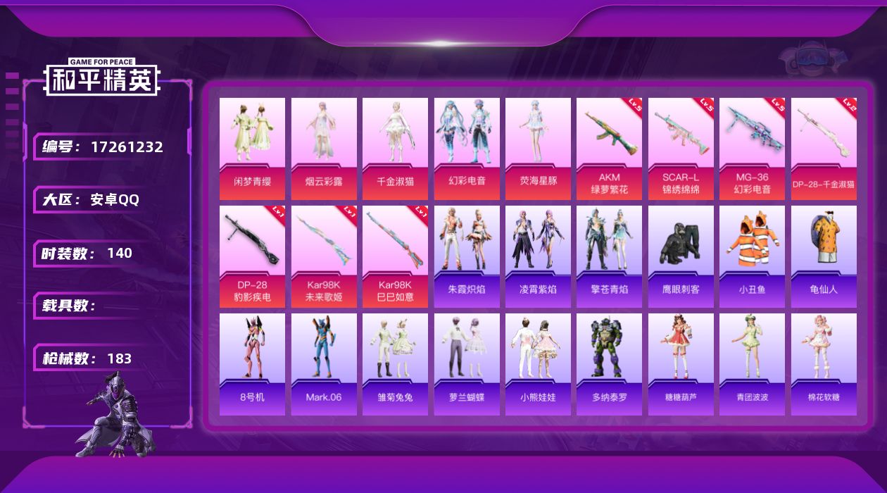 [17261232]安卓 手Q-5粉装-7特效枪-0载具-2粉色飞行器-54865热力值-11王牌印记-140套装-183枪皮 【热门品类】:套装-小丑鱼,套装-龟仙人,角色-8号机,角色-Mark.06 【粉色套装】:粉装-闲梦青缨,角色-烟云彩露,角色-千金淑猫,粉装-幻彩电音,角色-荧海星豚 【粉色枪皮等级】:AKM-绿萝繁花(五级),SCAR-L-锦绣绵绵(五级),Kar98K-未来歌姬(一级),Kar98K-巳巳如意(一级),DP-28-千金淑猫(二级),DP-28-豹影疾电(一级),MG-36-幻彩电音(五级) 【粉色枪皮】:AKM-绿萝繁花,SCAR-L-锦绣绵绵,Kar98K-未来歌姬,Kar98K-巳巳如意,DP-28-千金淑猫,DP-28-豹影疾电,MG-36-幻彩电音 【粉色飞行器】:繁龙极客飞行器,终晖之翼飞行器 【粉色降落伞】:至尊龙雀降落伞,暗夜玫瑰降落伞,超新星降落伞,繁龙极客降落伞,电糖天使降落伞,精灵梦叶罗丽降落伞,墨龙九天降落伞,金丰海韵降落伞,宇宙意志降落伞,时空协奏降落伞,雪月幻音降落伞,星穹咏叹调降落伞,幻彩电音降落伞,喜羊羊与灰太狼降落伞,魔童闹海 敖丙降落伞 【稀有套装】:套装-龟仙人,套装-雏菊兔兔,套装-萝兰蝴蝶,套装-小熊娃娃,角色-多纳泰罗,套装-糖糖葫芦,套装-青团波波,套装-棉花软糖,角色-都市丽猫,套装-闪电轻猫,套装-粉恋花,套装-紫幽梦,套装-蓝冰羽,套装-星渊小夜曲,套装-霓虹热舞,套装-极速光影,套装-彩虹兔,套装-云朵鹅,套装-雪绒豹,角色-夜瞳黯灵,套装-朱霞炽焰,套装-凌霄紫焰,套装-擎苍青焰 【稀有枪皮】:AKM-彩虹符号,AKM-生命誓言,AKM-破晓战魂,AKM-龙的传人,M16A4-幻世战舞者,SCAR-L-夜灯,SCAR-L-玉兔迎春,SCAR-L-红色方程式,SCAR-L-黄金龙骨,SCAR-L-冷漠罗丽,M416-糯团青竹,M416-红色方程式,M416-绯红前夜,M416-蓝色火焰,GROZA-懵萌河马,GROZA-田园牧歌,GROZA-酷泡奶龙,GROZA-黑色刀锋,AUG-天降萌叽,AUG-耀粉歌者,M762-云朵鹅,G36C-懵萌河马,AC-VAL-天降萌叽,AC-VAL-彩虹甜喵,AC-VAL-快闪甜心,蜜獾-天降萌叽,蜜獾-娇憨猪猪,ARX-凌霄紫焰,UZI-啾咪啾咪,UZI-天降萌叽