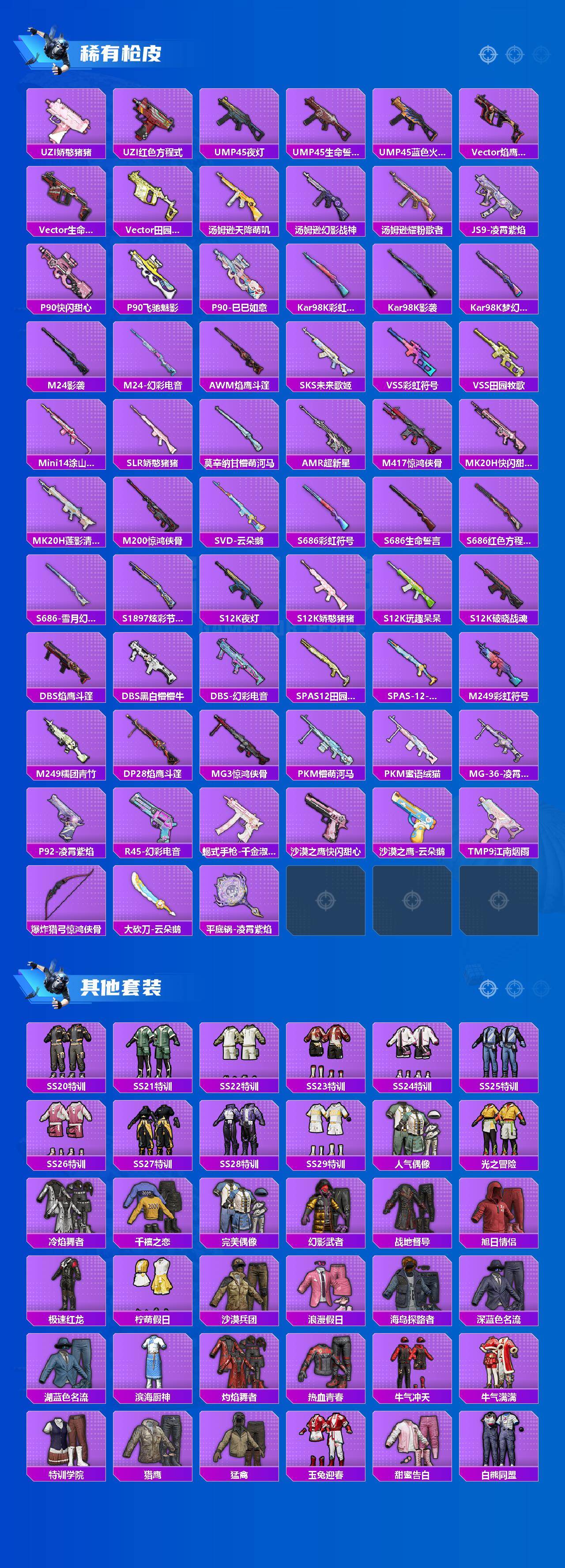 【稀有枪皮】:AKM-彩虹符号,AKM-生命誓言,AKM-破晓战魂,AKM-龙的传人,M16A4-幻世战舞者,SCAR-L-夜灯,SCAR-L-玉兔迎春,SCAR-L-红色方程式,SCAR-L-黄金龙骨,SCAR-L-冷漠罗丽,M416-糯团青竹,M416-红色方程式,M416-绯红前夜,M416-蓝色火焰,GROZA-懵萌河马,GROZA-田园牧歌,GROZA-酷泡奶龙,GROZA-黑色刀锋,AUG-天降萌叽,AUG-耀粉歌者,M762-云朵鹅,G36C-懵萌河马,AC-VAL-天降萌叽,AC-VAL-彩虹甜喵,AC-VAL-快闪甜心,蜜獾-天降萌叽,蜜獾-娇憨猪猪,ARX-凌霄紫焰,UZI-啾咪啾咪,UZI-天降萌叽