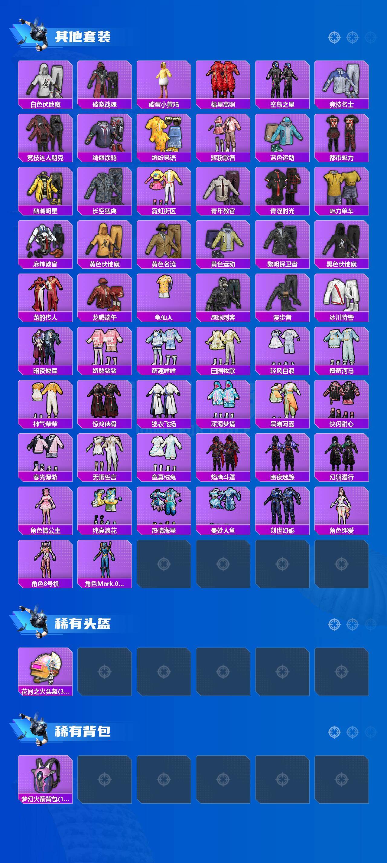 【稀有套装】:套装-龟仙人,套装-雏菊兔兔,套装-萝兰蝴蝶,套装-小熊娃娃,角色-多纳泰罗,套装-糖糖葫芦,套装-青团波波,套装-棉花软糖,角色-都市丽猫,套装-闪电轻猫,套装-粉恋花,套装-紫幽梦,套装-蓝冰羽,套装-星渊小夜曲,套装-霓虹热舞,套装-极速光影,套装-彩虹兔,套装-云朵鹅,套装-雪绒豹,角色-夜瞳黯灵,套装-朱霞炽焰,套装-凌霄紫焰,套装-擎苍青焰