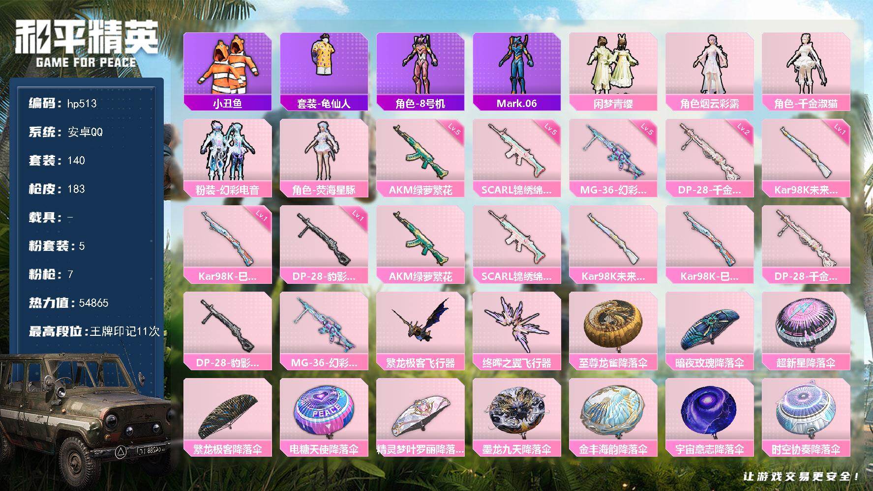 [17261232]安卓 手Q-5粉装-7特效枪-0载具-2粉色飞行器-54865热力值-11王牌印记-140套装-183枪皮