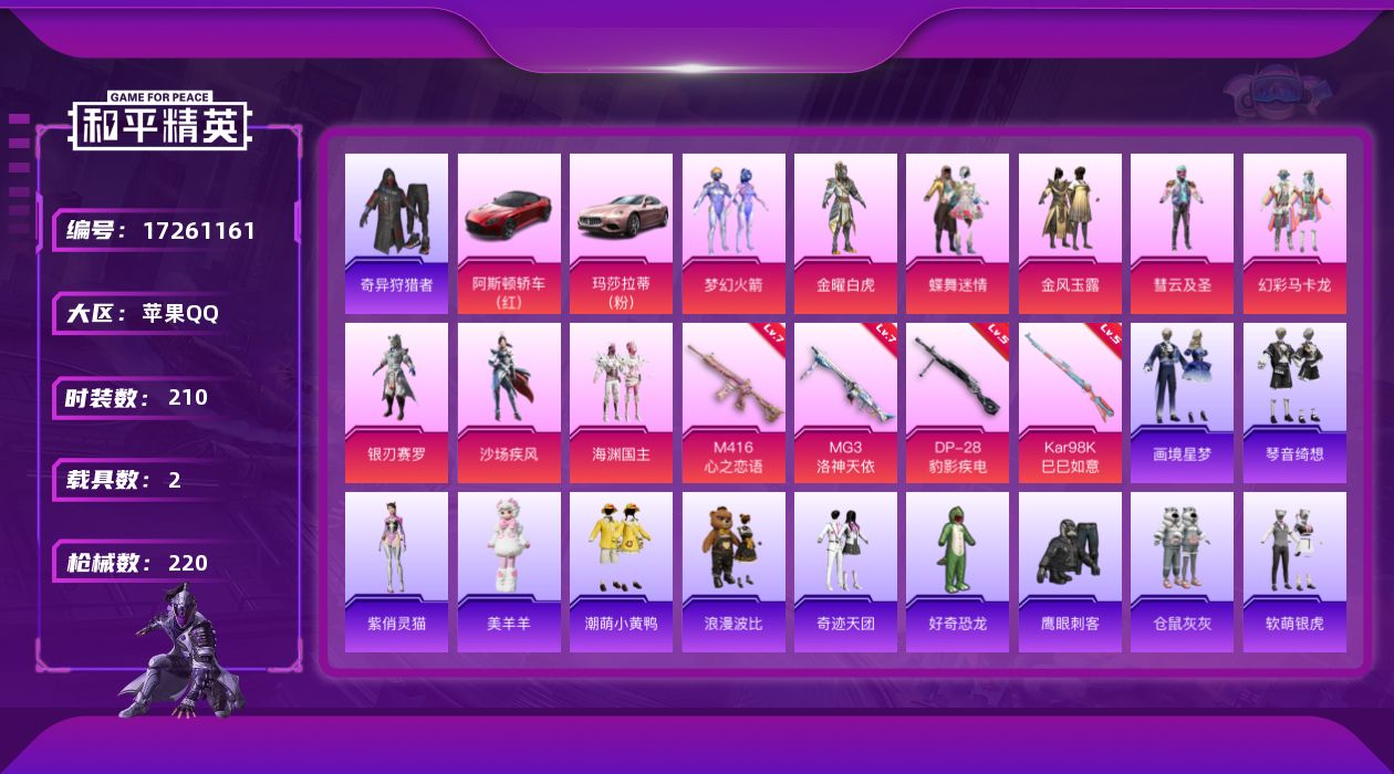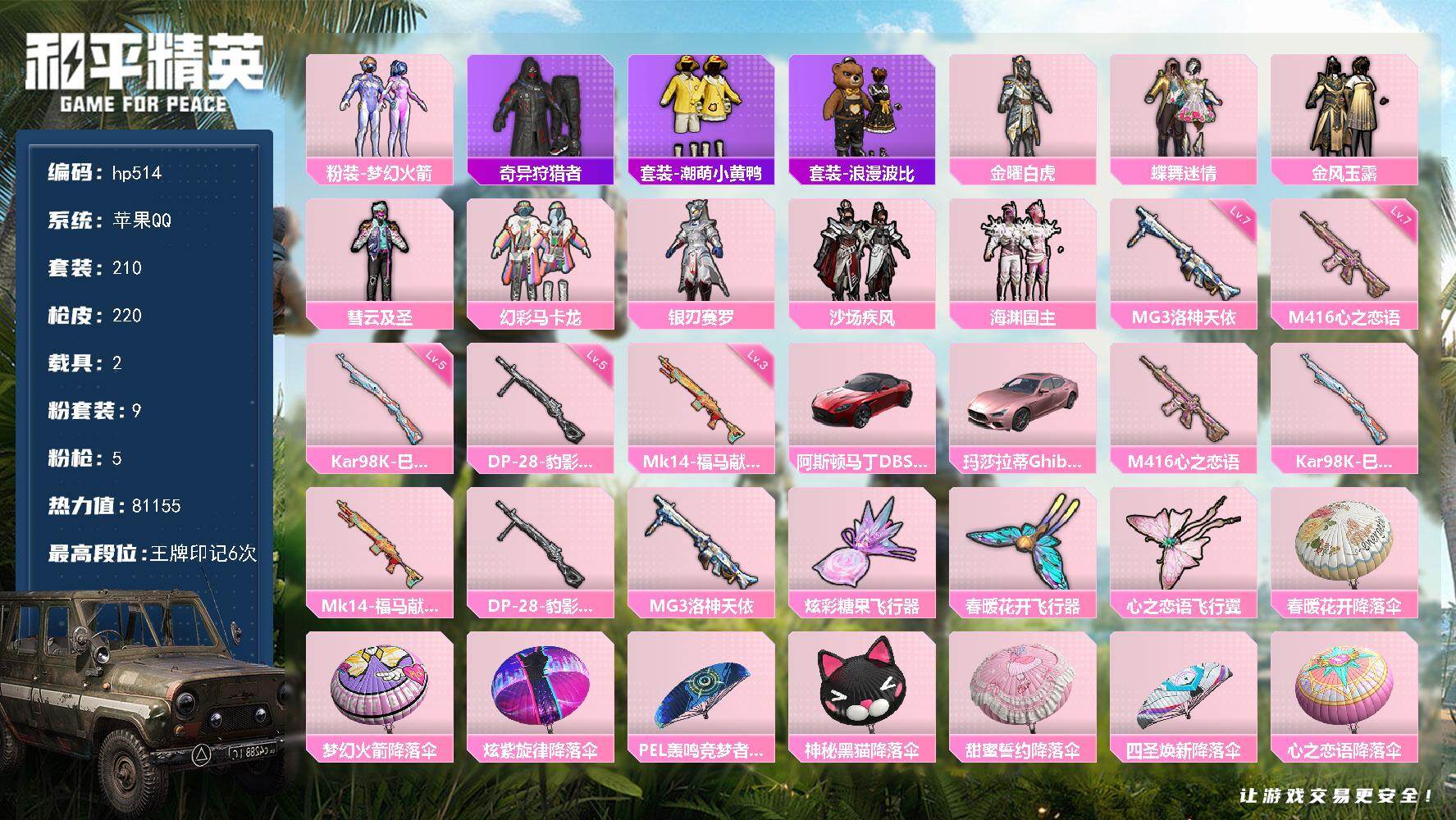 [17261161]苹果 手Q-9粉装-5特效枪-2载具-3粉色飞行器-81155热力值-6王牌印记-210套装-220枪皮 【热门品类】:粉装-梦幻火箭,套装-奇异狩猎者,套装-潮萌小黄鸭,套装-浪漫波比 【粉色套装】:粉装-金曜白虎,粉装-蝶舞迷情,粉装-梦幻火箭,粉装-金风玉露,粉装-彗云及圣,粉装-幻彩马卡龙,粉装-银刃赛罗,粉装-沙场疾风,粉装-海渊国主 【粉色枪皮等级】:M416-心之恋语(七级),Kar98K-巳巳如意(五级),Mk14-福马献瑞(三级),DP-28-豹影疾电(五级),MG3-洛神天依(七级) 【粉色载具】:阿斯顿马丁DBS(红),玛莎拉蒂Ghibli(粉) 【粉色枪皮】:M416-心之恋语,Kar98K-巳巳如意,Mk14-福马献瑞,DP-28-豹影疾电,MG3-洛神天依 【粉色飞行器】:炫彩糖果飞行器,春暖花开飞行器,心之恋语飞行翼 【粉色降落伞】:春暖花开降落伞,梦幻火箭降落伞,炫紫旋律降落伞,PEL轰鸣竞梦者降落伞,神秘黑猫降落伞,甜蜜誓约降落伞,四圣焕新降落伞,心之恋语降落伞,香水柠檬降落伞,怪笑疯兔降落伞,暗夜玫瑰降落伞,洛神天依降落伞,海螺星光降落伞,异瞳寒姬降落伞,极意拳锋降落伞,炫彩糖果降落伞 【稀有套装】:套装-巳巳如意,套装-雪国风尚,套装-炫彩糖果,套装-马上有钱,角色-许七安,玩偶服-美羊羊,角色-紫俏灵猫,套装-画境星梦,套装-琴音绮想,套装-雨过天青,套装-红釉青花 【稀有枪皮】:AKM-四圣焕新,AKM-夜灯,AKM-春暖花开,AKM-破晓战魂,AKM-锦绣火鲤,AKM-霓虹街区,AKM-龙的传人,M16A4-机械英豪,SCAR-L-夜灯,SCAR-L-炫彩节奏,SCAR-L-玉兔迎春,SCAR-L-玫瑰恋情,SCAR-L-红色方程式,SCAR-L-黄金龙骨,M416-仓鼠灰灰,M416-蓝色火焰,GROZA-异彩先驱,GROZA-影袭,GROZA-春暖花开,GROZA-治愈之星,GROZA-马卡龙,GROZA-黑色刀锋,AUG-灵符少年,QBZ-原初圣火,QBZ-彩虹符号,QBZ-洛神天依,QBZ-飞驰魅影,M762-天降萌叽,M762-奇异狩猎者,M762-拳皇97,M762-潮萌小黄鸭,M762-牛气冲天,M762-瑞龙福将,M762-镭射皇者,Mk47-天之羽翼,Mk47-洛神天依,G36C-金风玉露,蜜獾-天降萌