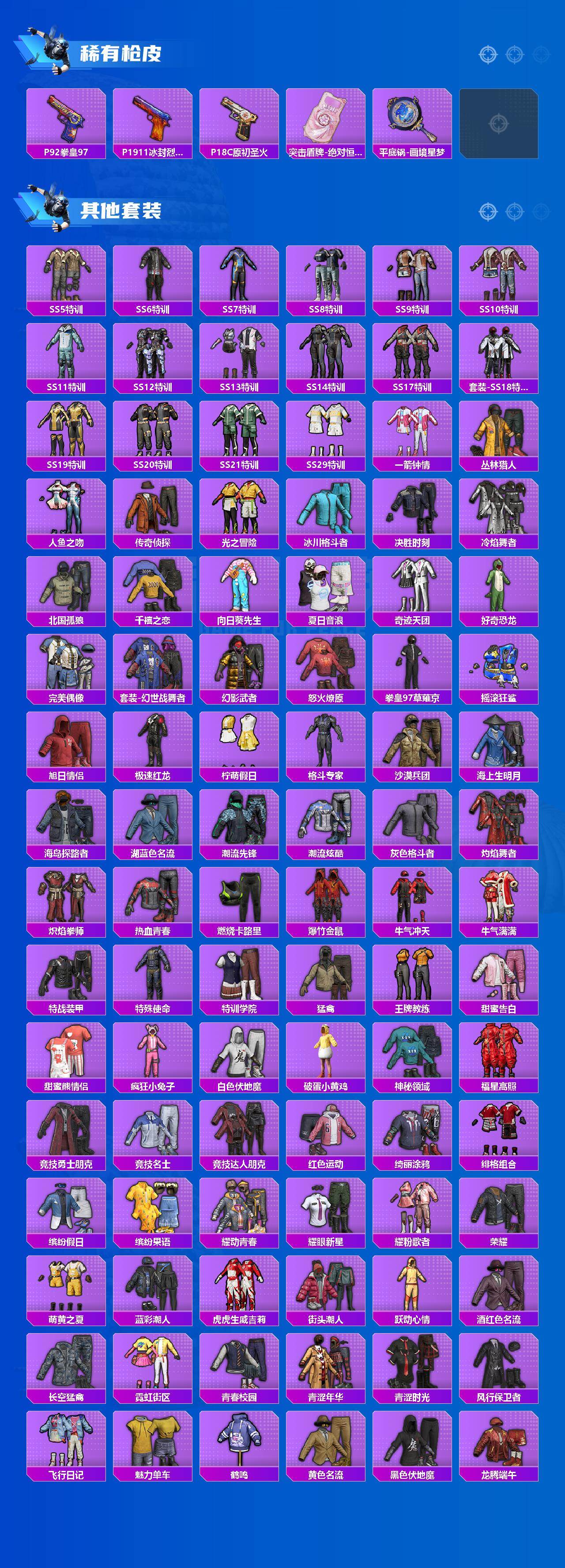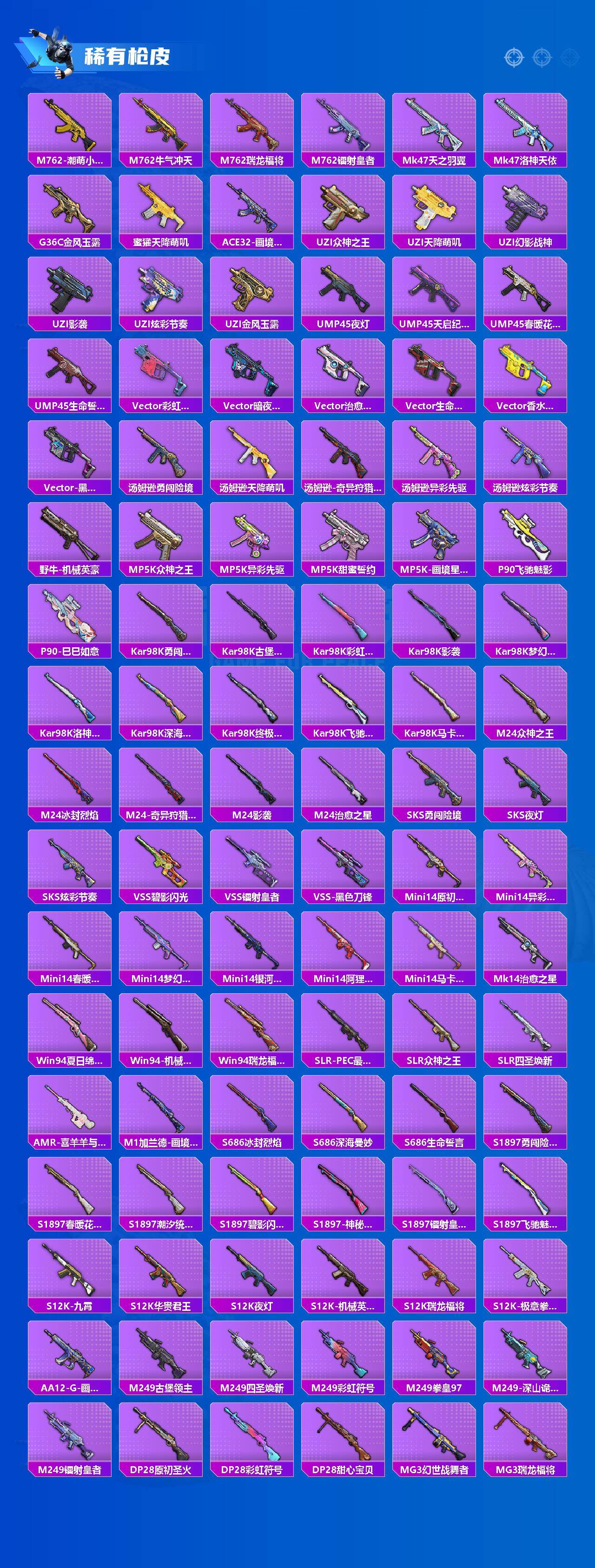 【稀有枪皮】:AKM-四圣焕新,AKM-夜灯,AKM-春暖花开,AKM-破晓战魂,AKM-锦绣火鲤,AKM-霓虹街区,AKM-龙的传人,M16A4-机械英豪,SCAR-L-夜灯,SCAR-L-炫彩节奏,SCAR-L-玉兔迎春,SCAR-L-玫瑰恋情,SCAR-L-红色方程式,SCAR-L-黄金龙骨,M416-仓鼠灰灰,M416-蓝色火焰,GROZA-异彩先驱,GROZA-影袭,GROZA-春暖花开,GROZA-治愈之星,GROZA-马卡龙,GROZA-黑色刀锋,AUG-灵符少年,QBZ-原初圣火,QBZ-彩虹符号,QBZ-洛神天依,QBZ-飞驰魅影,M762-天降萌叽,M762-奇异狩猎者,M762-拳皇97,M762-潮萌小黄鸭,M762-牛气冲天,M762-瑞龙福将,M762-镭射皇者,Mk47-天之羽翼,Mk47-洛神天依,G36C-金风玉露,蜜獾-天降萌